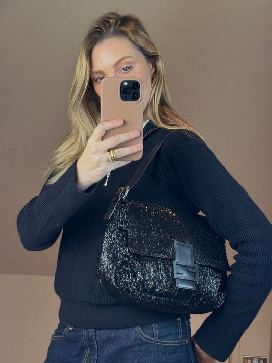 Vintage Fendi Mamma Baguette Black Sequin Shoulder Bag
