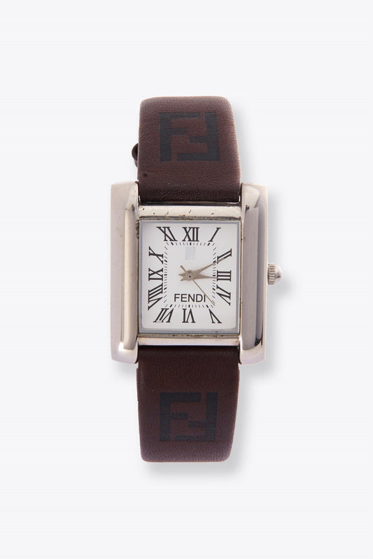 Vintage Fendi Silver Plated Watch with Brown and Black Leather Strap