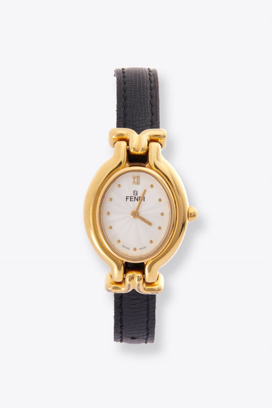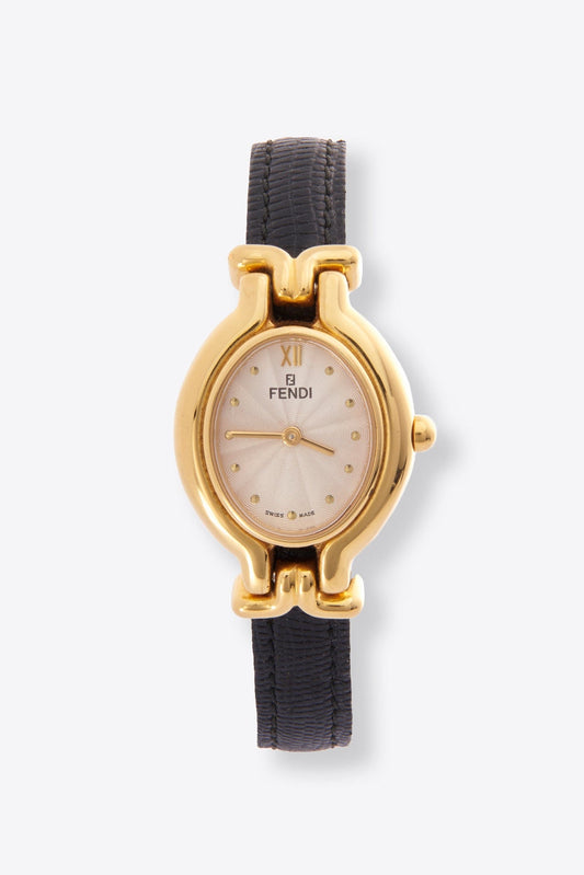 Vintage Fendi Gold Plated Watch with Black Croc Leather Strap