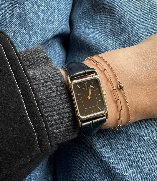 Vintage YSL Gold und silbertplattierte Uhr mit schwarzem Lederband