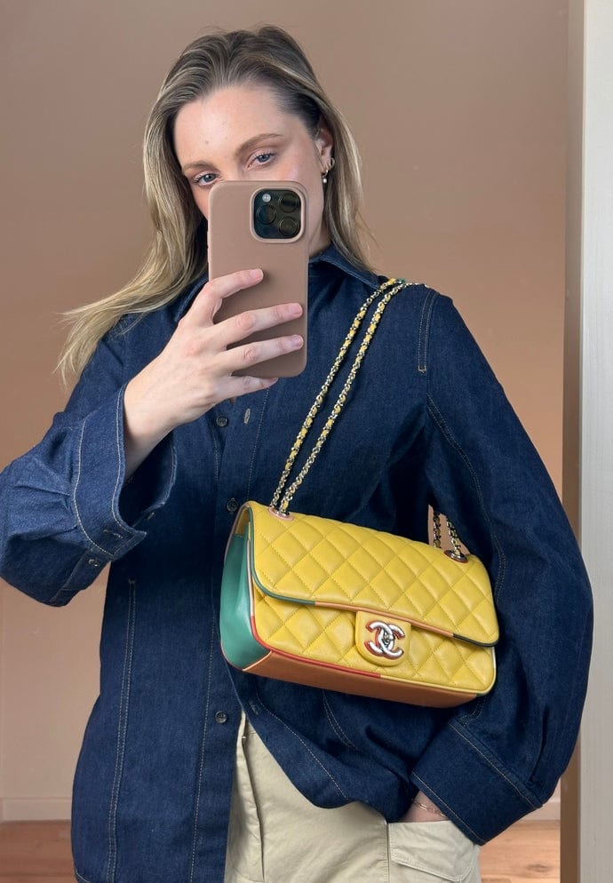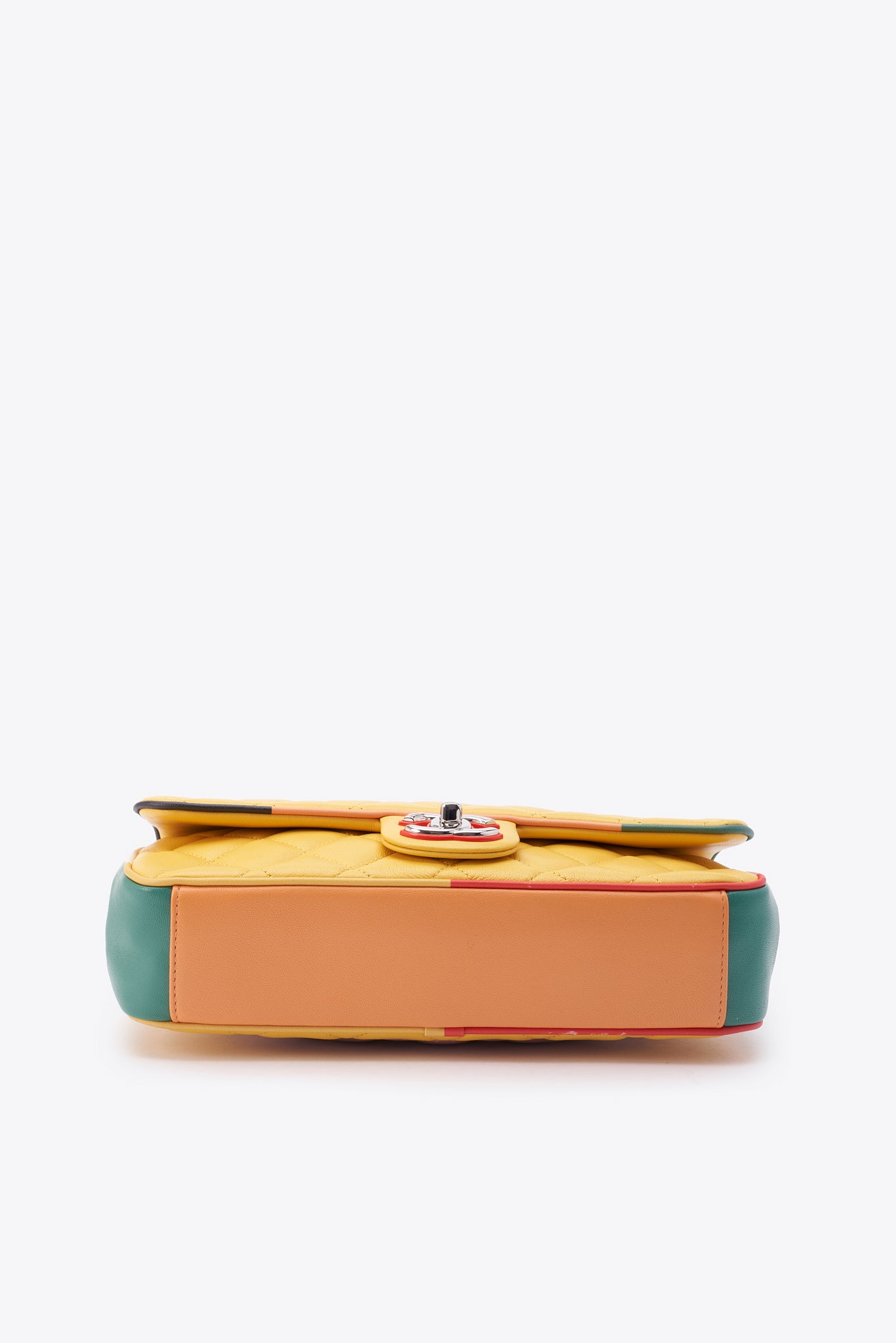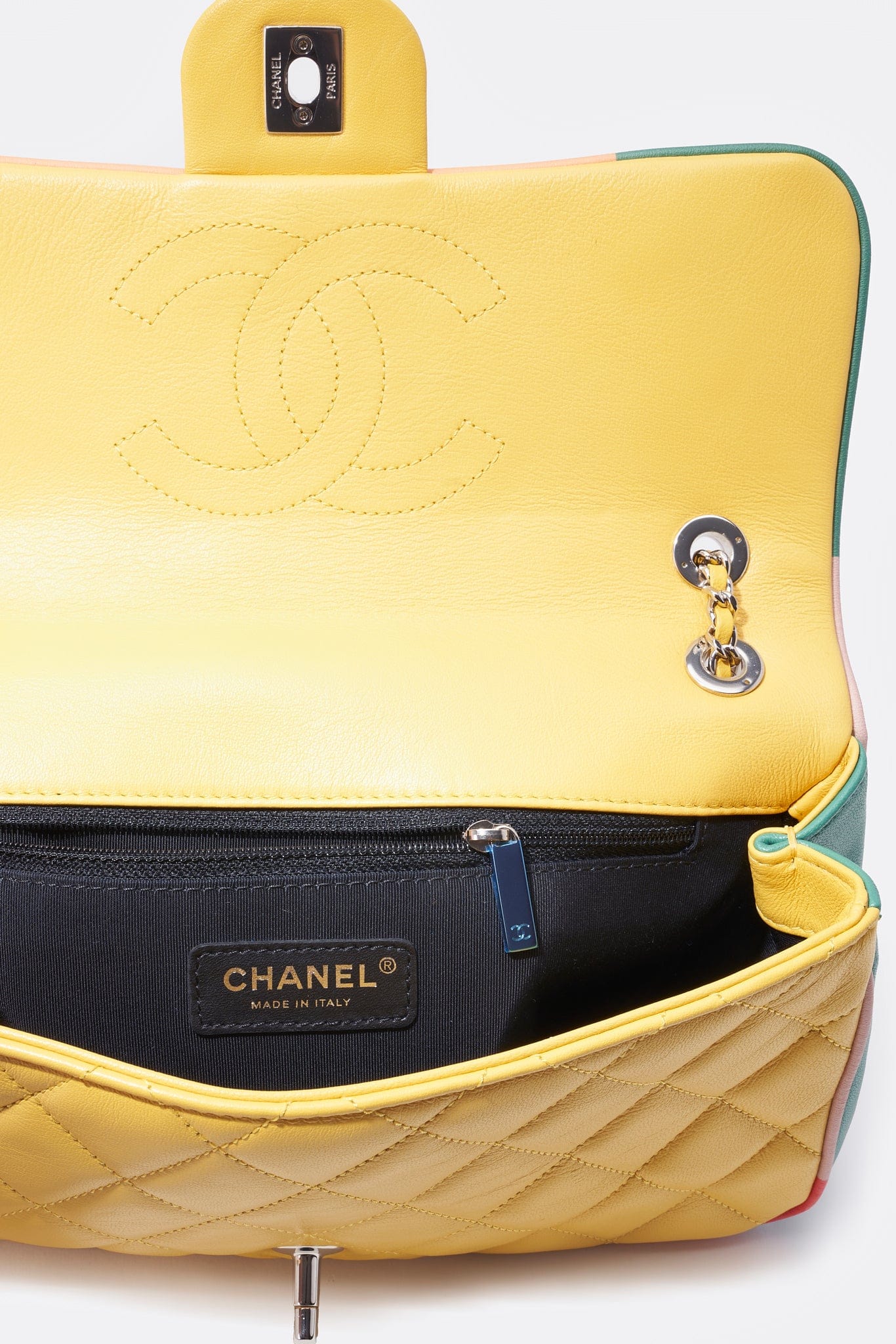 Nach der gefragten Kreuzfahrtkollektion von Chanel 2017 lässt diese spielerische Neuinterpretation der klassischen Klappe von der lebendigen Energie von Havanna inspiriert. In Sonnenschein gelber Lambskin mit Kontrastverkleidung in grün, orange, rosa und rot gefertigt und fängt den Geist der kühnen Palette und des freudigen Stylings von Kuba ein.