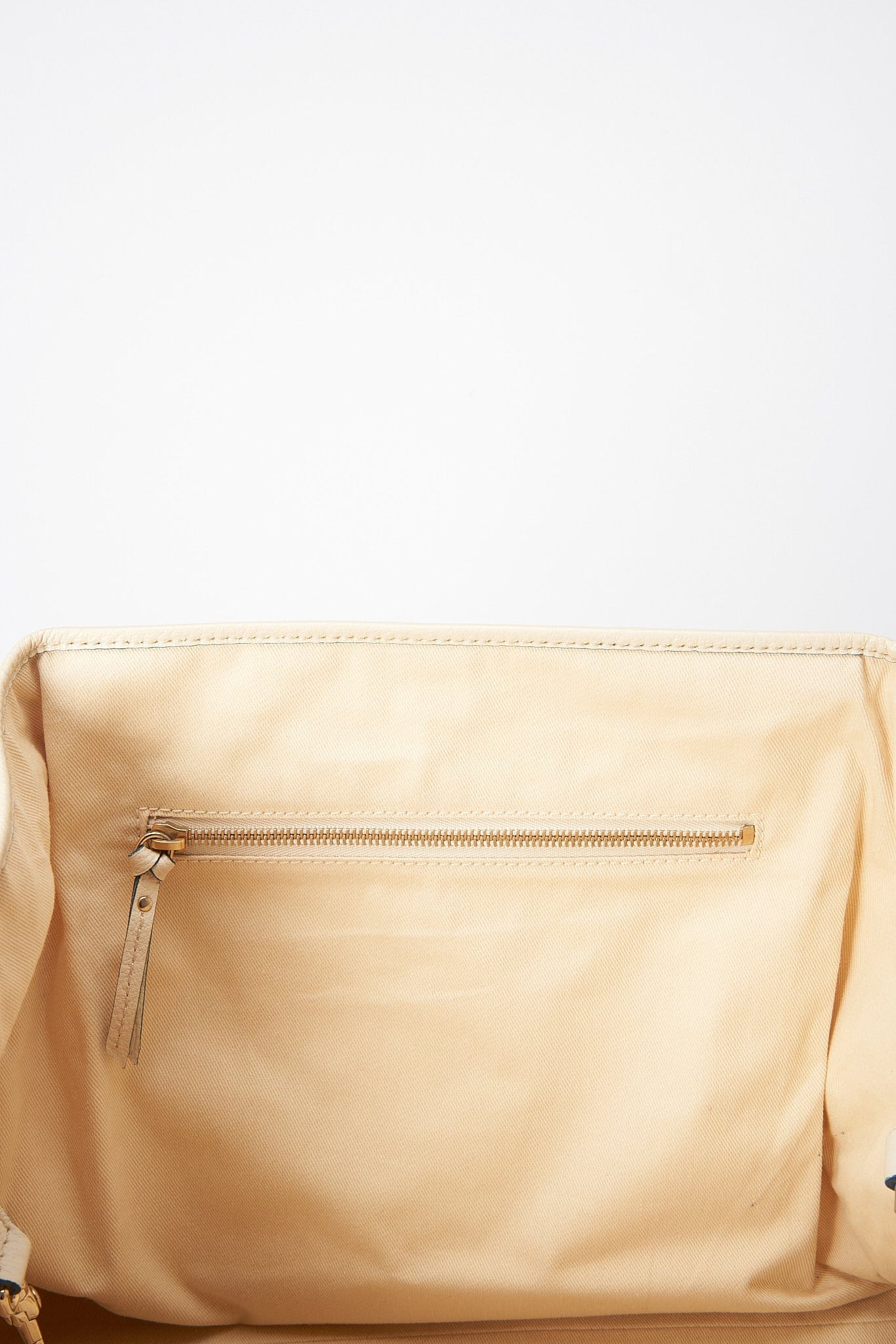 Im Inneren hat diese Tasche eine Creme -Baumwollfutter und es gibt eine Reißverschluss in der Tasche, in der Sie organisiert sind.