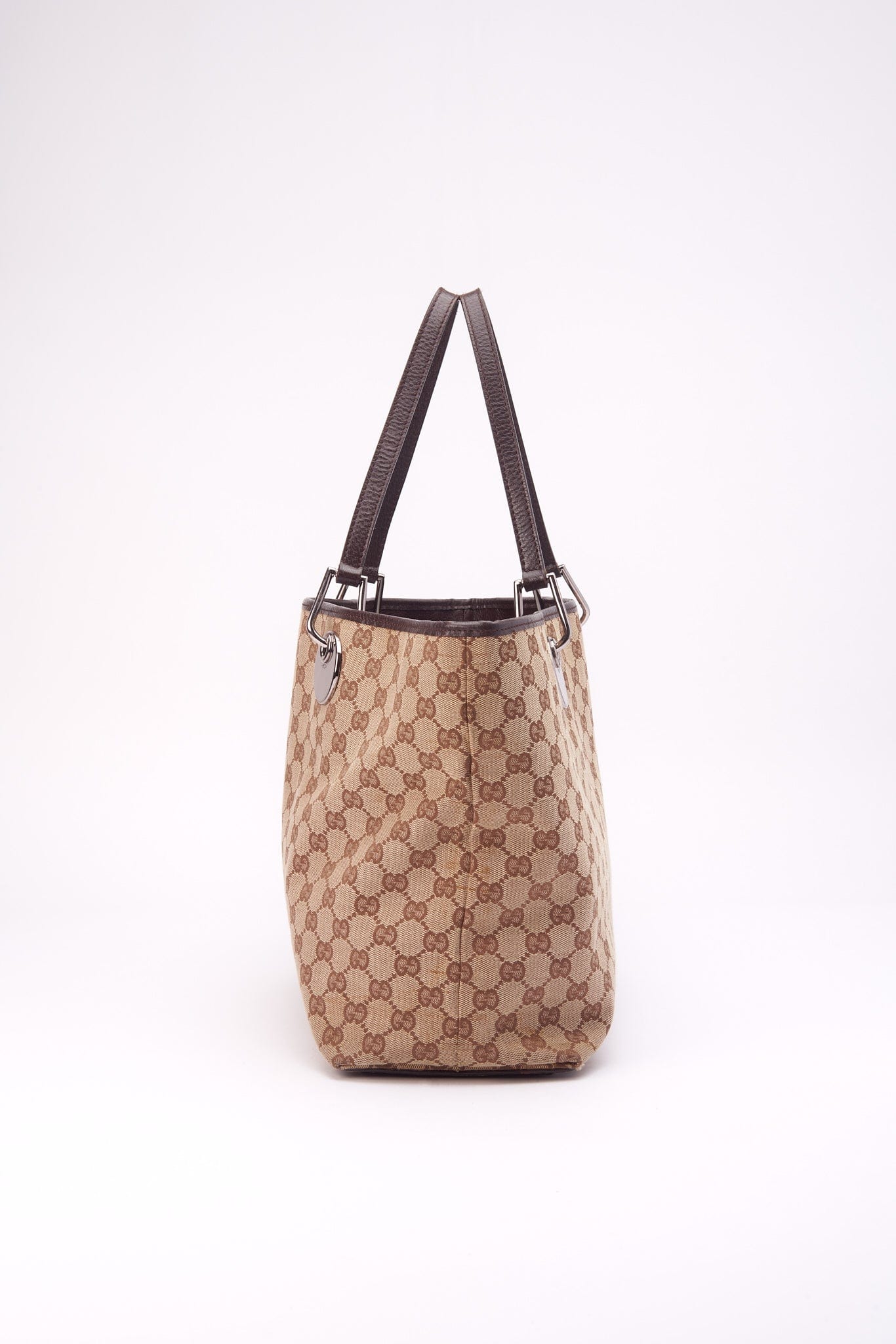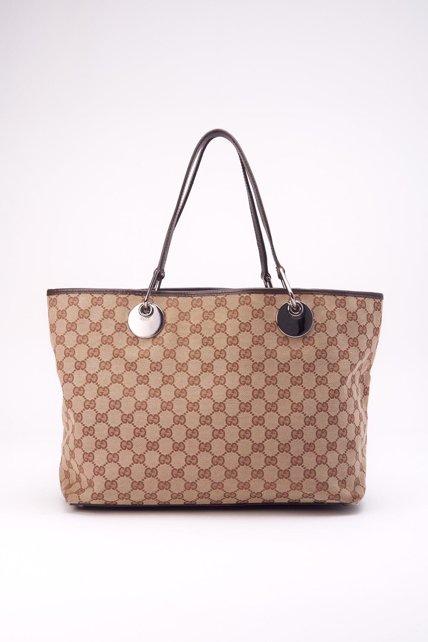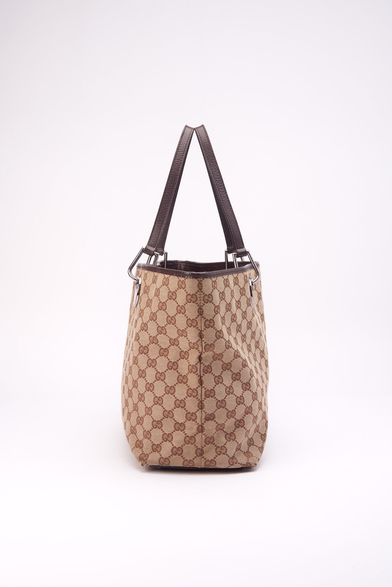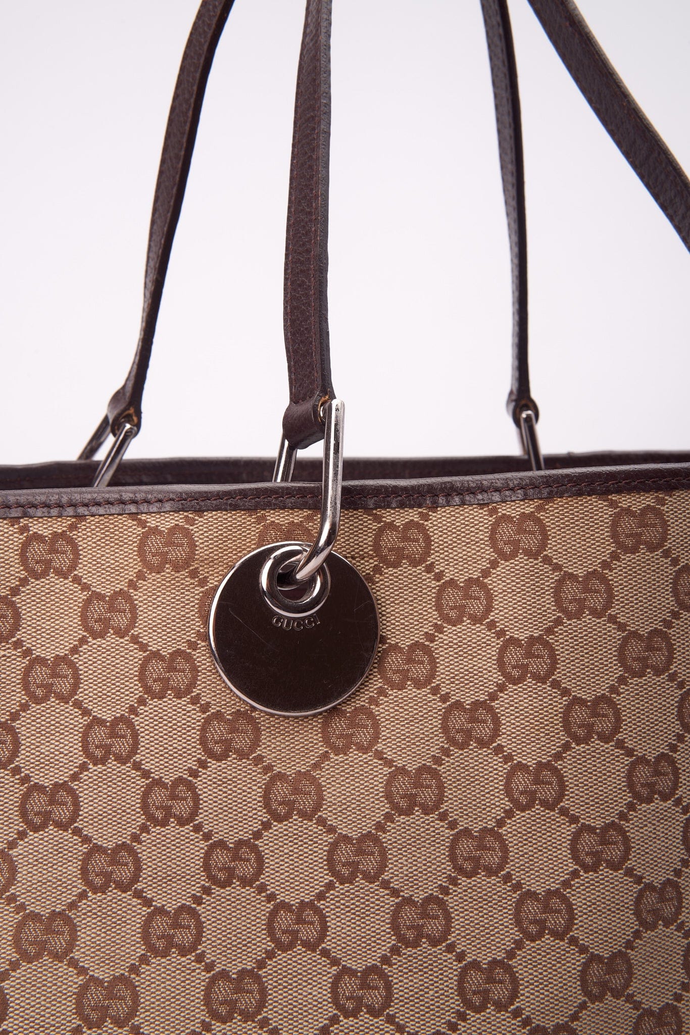 Eine atemberaubende Vintage -Gucci -Einkaufstasche aus der legendären GG -Beige -Leinwand mit braunem Lederverkleid und Silberhardware mit Gucci -Marke.