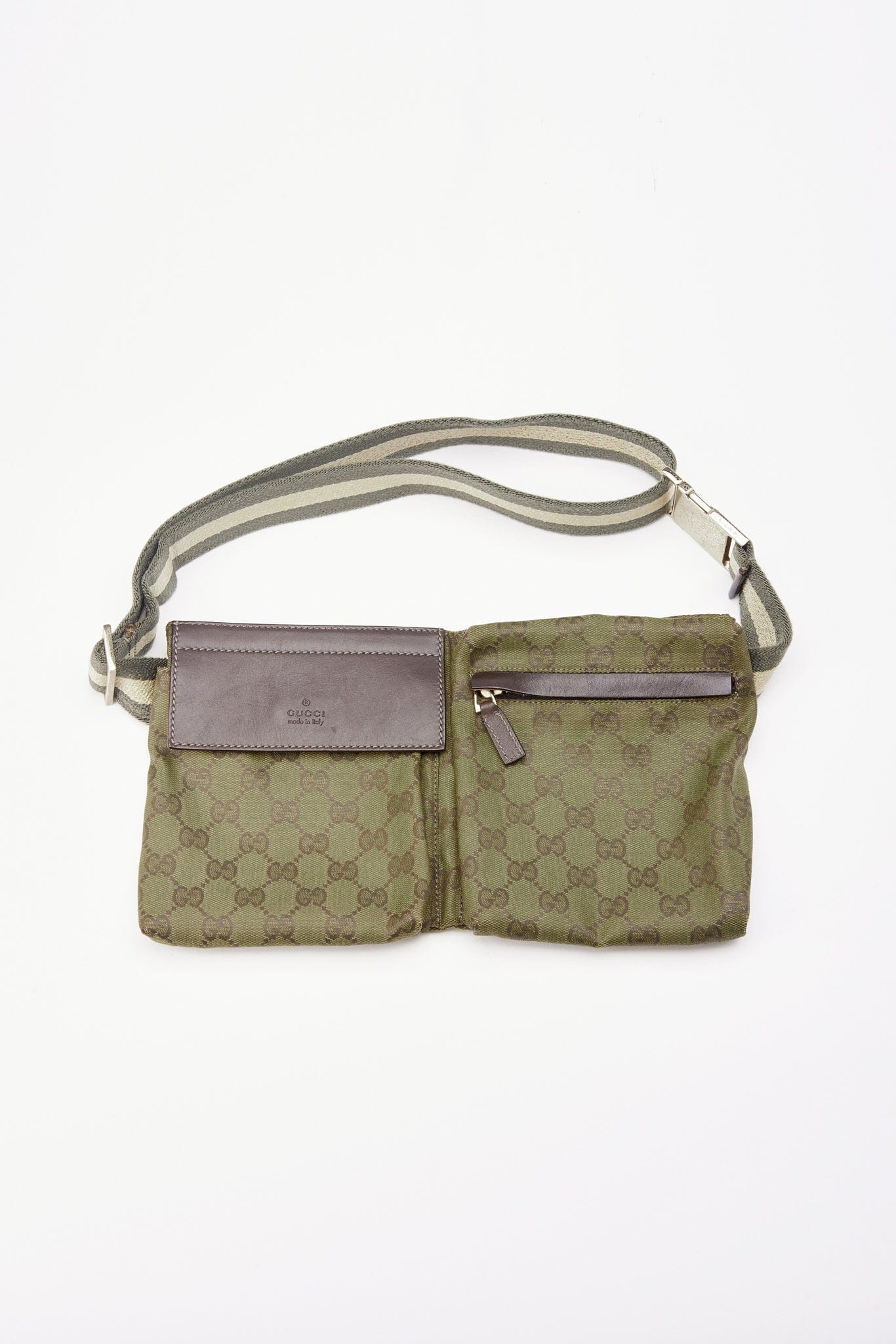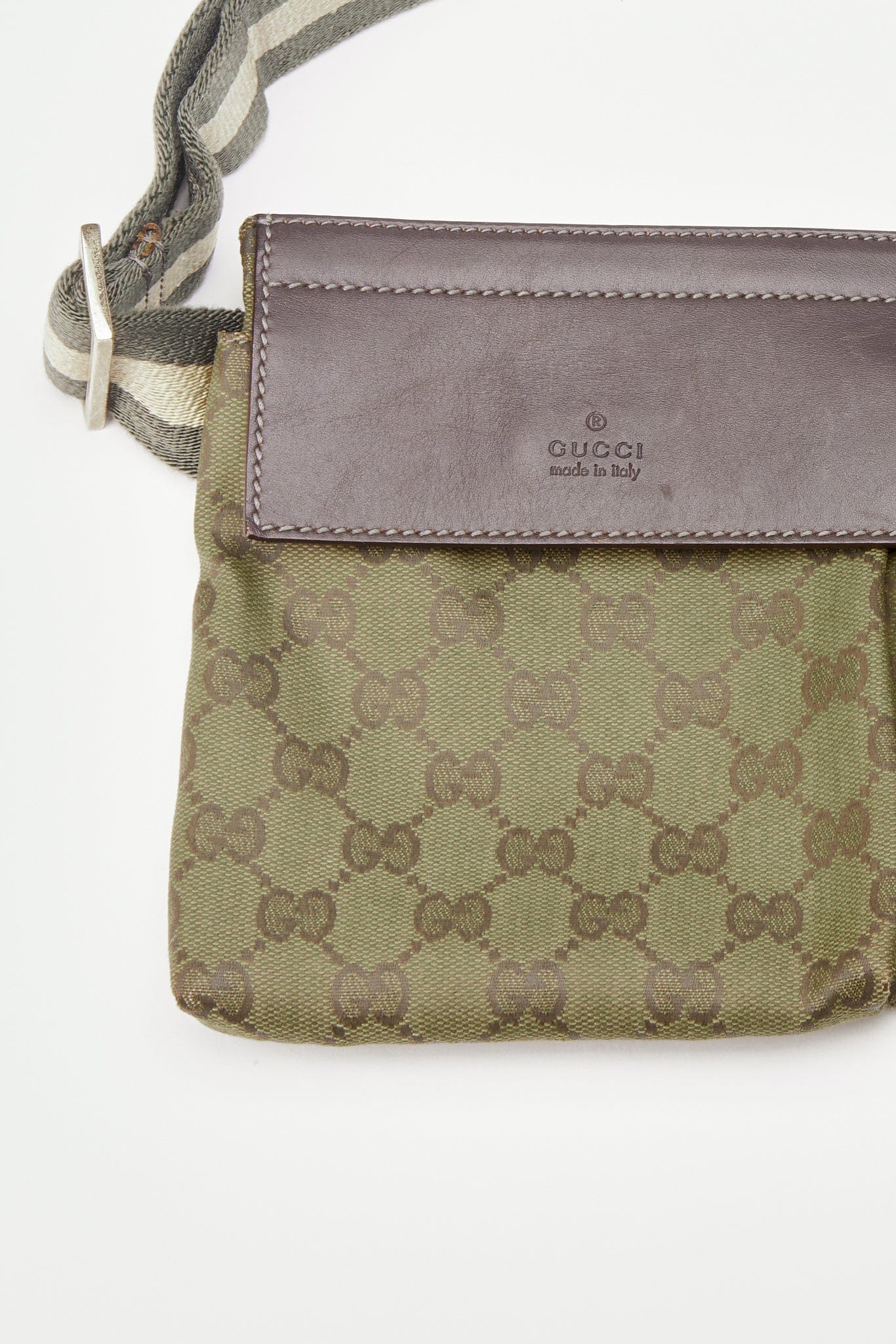 Ein atemberaubender Vintage -Gucci -Gürtel oder Schlingenbeutel aus einer grünen GG -Leinwand mit Gurtband und braunem Lederverkleid.