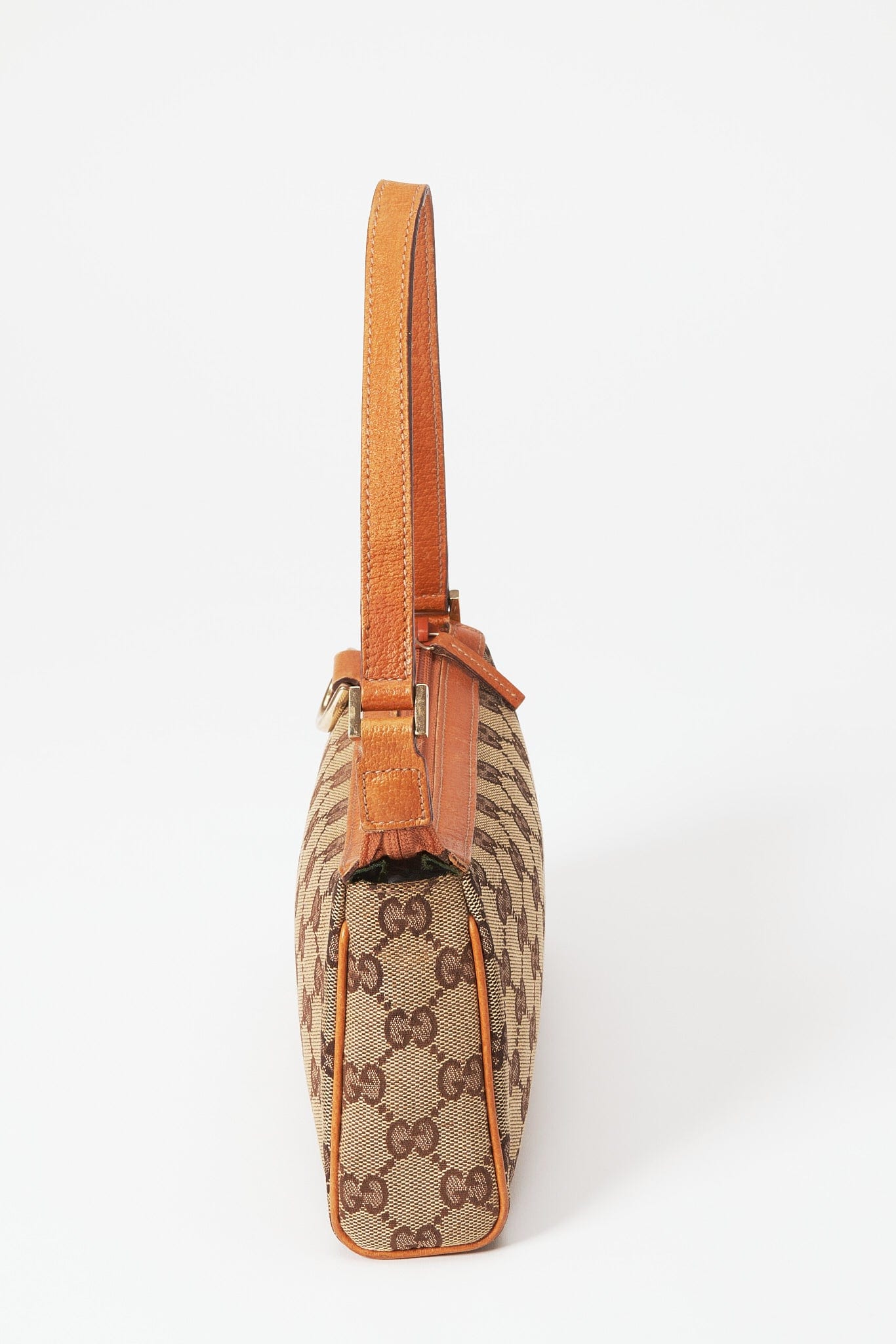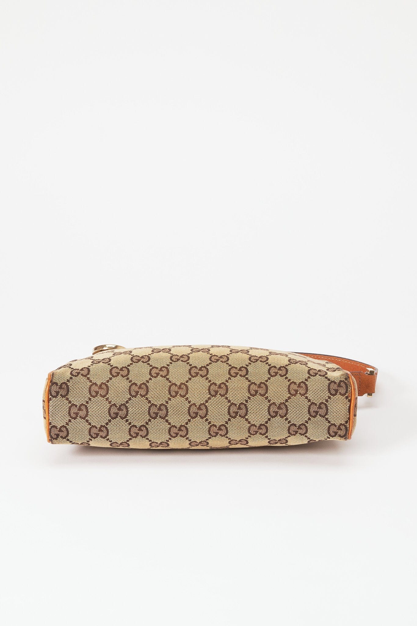 Eine atemberaubende Vintage Gucci Pochette -Umhängetasche aus der legendären GG -Beige -Leinwand mit brauner Lederverkleidung und goldener Gucci -Goldhardware.