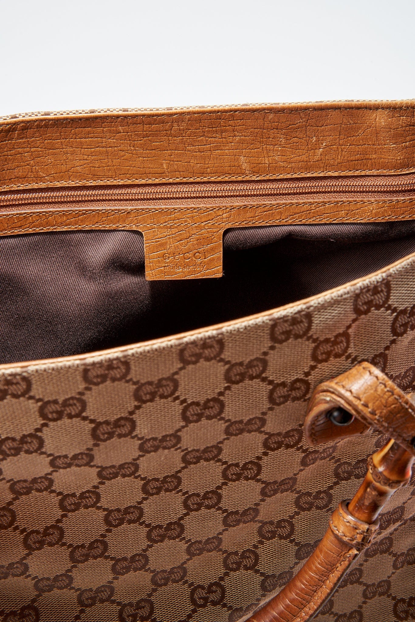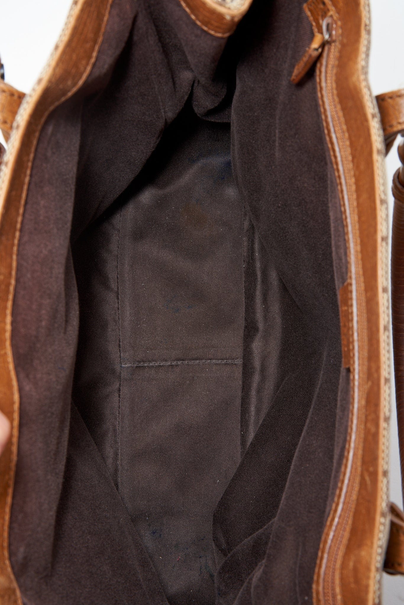 In der Tasche befindet sich eine braune Baumwollfutter mit inneren Reißverschluss -Taschen für Ihre Wertsachen.