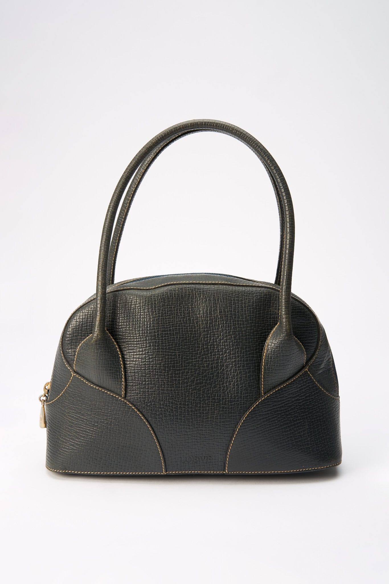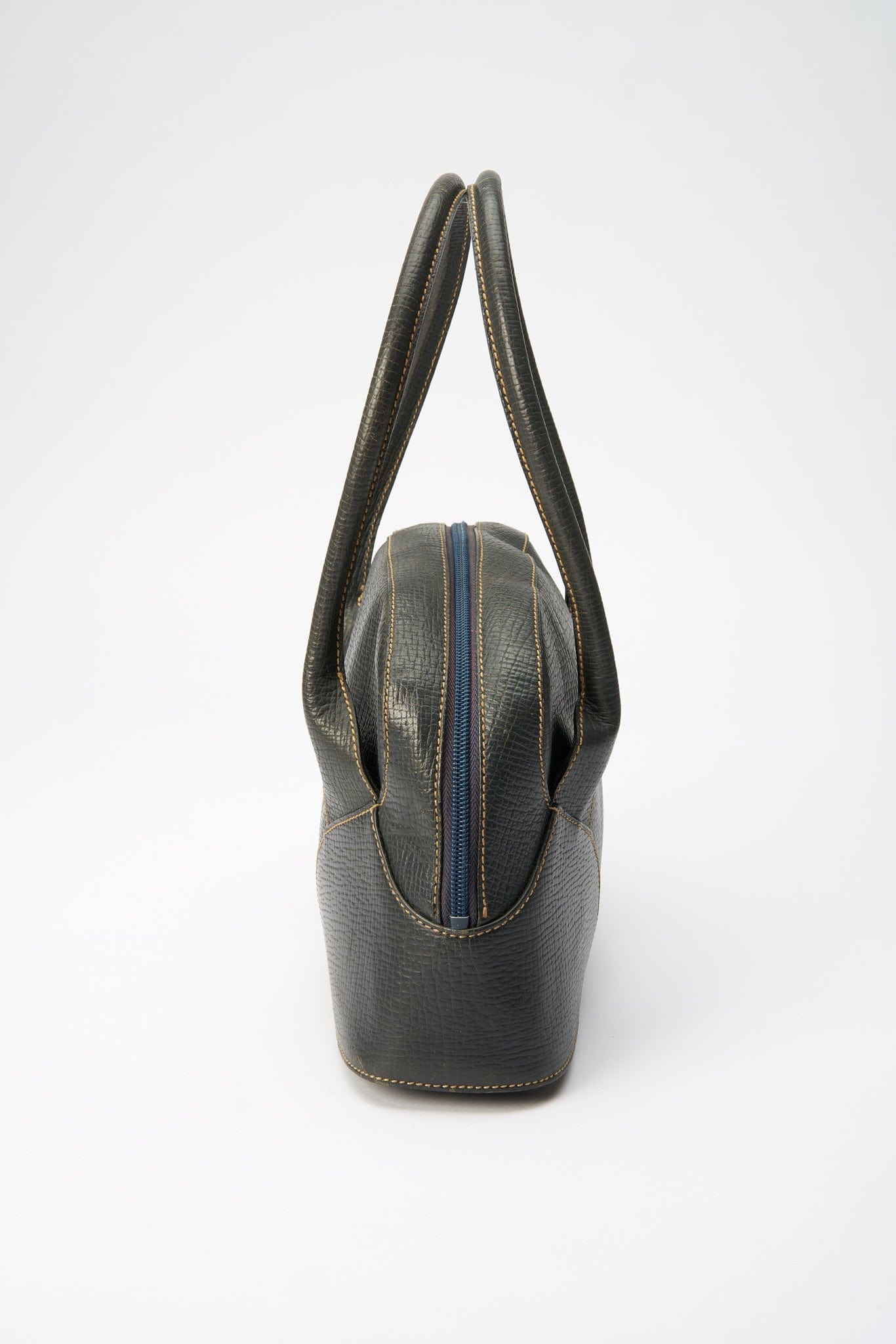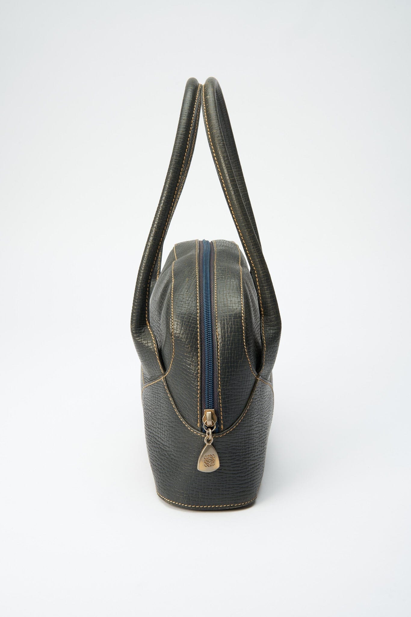 Eine zeitlose Vintage Loewe -Einkaufstasche, die aus einem strukturierten blau/grauen Leder mit goldener Hardware aus Loewe -Marke hergestellt wurde.