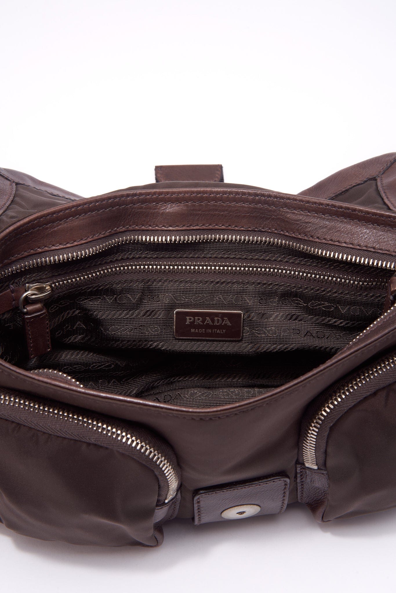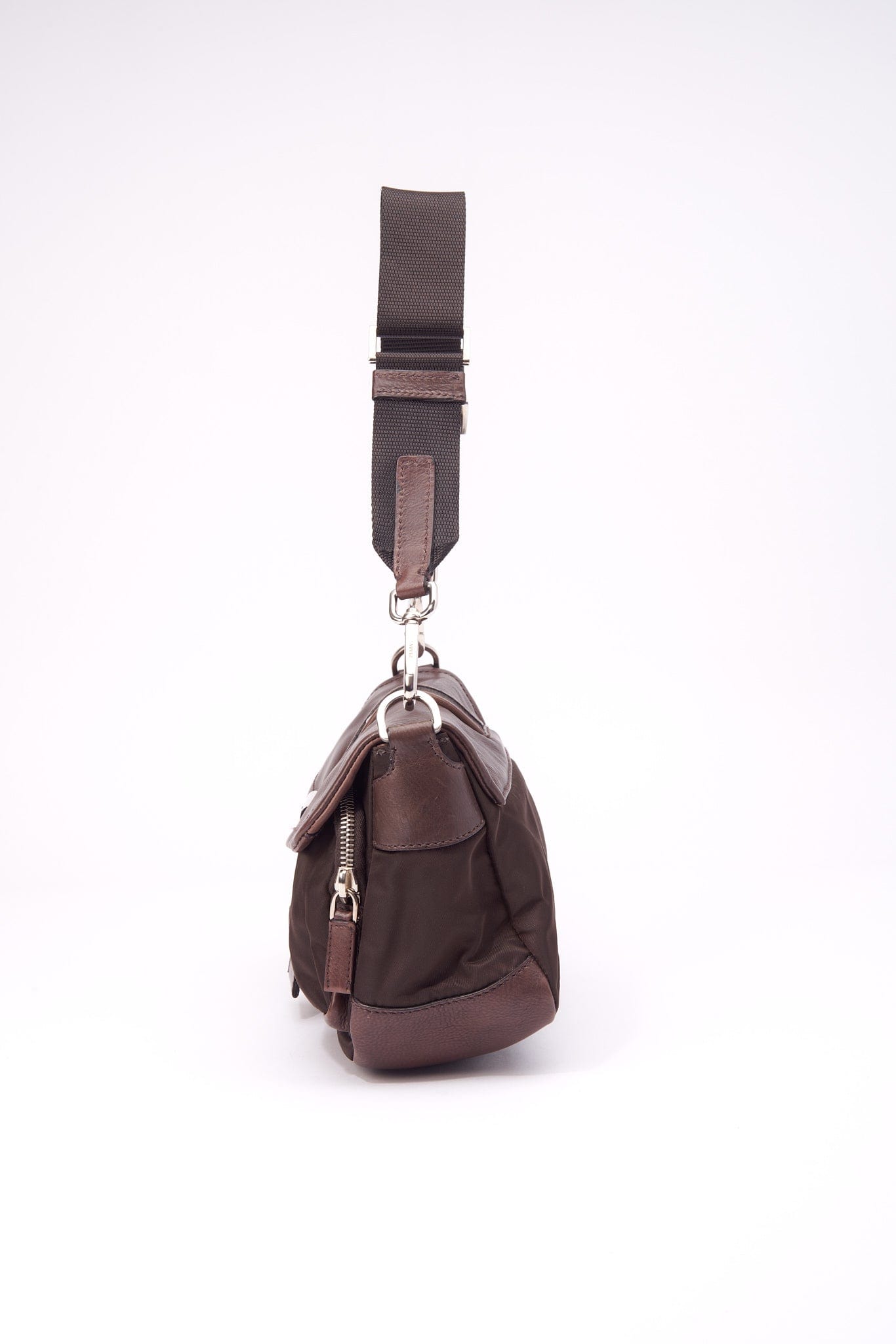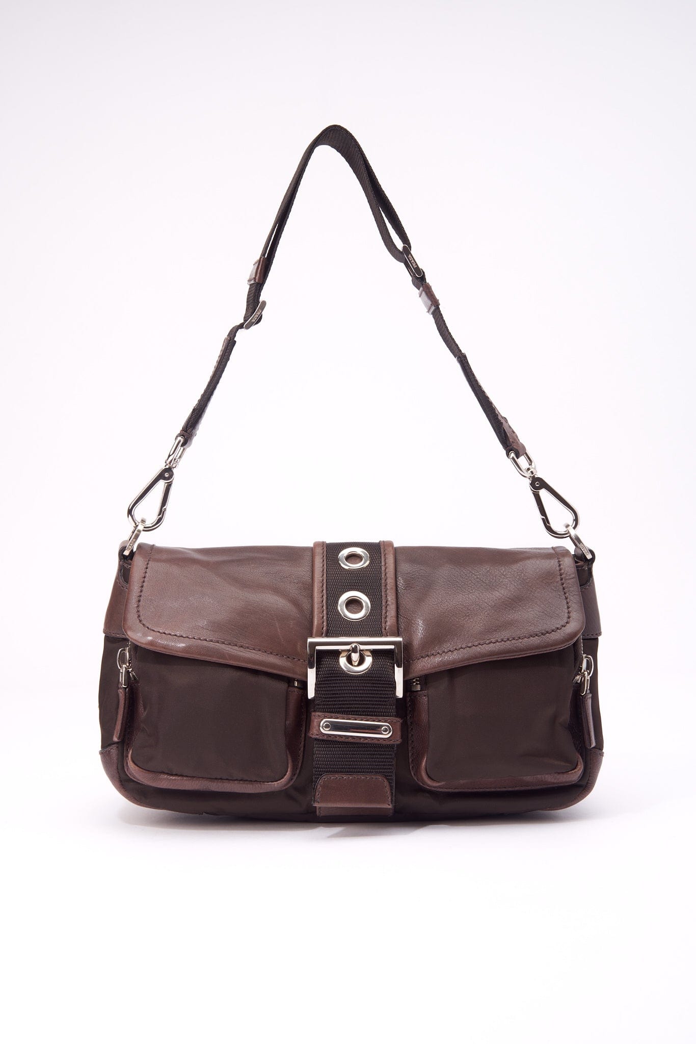 Eine super coole Prada -Umhängetasche aus braunem Leder, braunem Nylon und Gurtgurt.