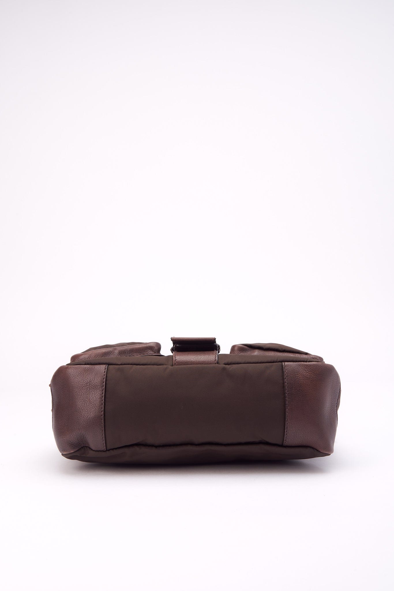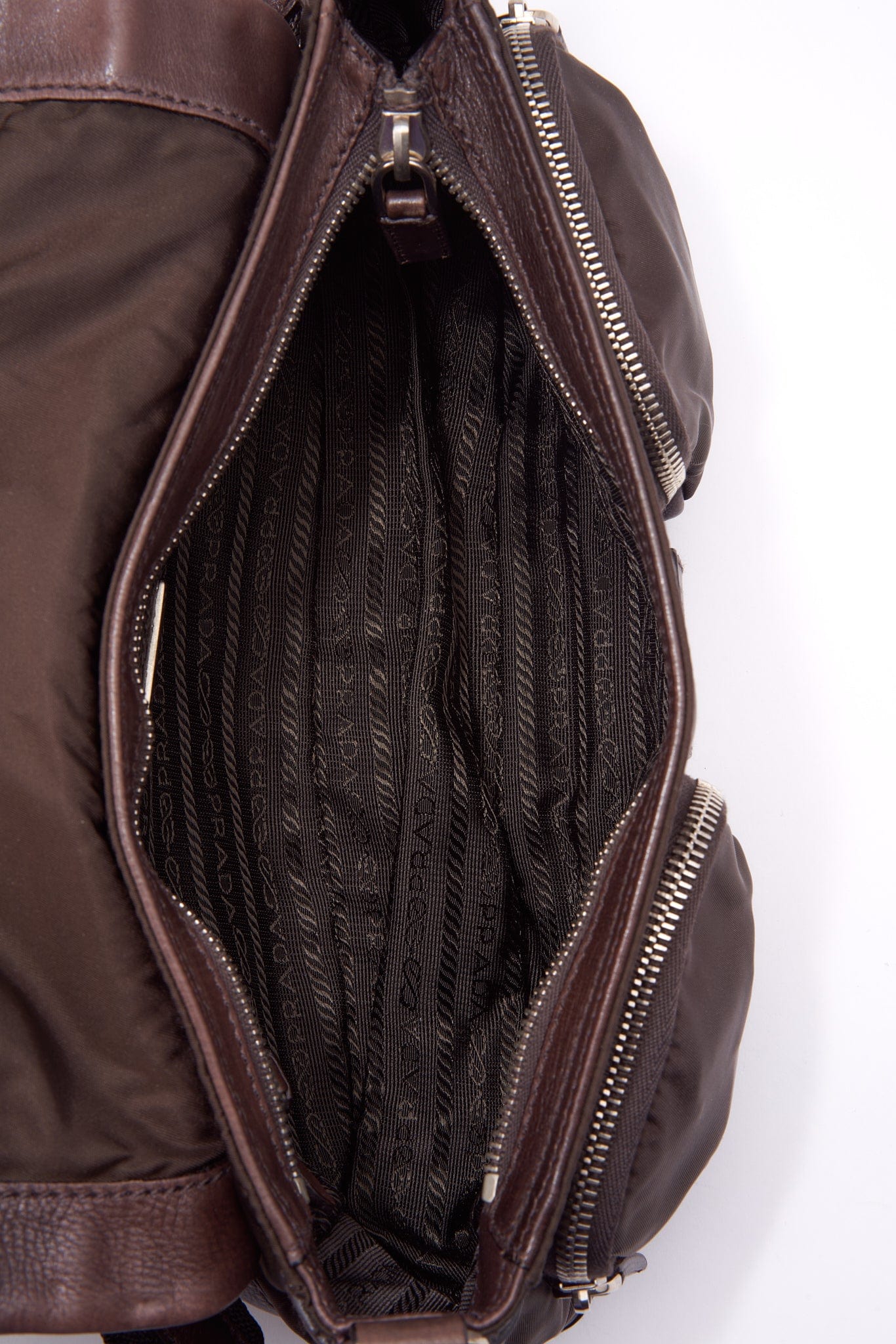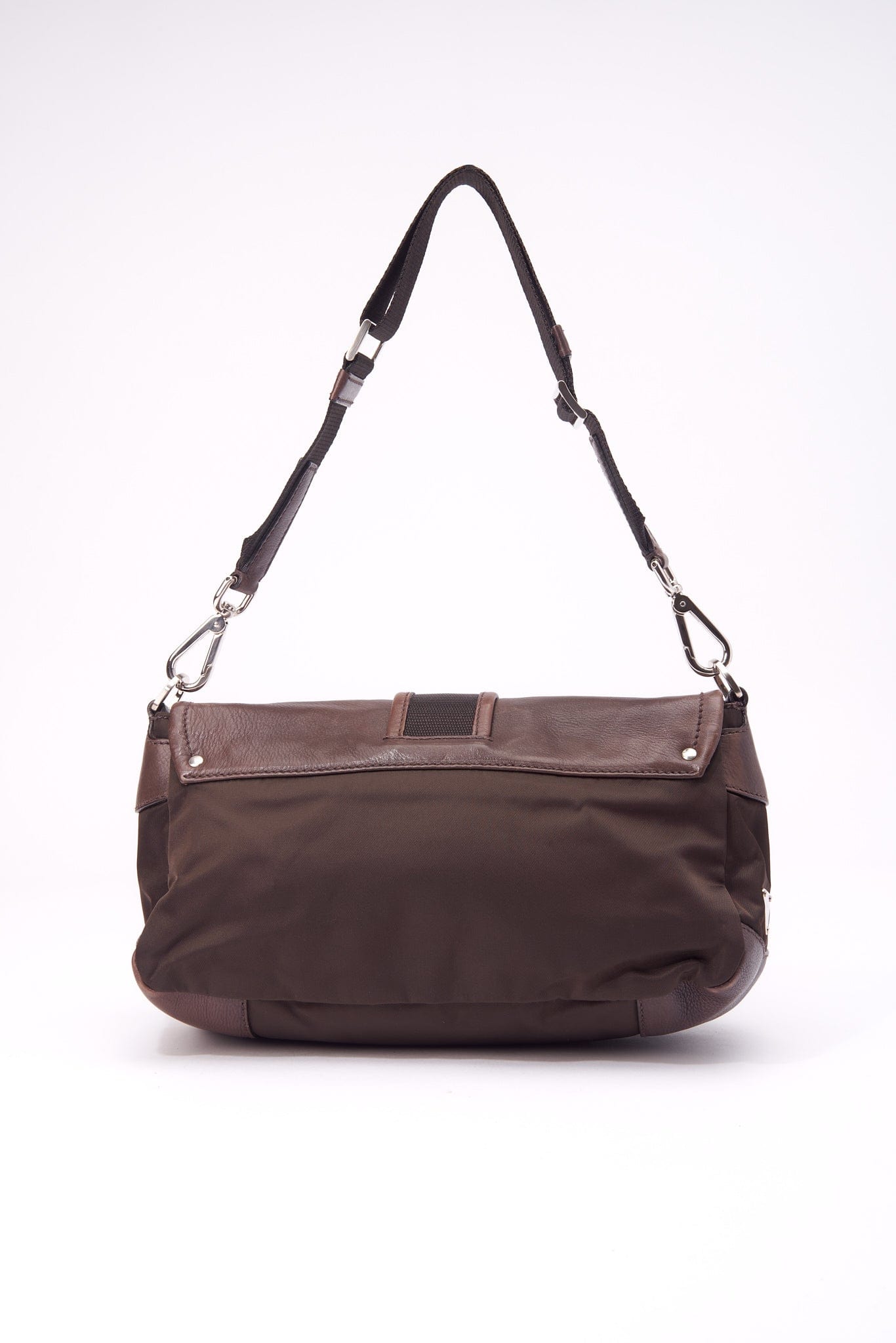 Eine super coole Prada -Umhängetasche aus braunem Leder, braunem Nylon und Gurtgurt.