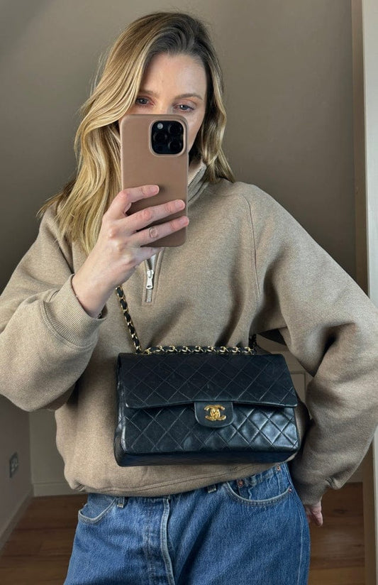 Vintage Chanel Classic Double Flap Bag Medium Black Lambskin Leather With 24k Gold Plated Hardware