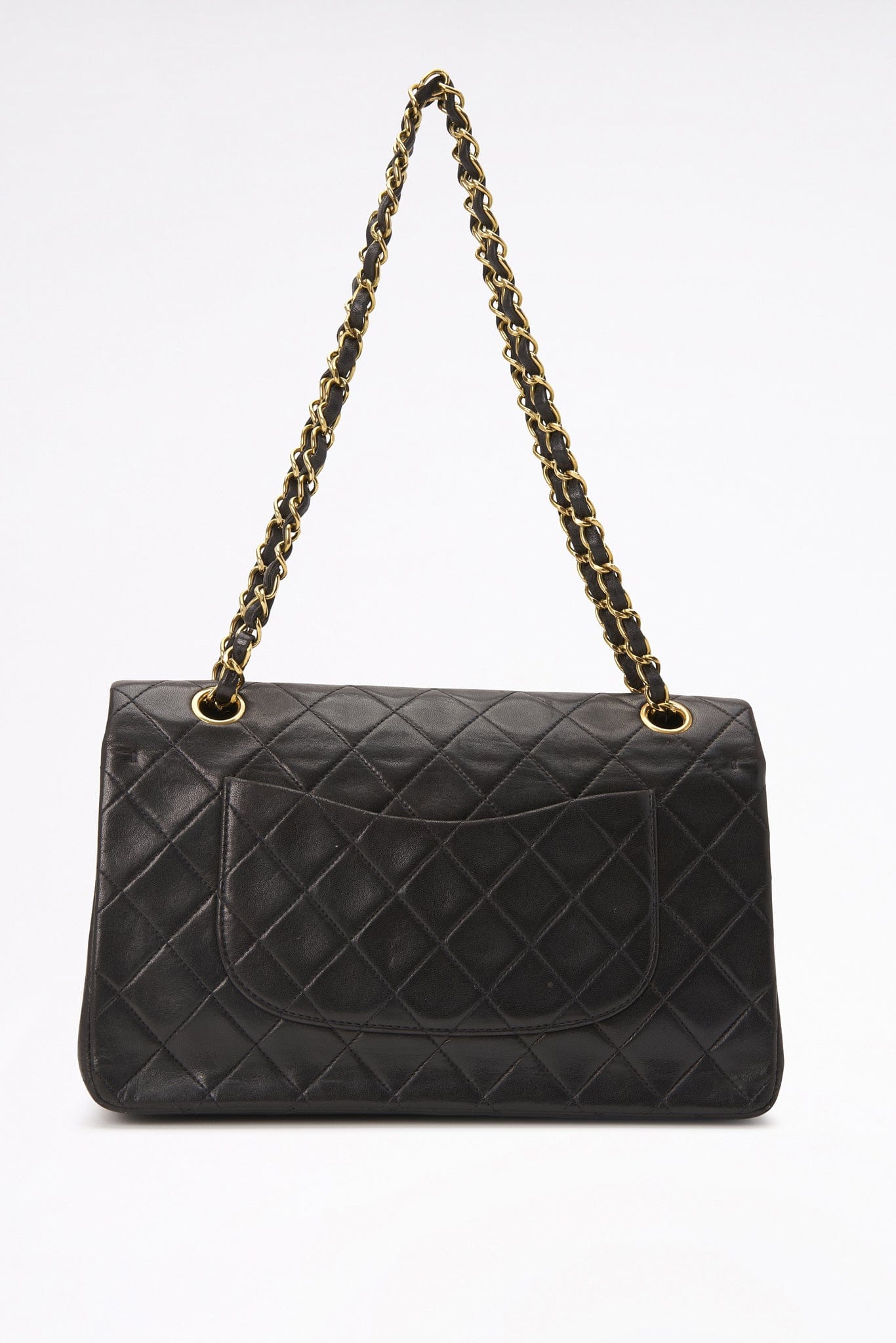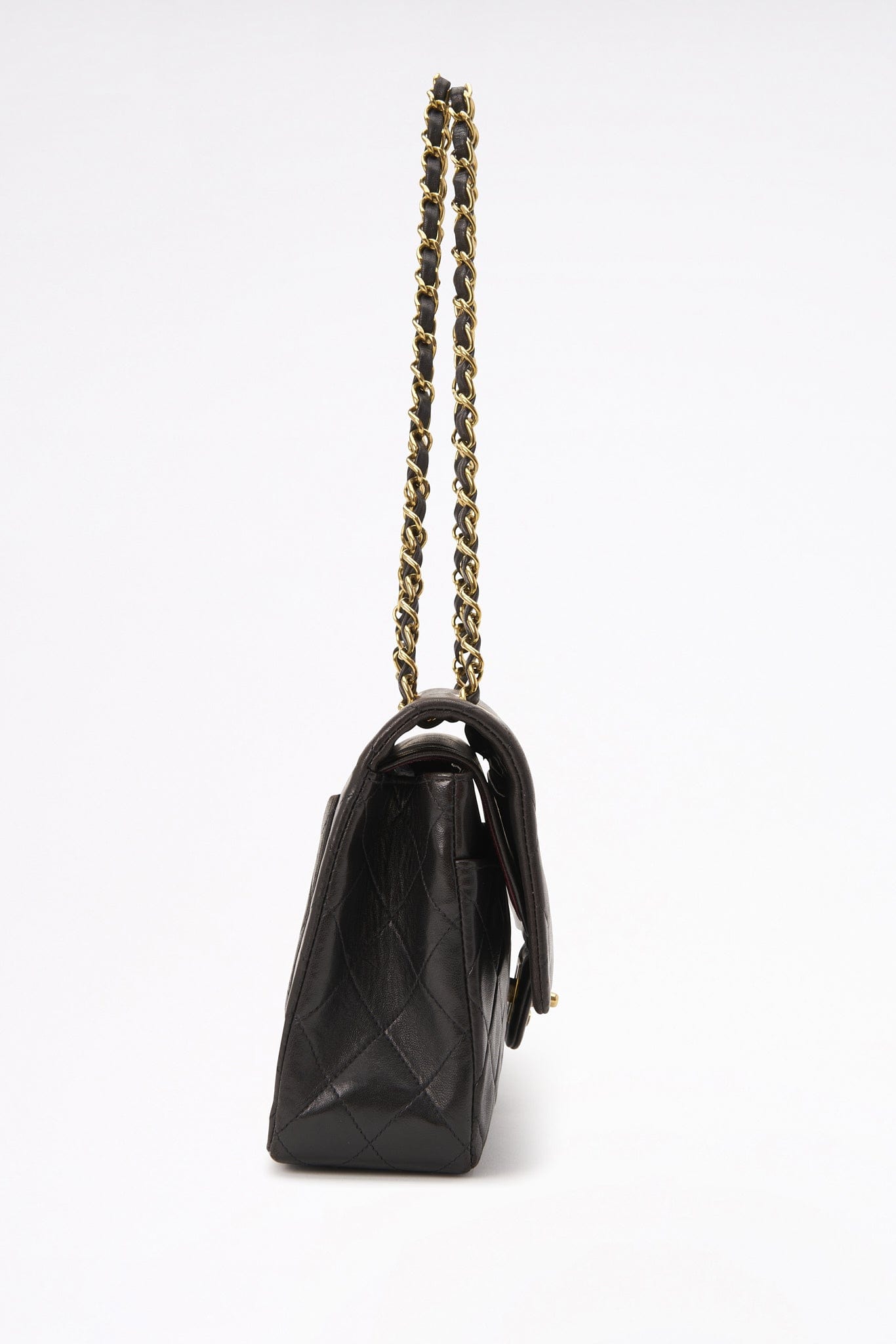 This vintage Classic Chanel Medium Flap bag is crafted with diamond quilted lambskin leather with 24k gold-plated hardware and a single convertible leather-trimmed chain-link shoulder strap. There is a single exterior patch pocket on the back, a single zip pocket under the front flap and three interior compartments. Inside the bag is lined with maroon leather.