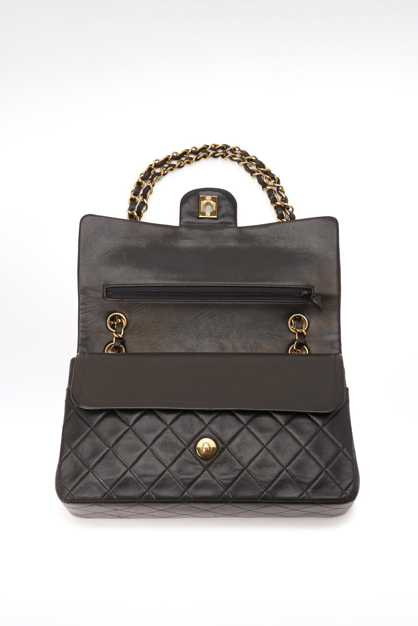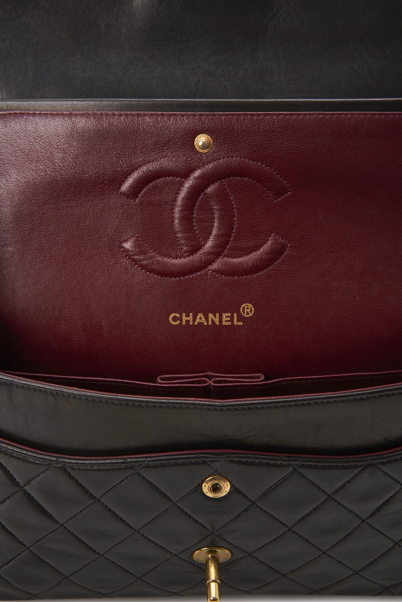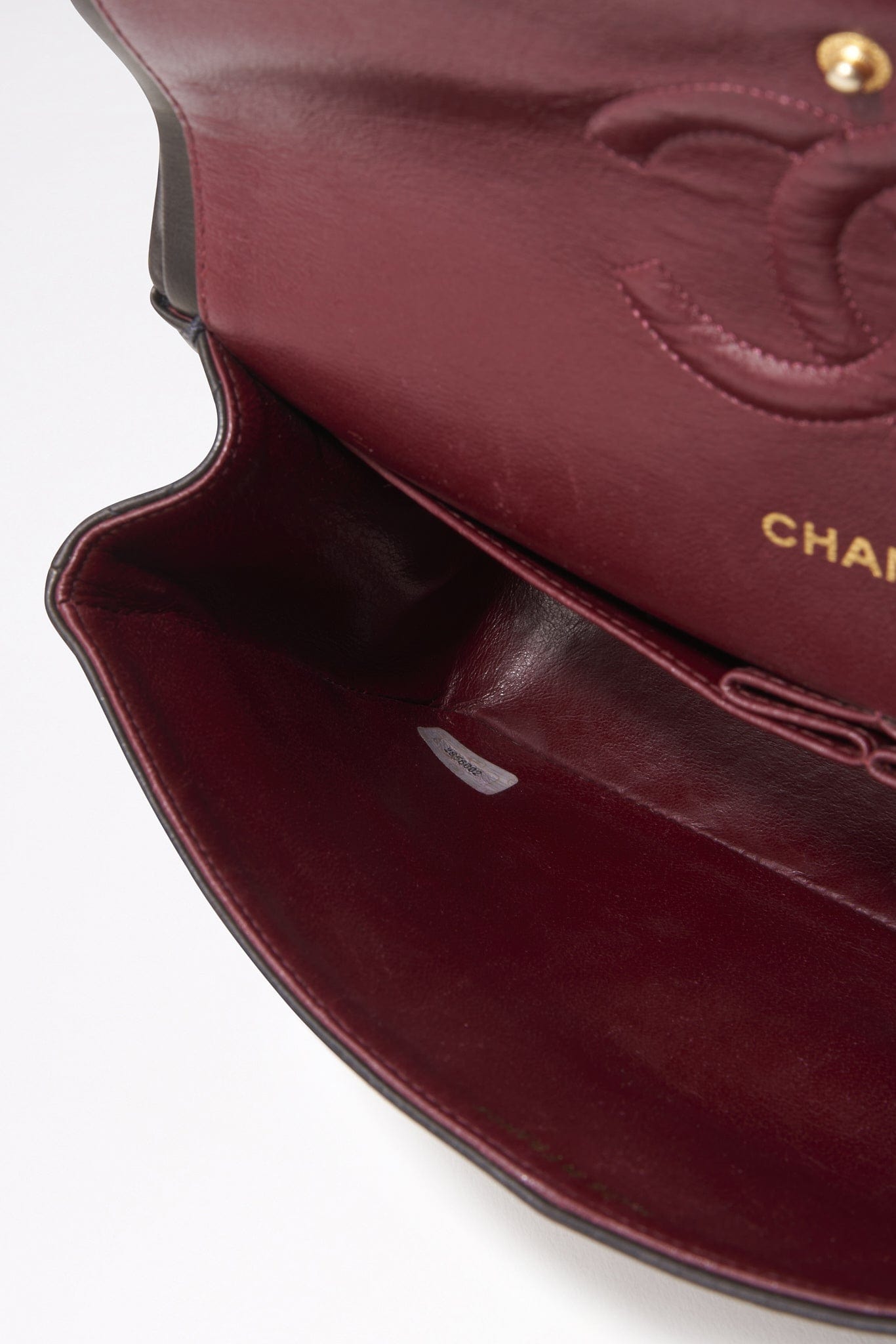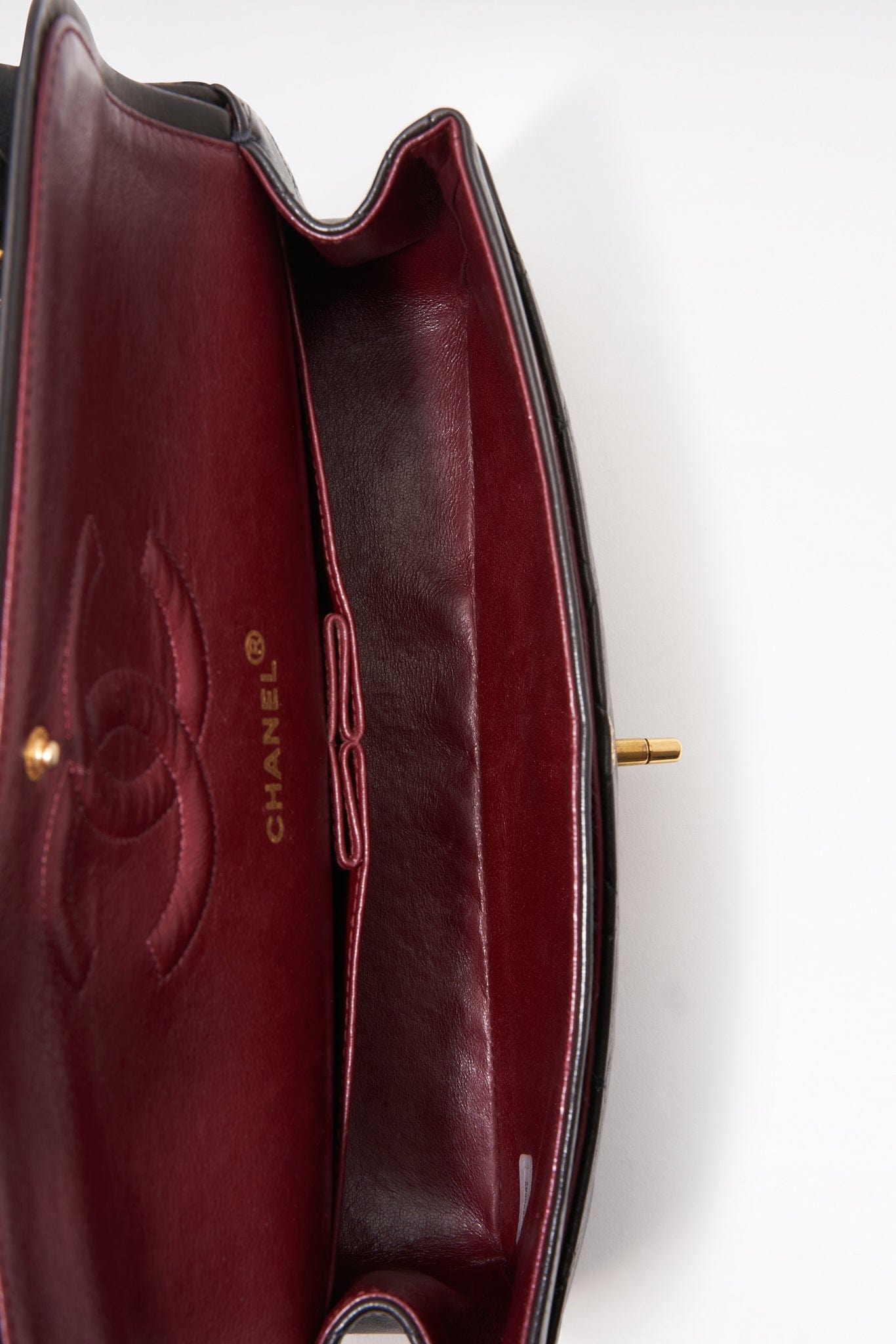 The hallmark on the CC turn lock confirms the gold hardware is plated in 24K gold, a real collectors item. Before 2008, Chanel Classic Flaps with gold coloured hardware (chains, clasps, grommets, and CC turn locks) were all plated in real 24K gold.