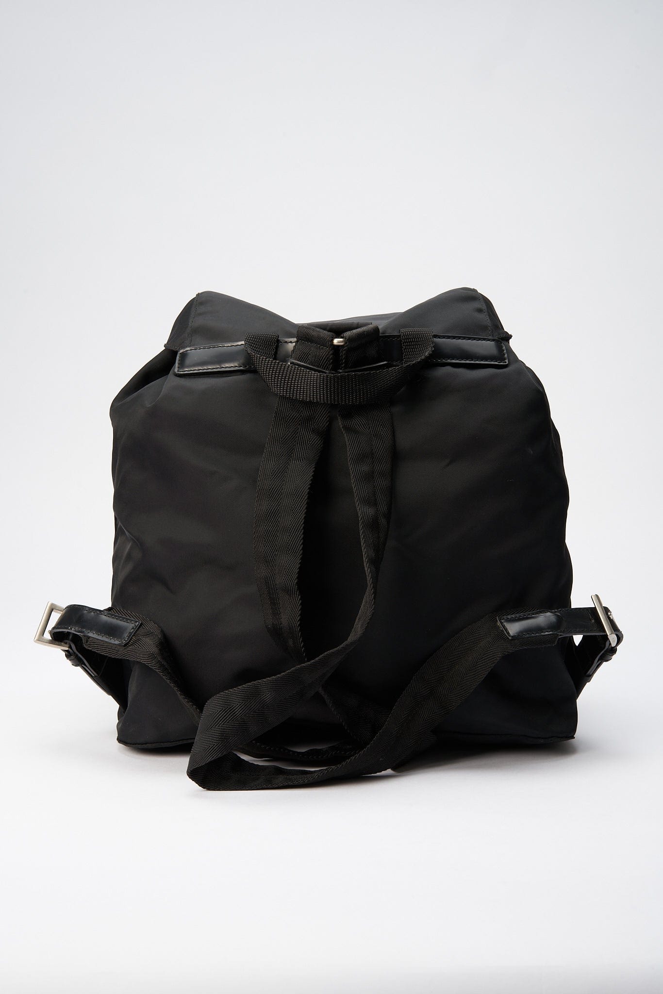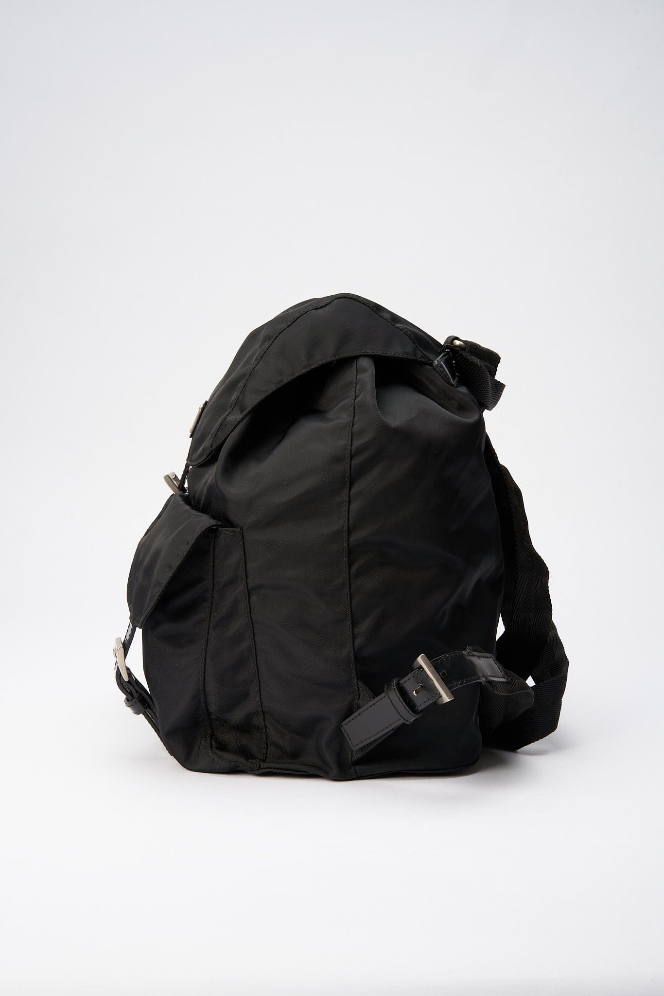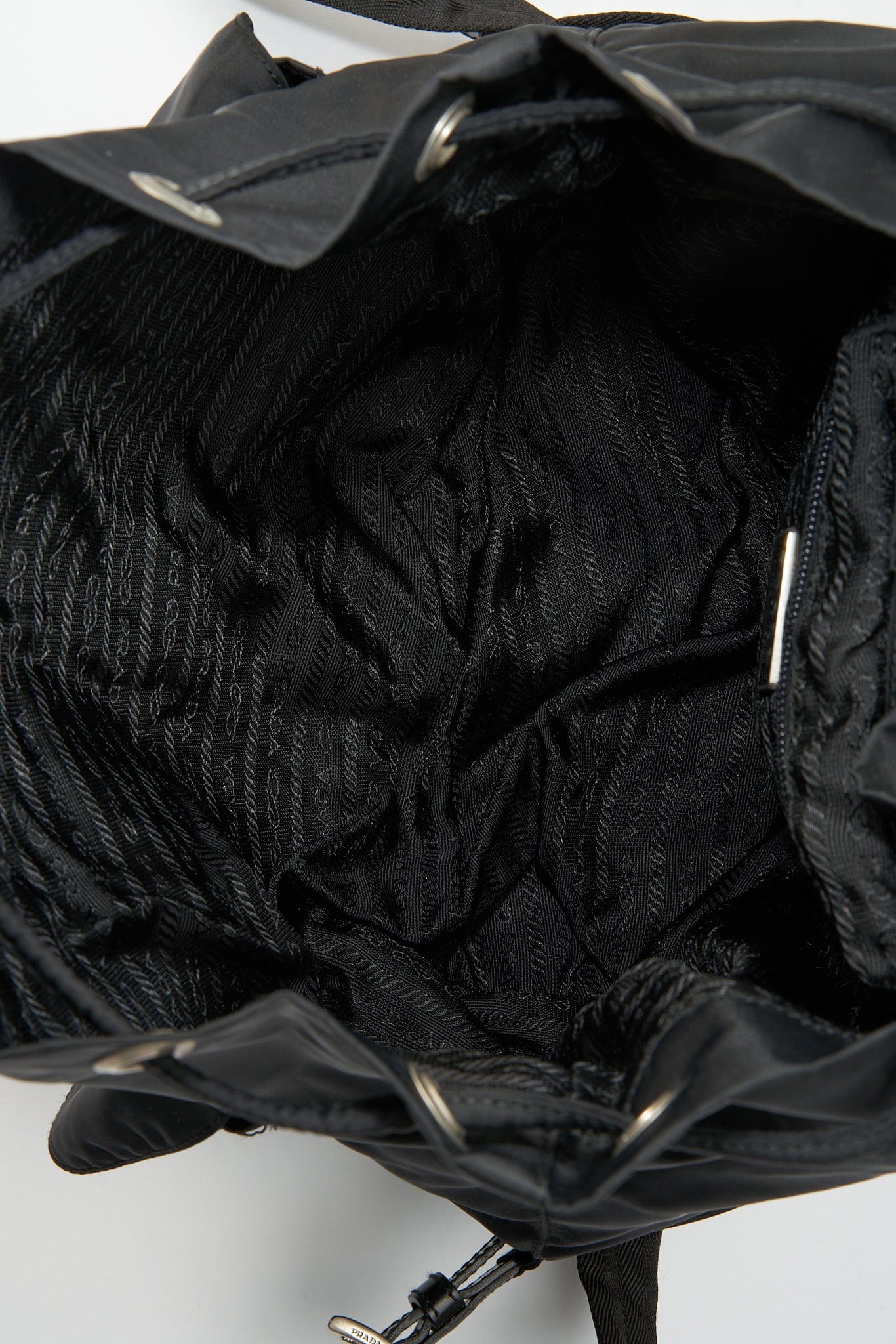 When Prada released its original nylon backpack in 1984 it was an instant hit. This nylon backpack with a modern, minimalist design is decorated with the Prada enamel triangle logo. Underneath the flap with a leather strap and buckle, is a drawstring closure. This is the large size.