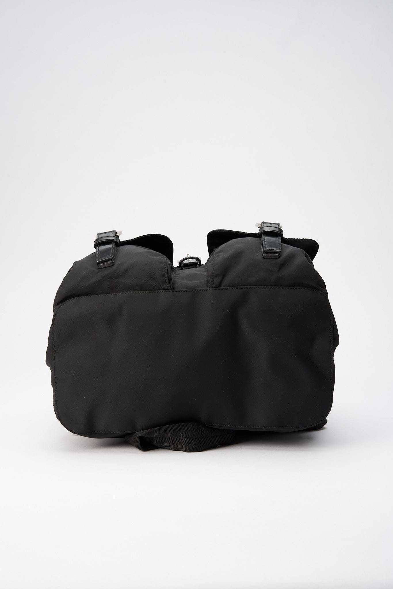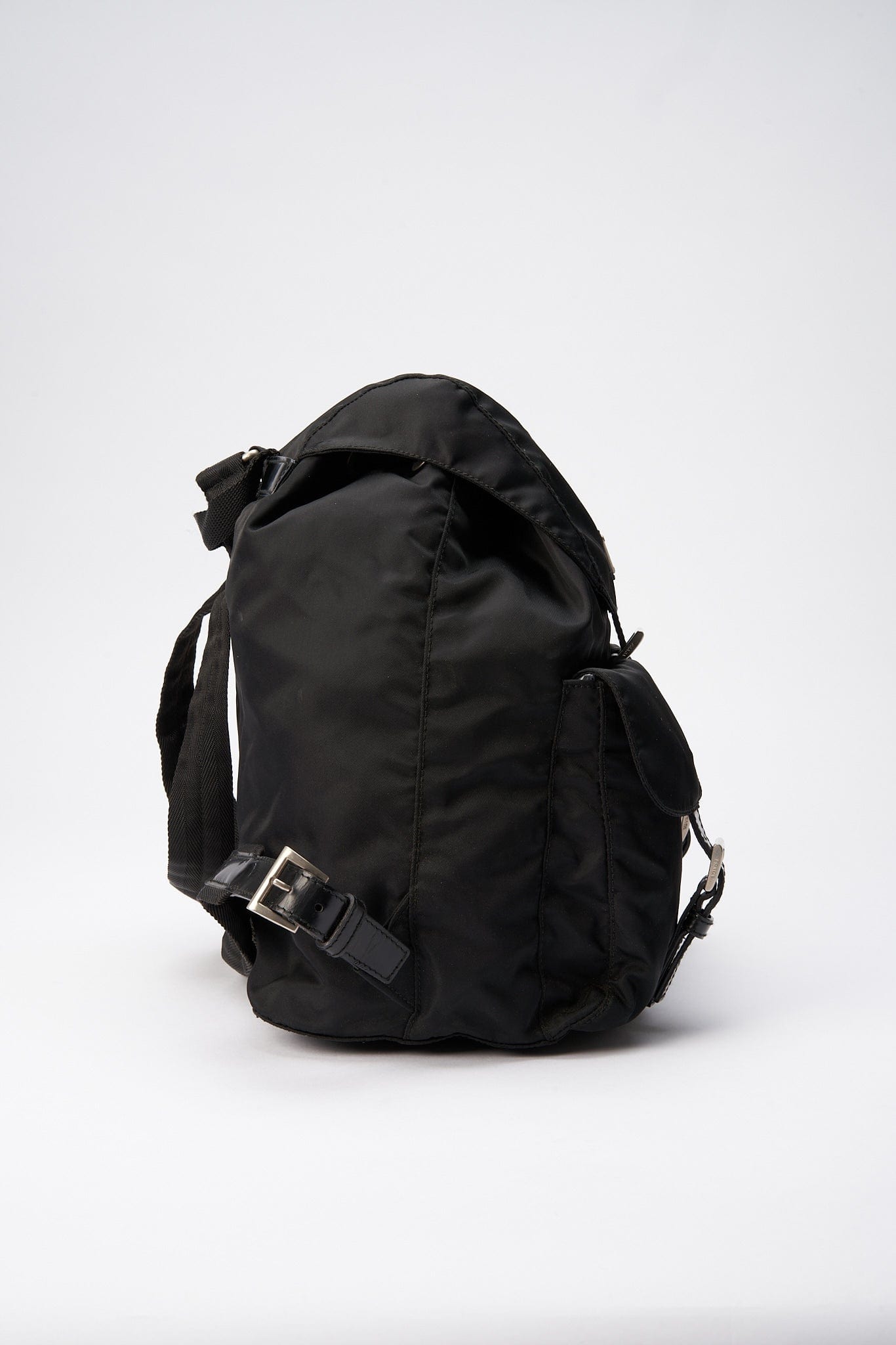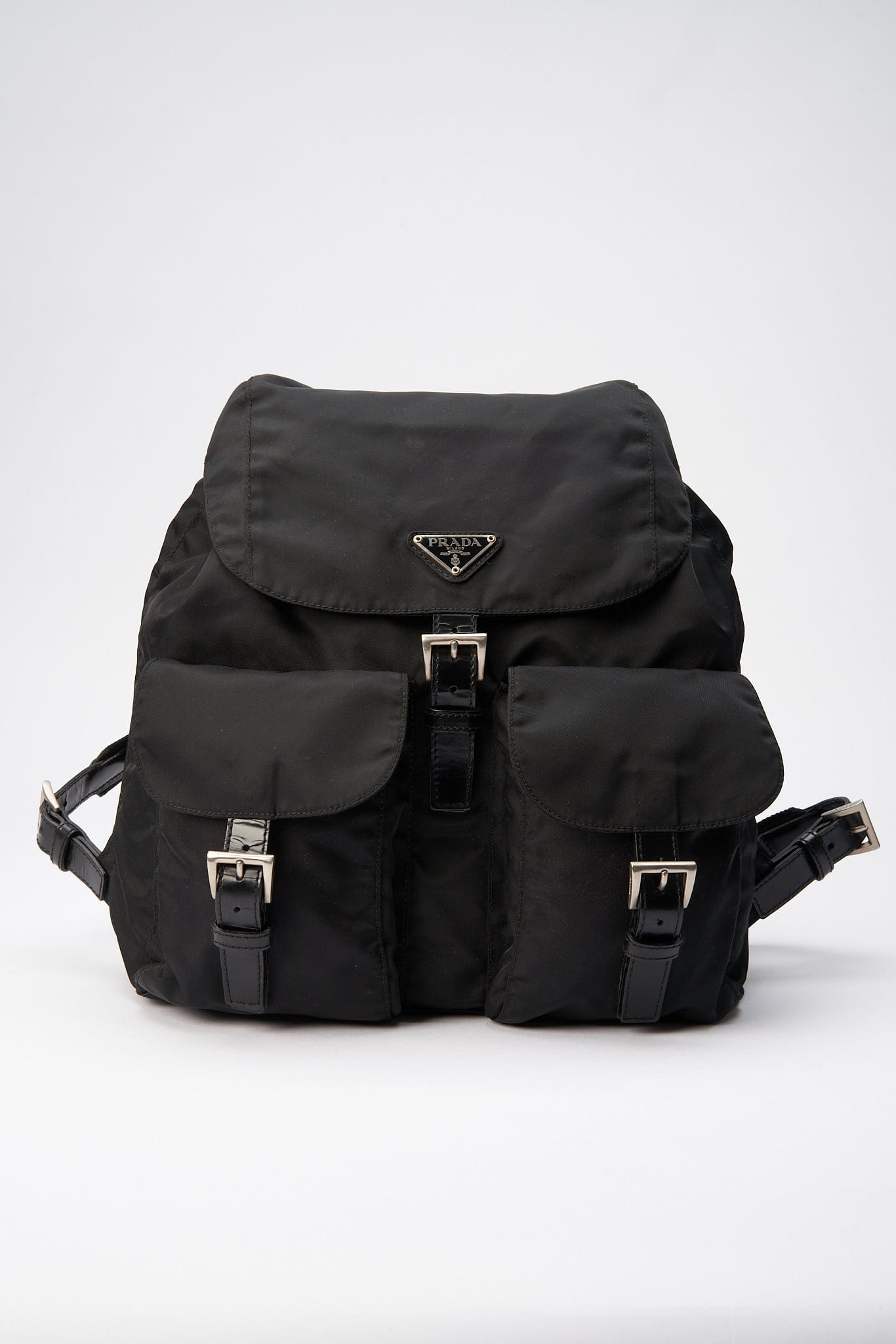 When Prada released its original nylon backpack in 1984 it was an instant hit. This nylon backpack with a modern, minimalist design is decorated with the Prada enamel triangle logo. Underneath the flap with a leather strap and buckle, is a drawstring closure. This is the large size.