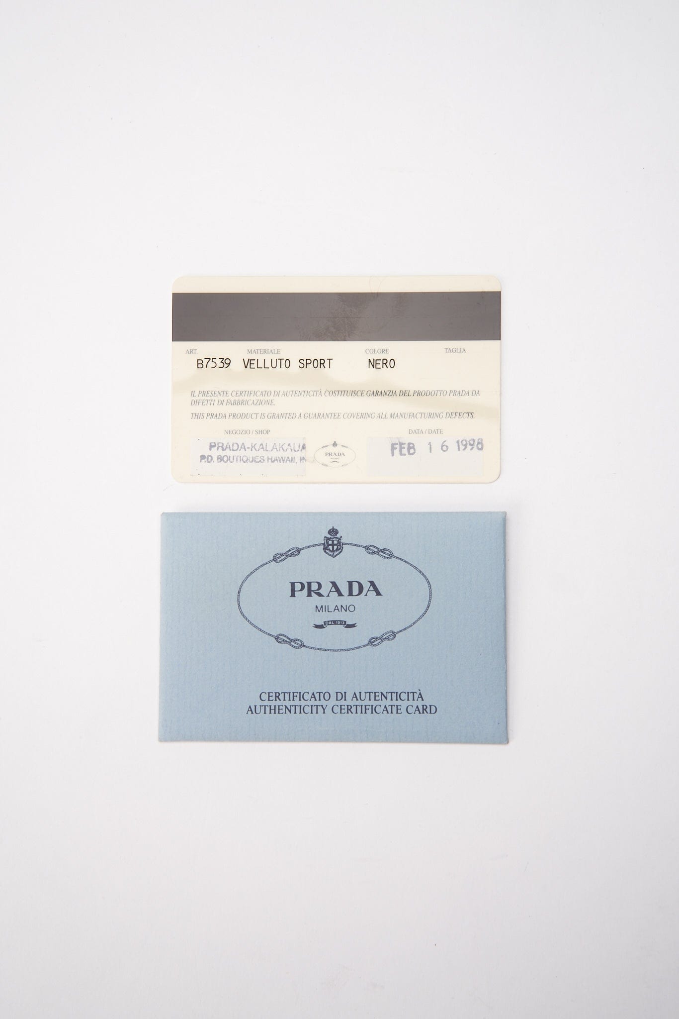 A super cool Prada shoulder bag crafted from black velvet with black leather handles. A minimal 90's silhouette and comes with its original dust bag and serial card.