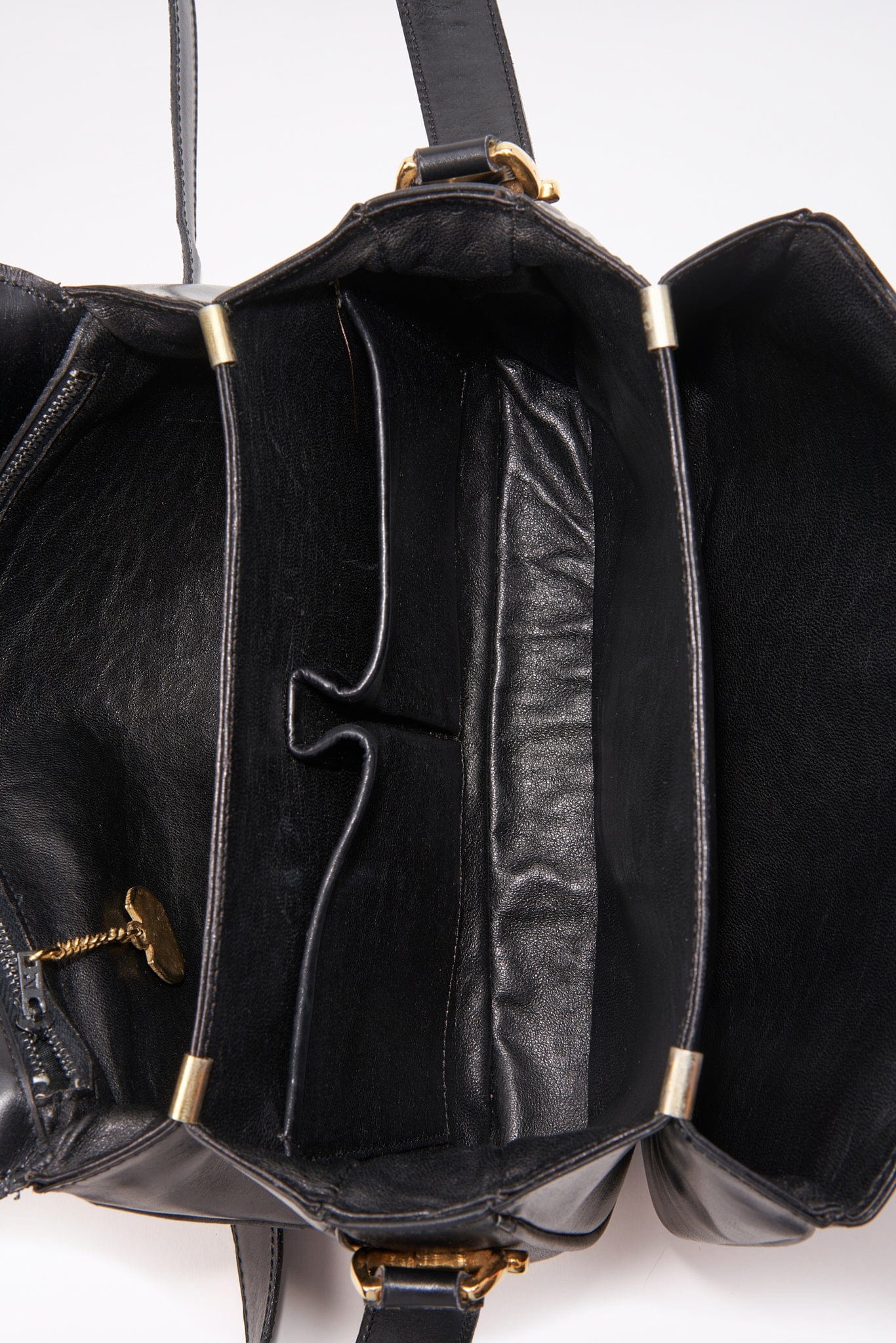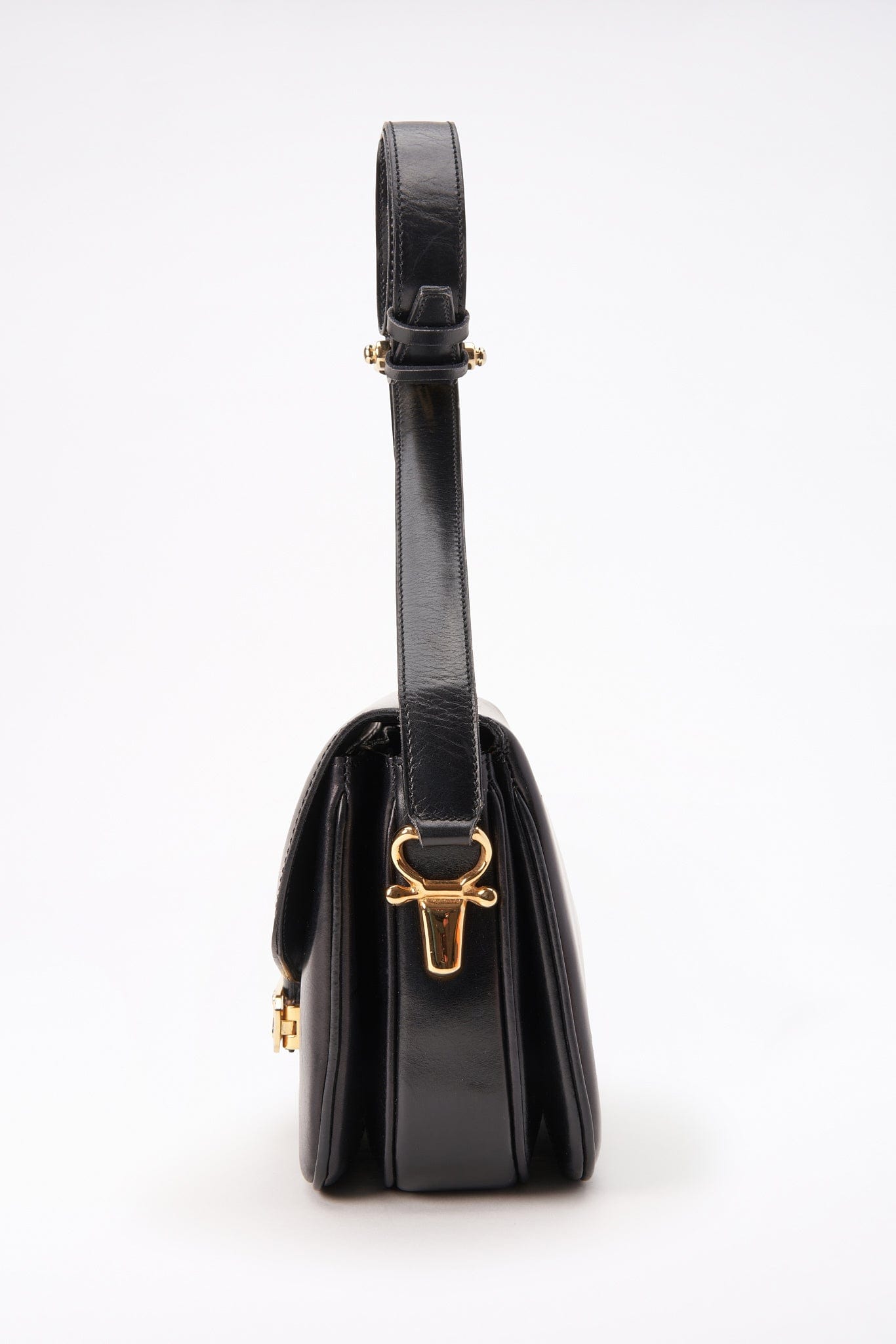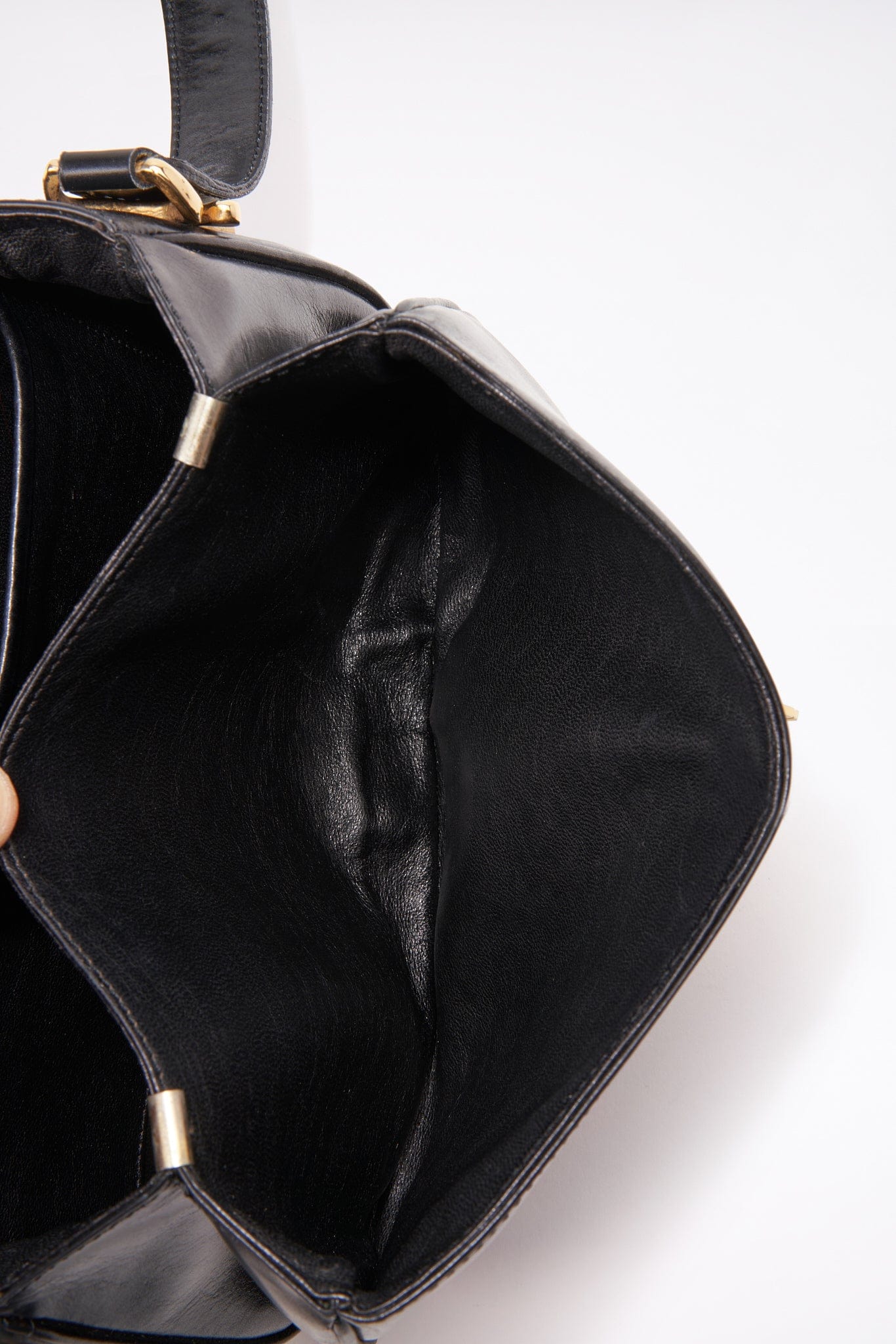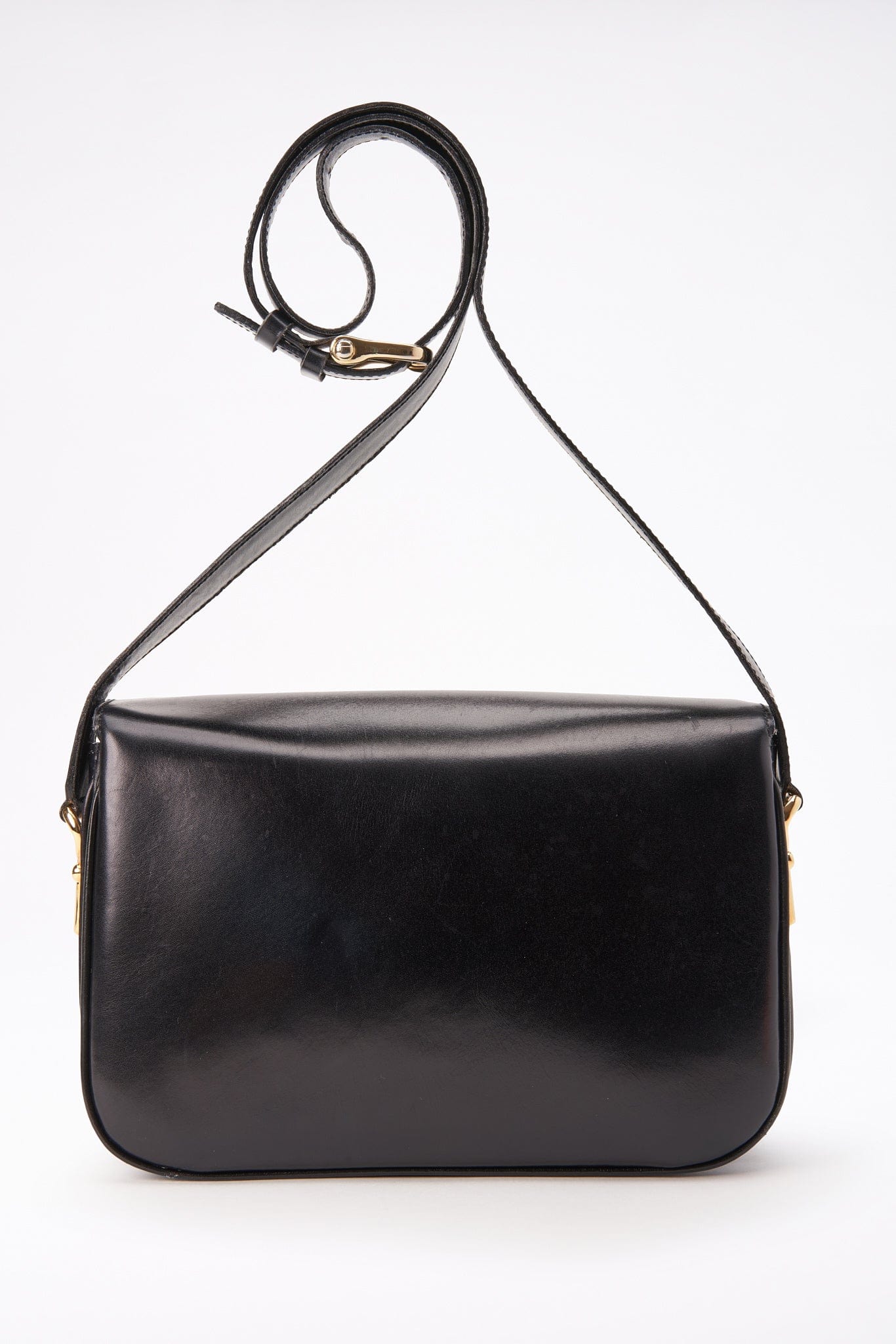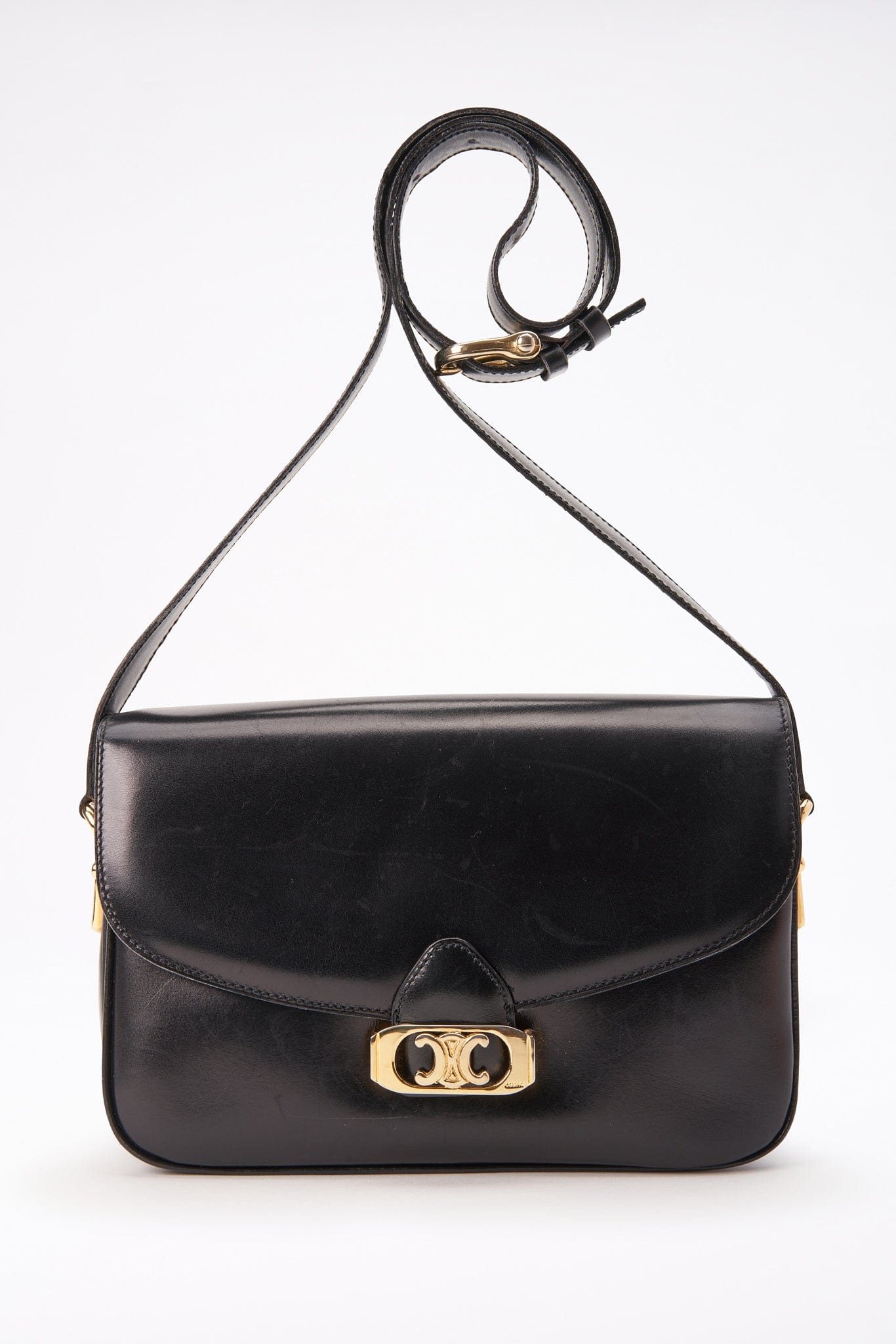 A stunning vintage Celine Triomphe box bag crafted from smooth black leather with a gold Triomphe logo clasp.