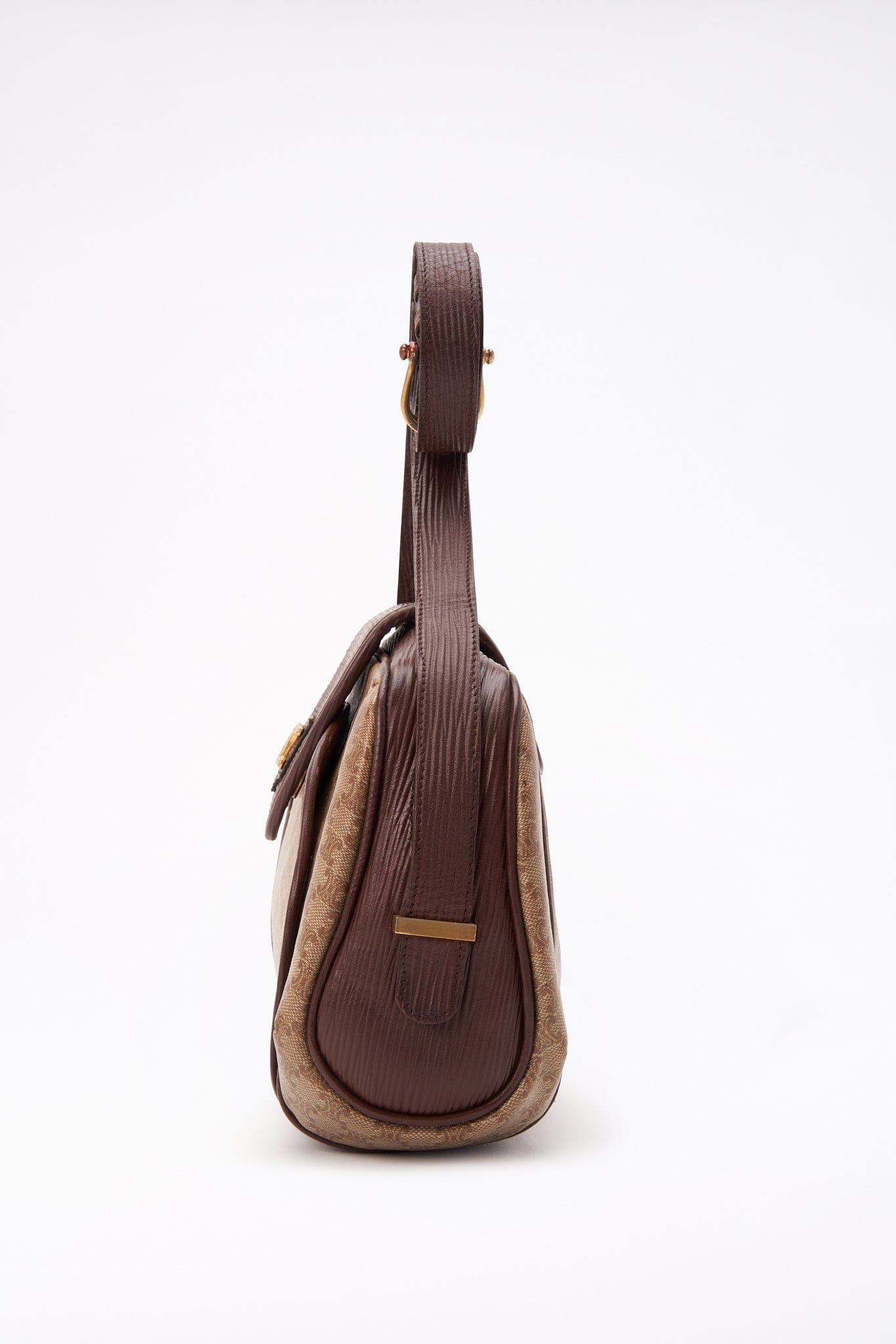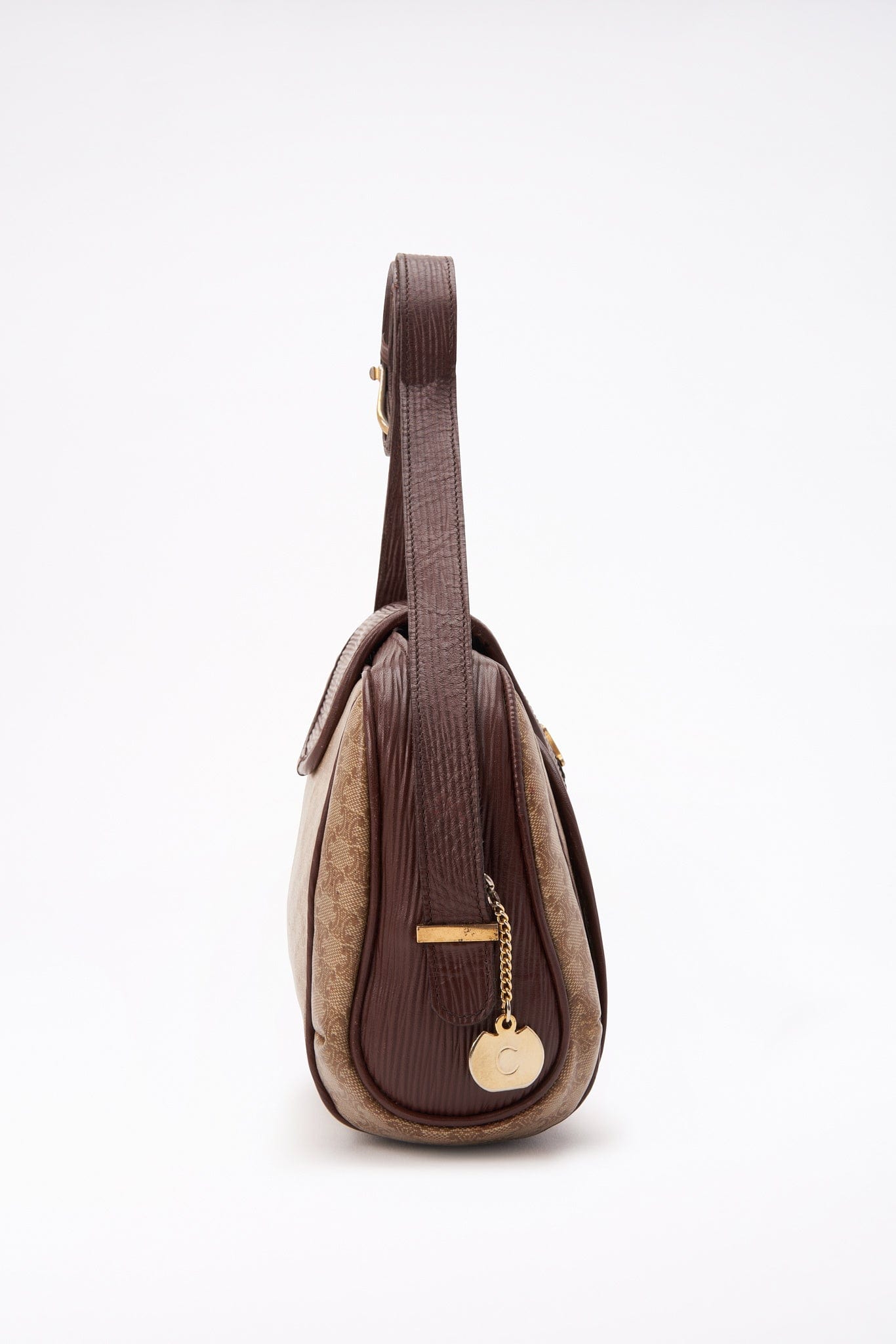 A stunning vintage Celine bag crafted from brown and beige coated canvas with gold hardware.