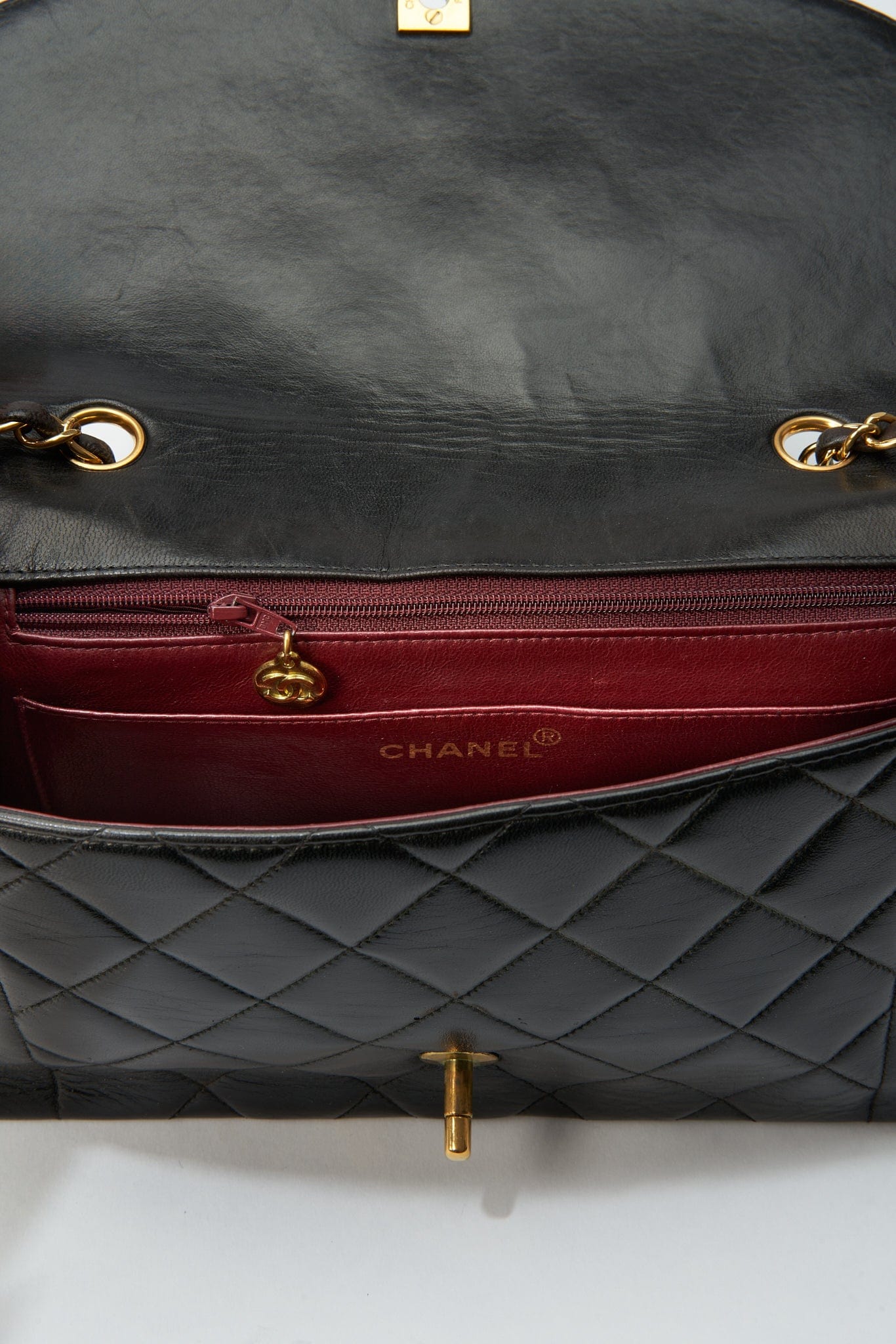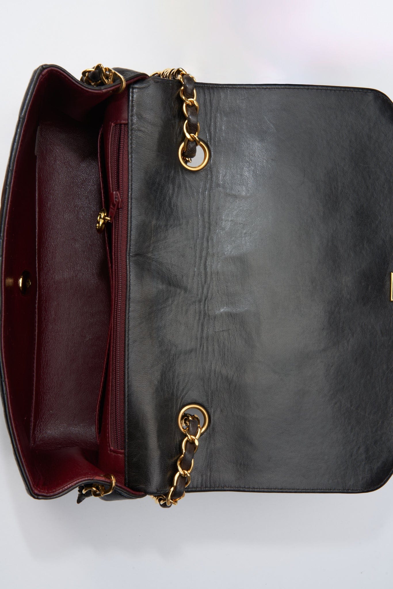 This vintage Chanel Diana Single Flap bag is crafted with black diamond quilted lambskin leather with 24k gold-plated hardware and a single leather-trimmed chain-link shoulder strap. There is a zip and a slip pocket inside this bag plus the interior is lined with maroon leather.