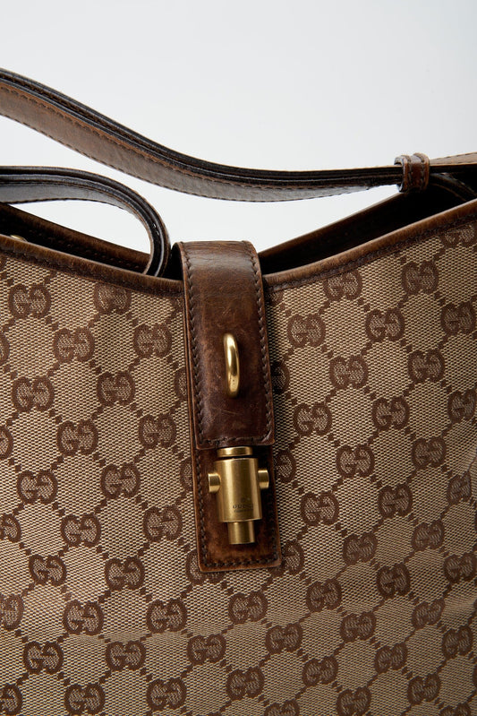 Vintage Gucci Monogram Tote Bag with Black Leather Trim