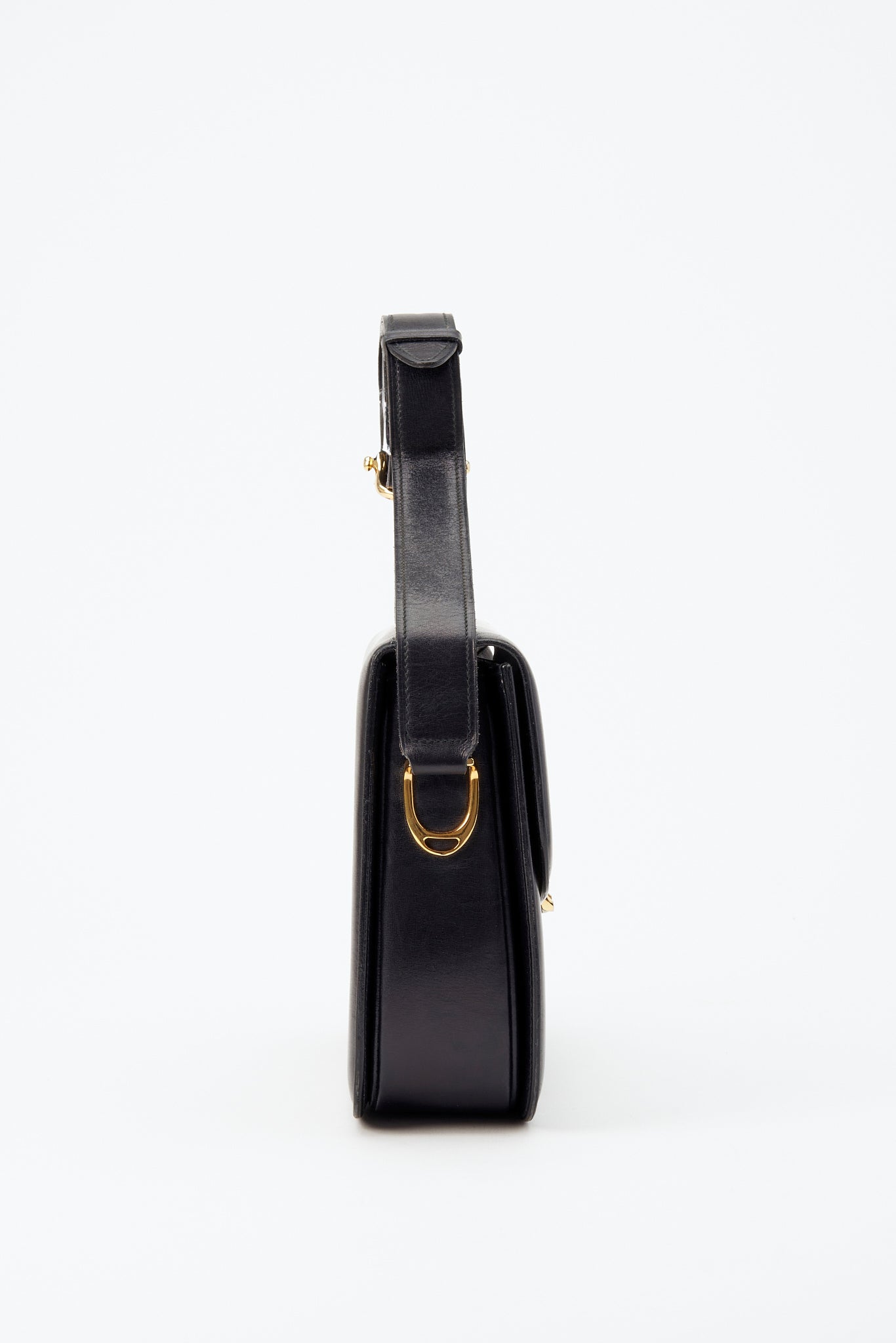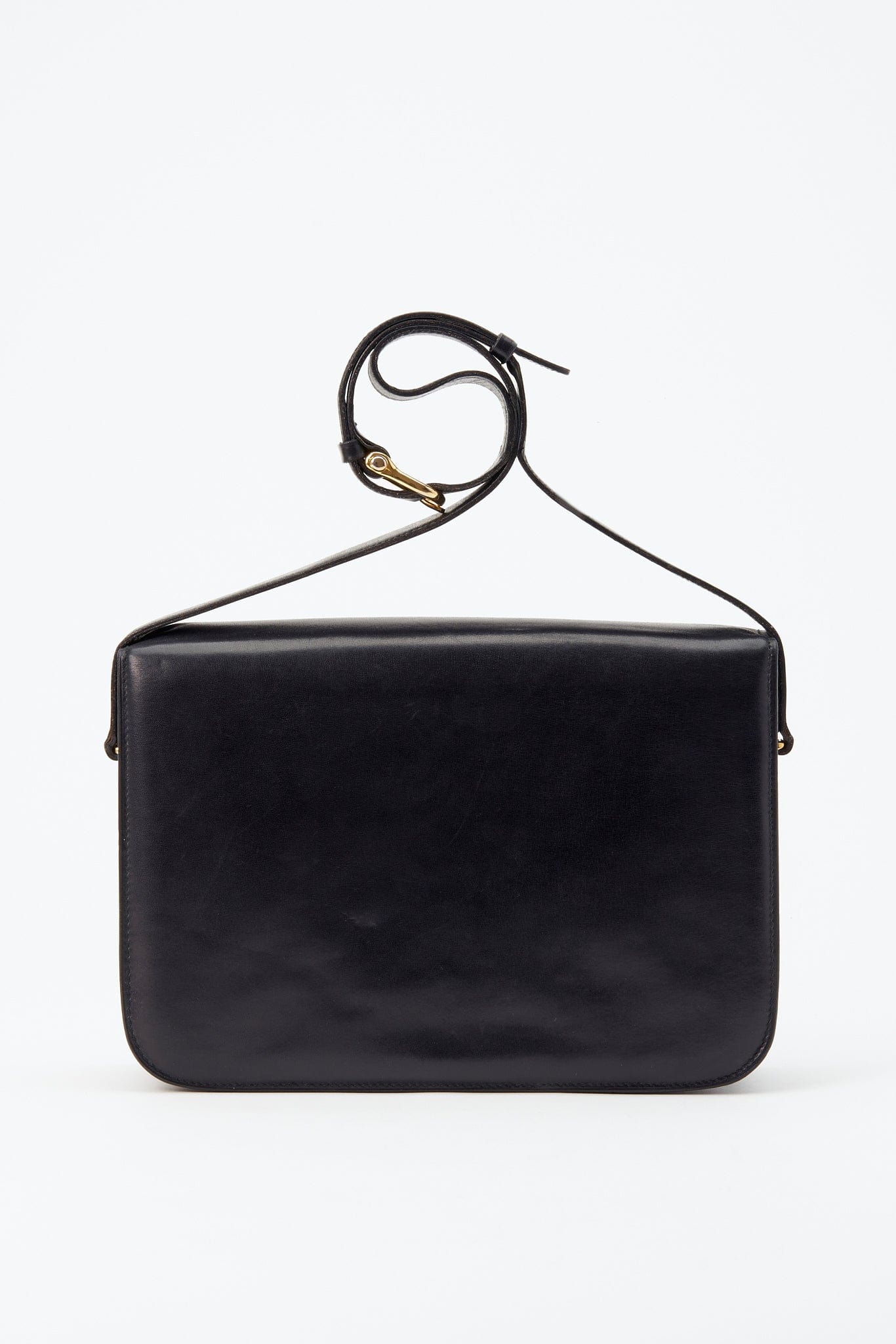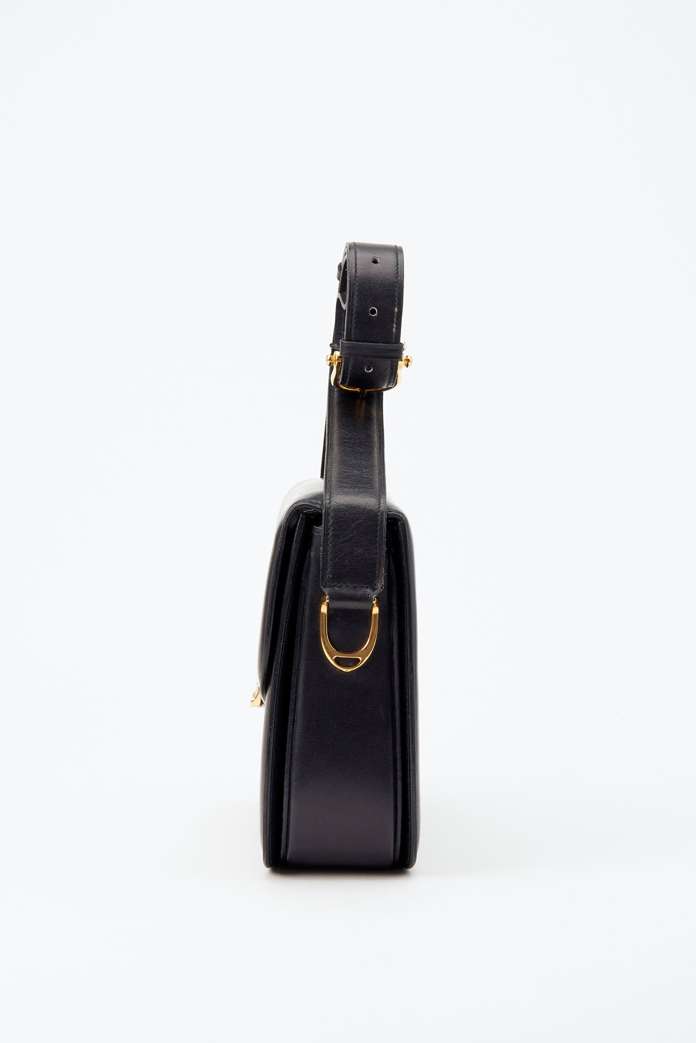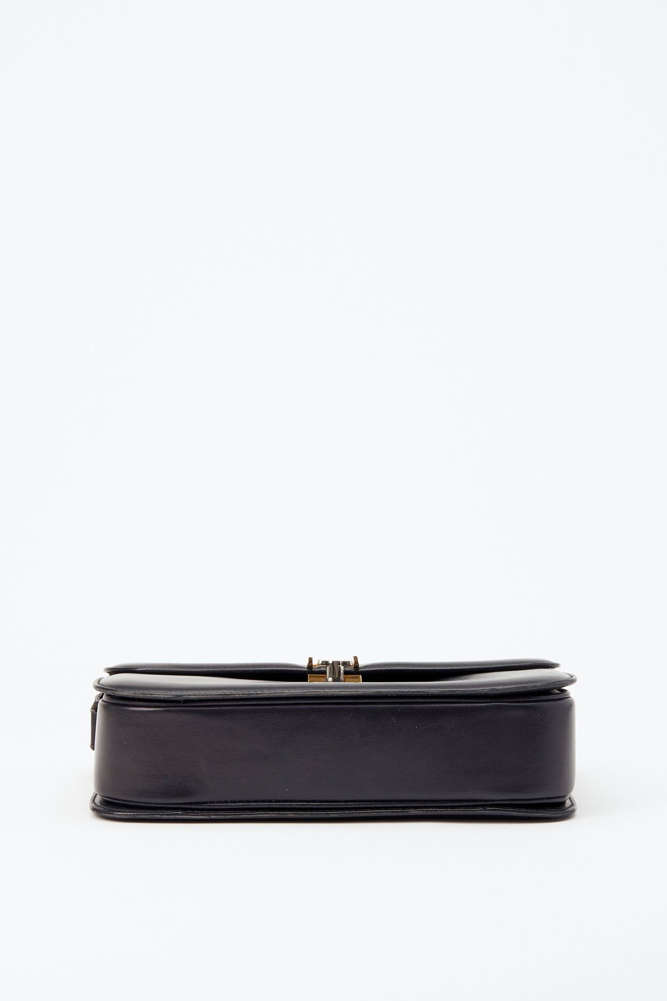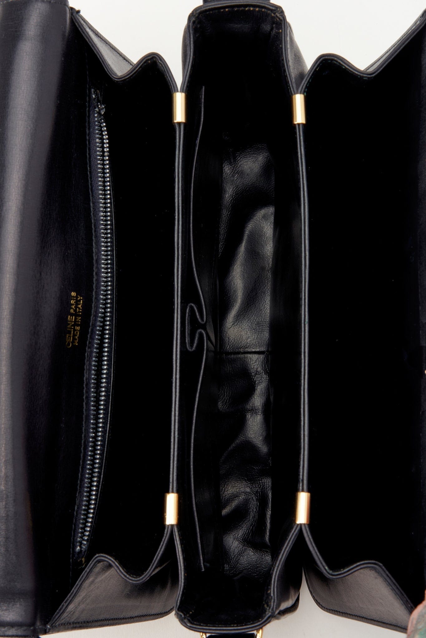 A stunning vintage Celine Triomphe box bag crafted from smooth black leather with a gold and silver Triomphe logo clasp.
