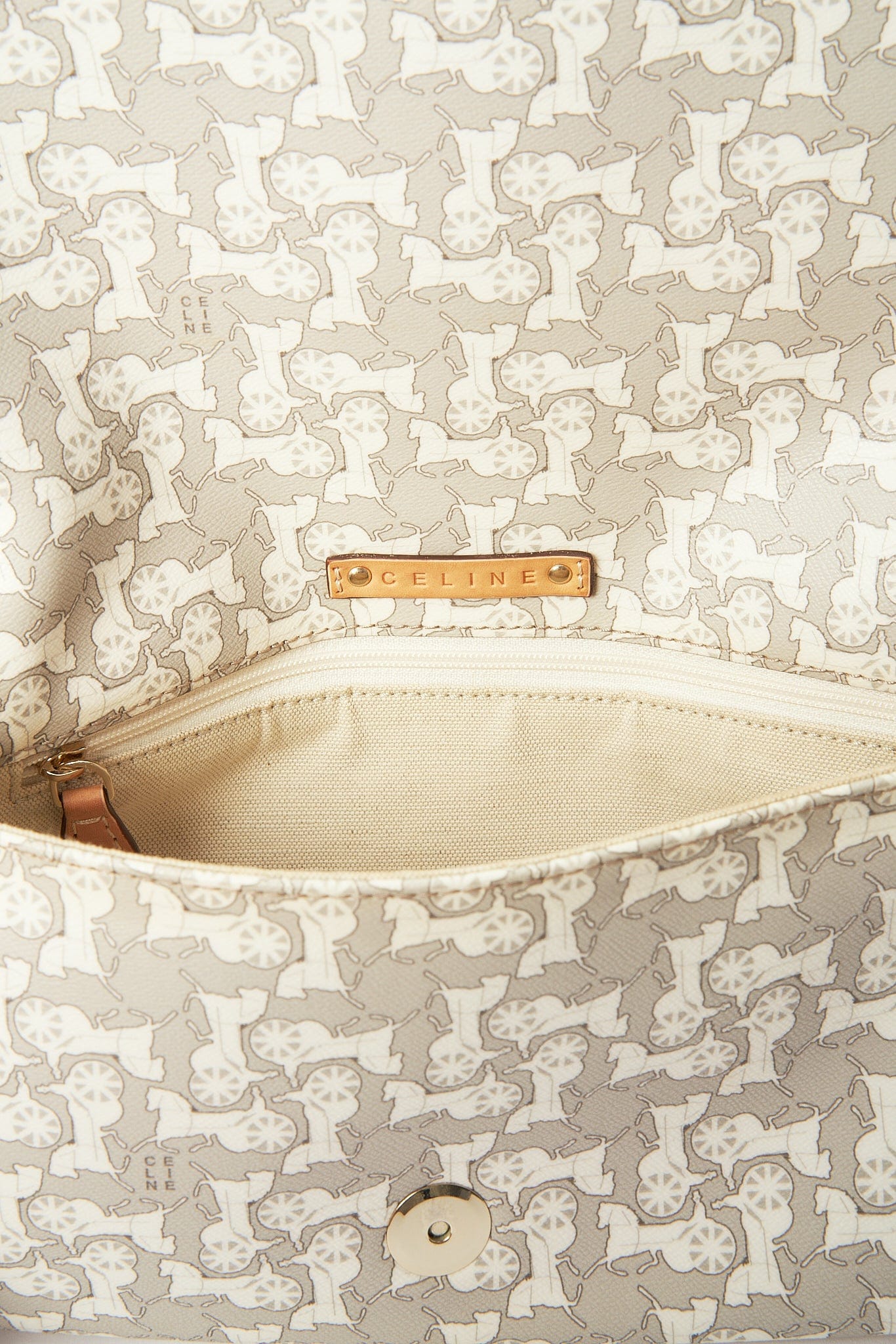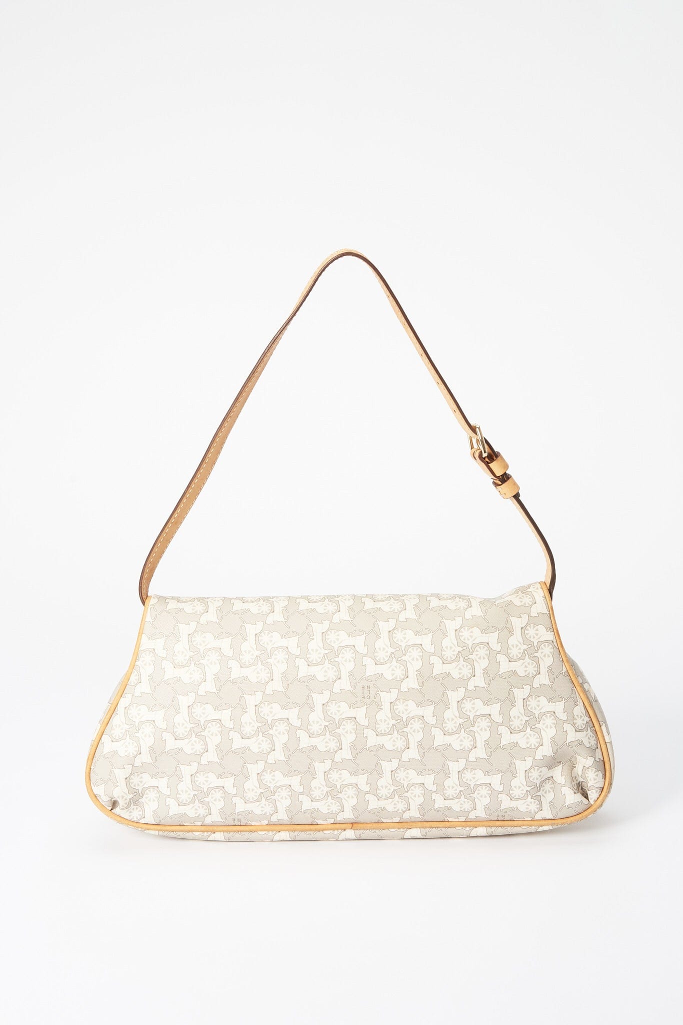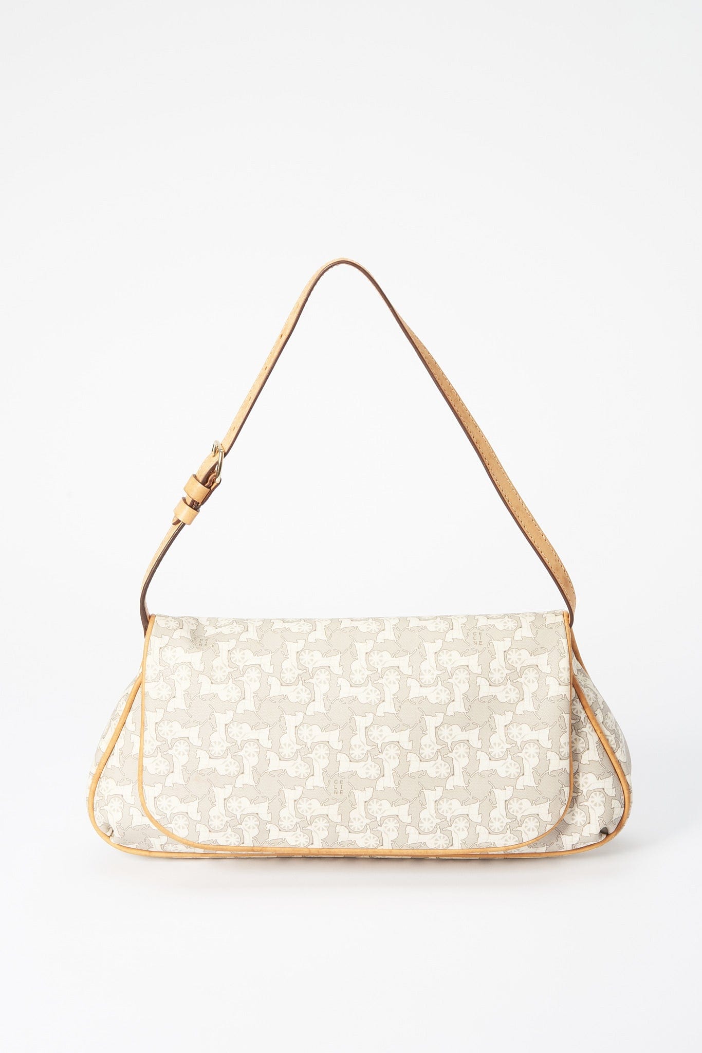 A stunning vintage Celine shoulder bag crafted from a coated canvas with a tan leather trim.