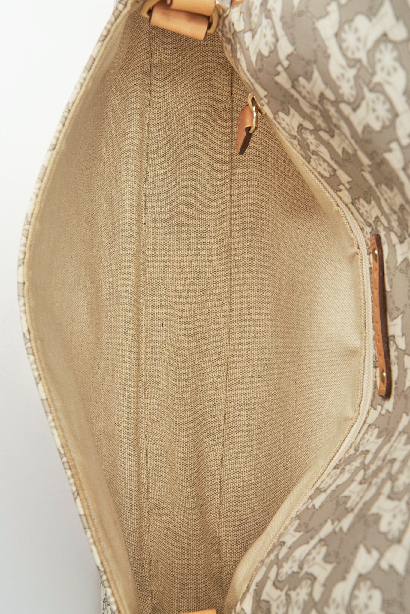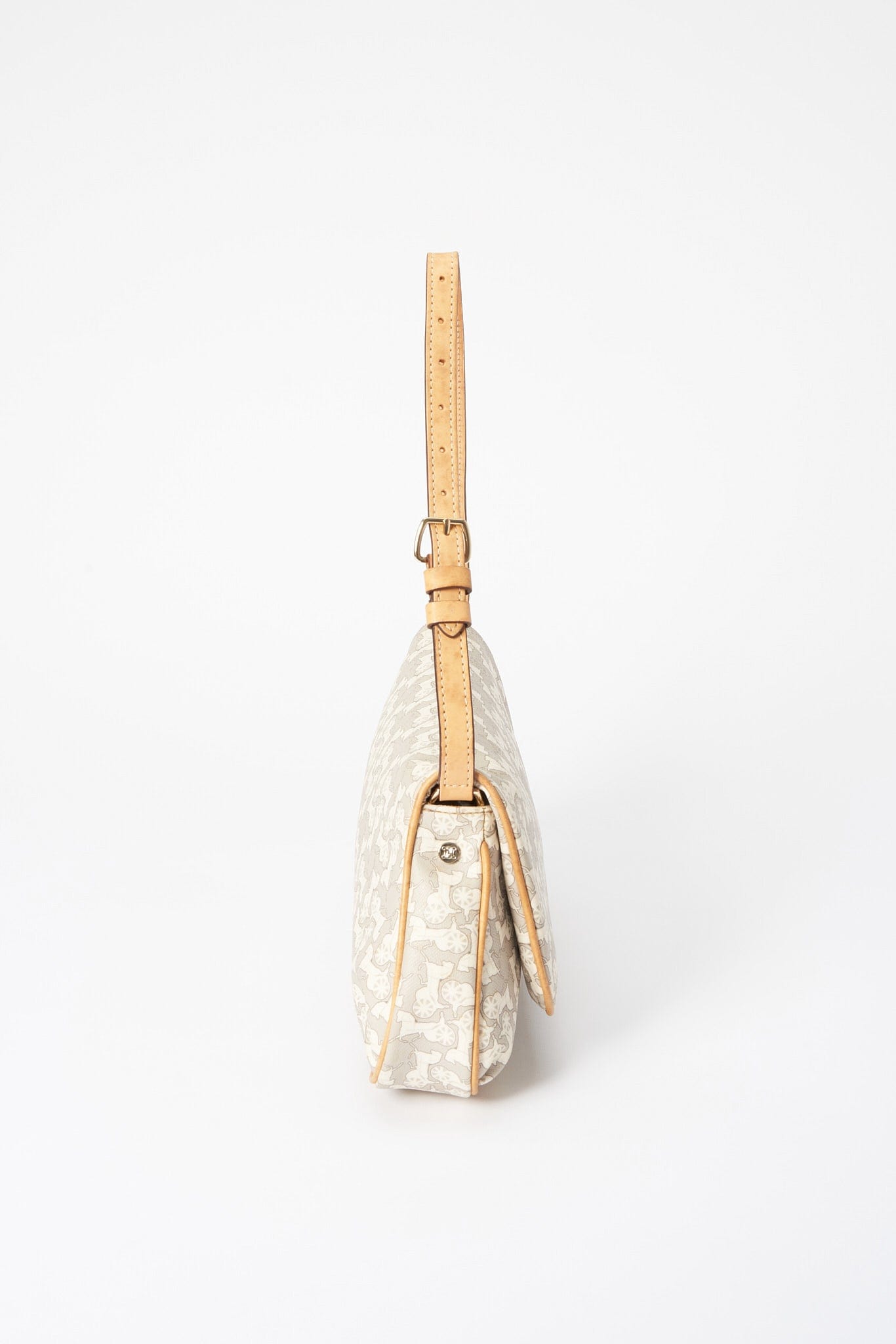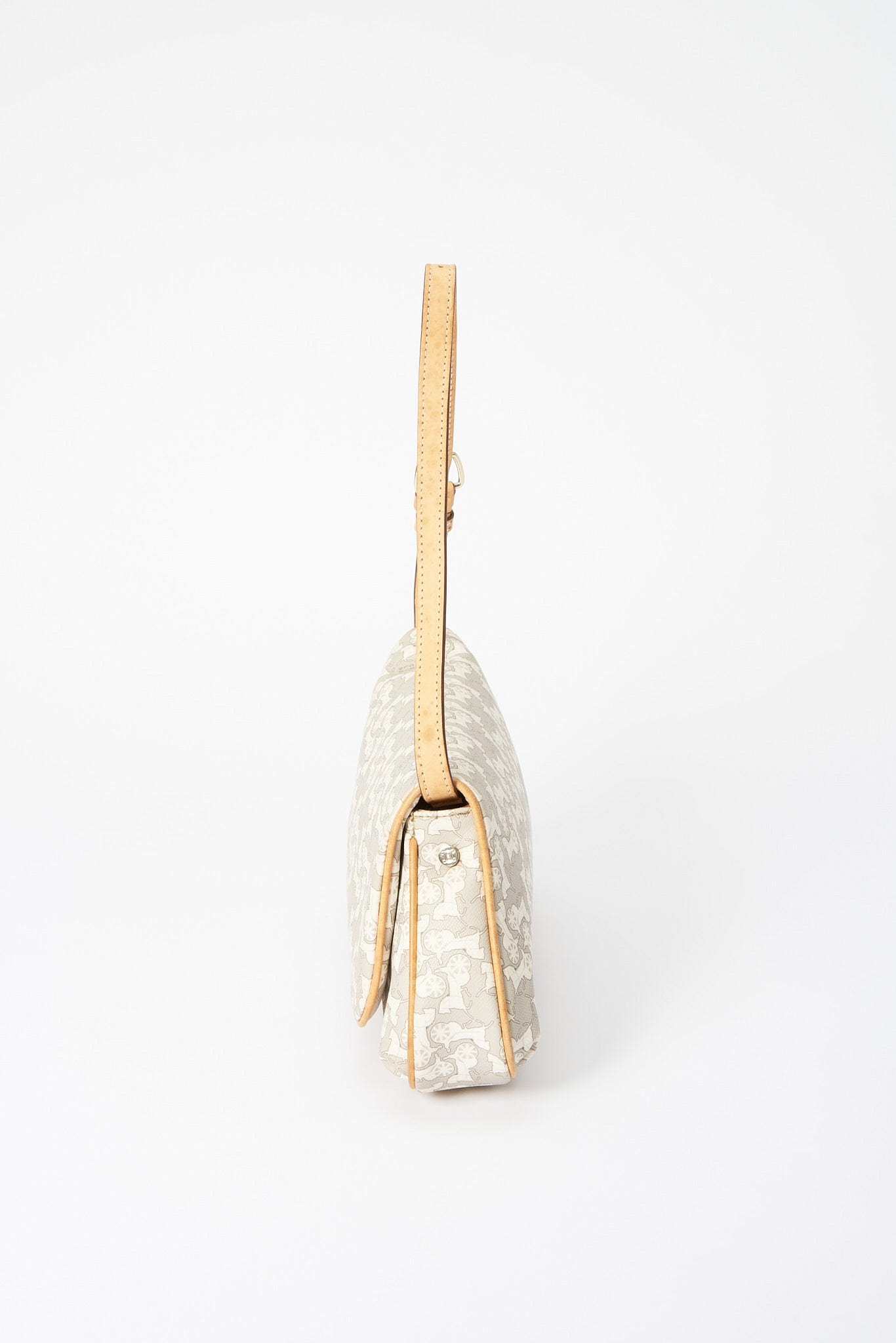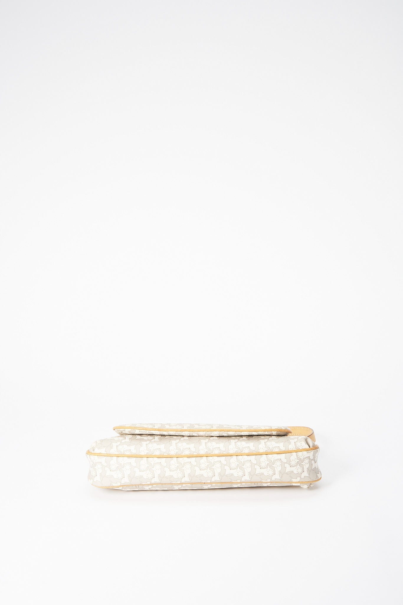 A stunning vintage Celine shoulder bag crafted from a coated canvas with a tan leather trim.
