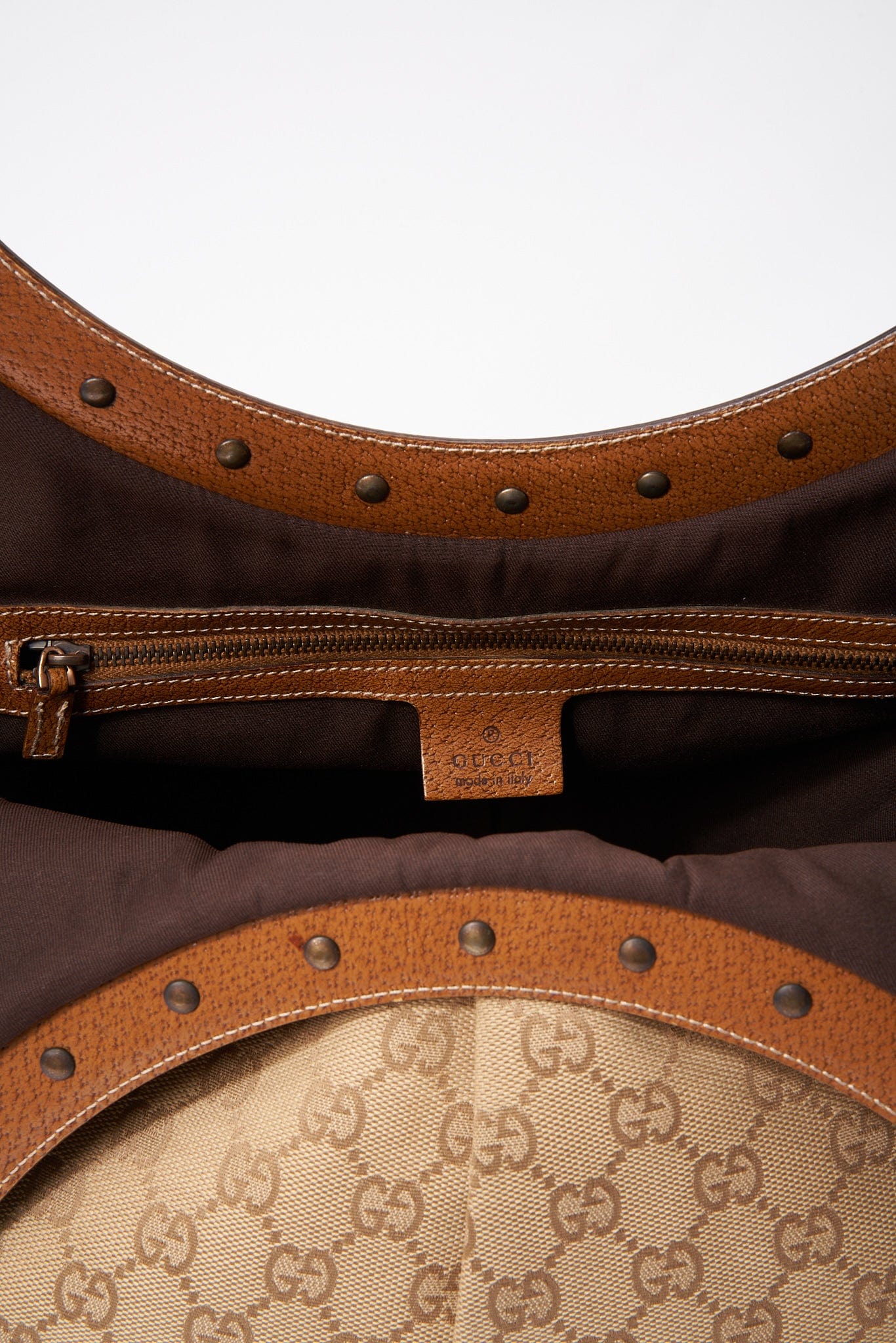 A stunning vintage Gucci shoulder bag made from the iconic GG beige canvas with tan leather trim and the iconic bamboo handle.