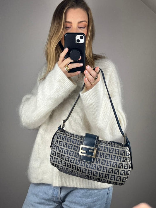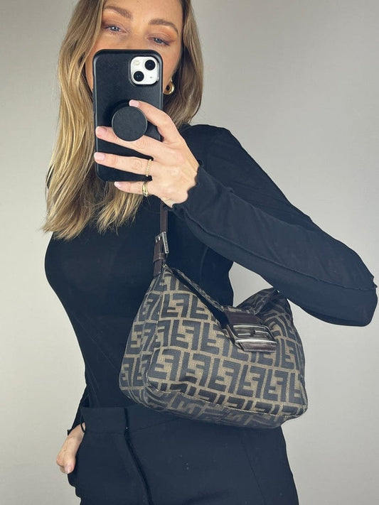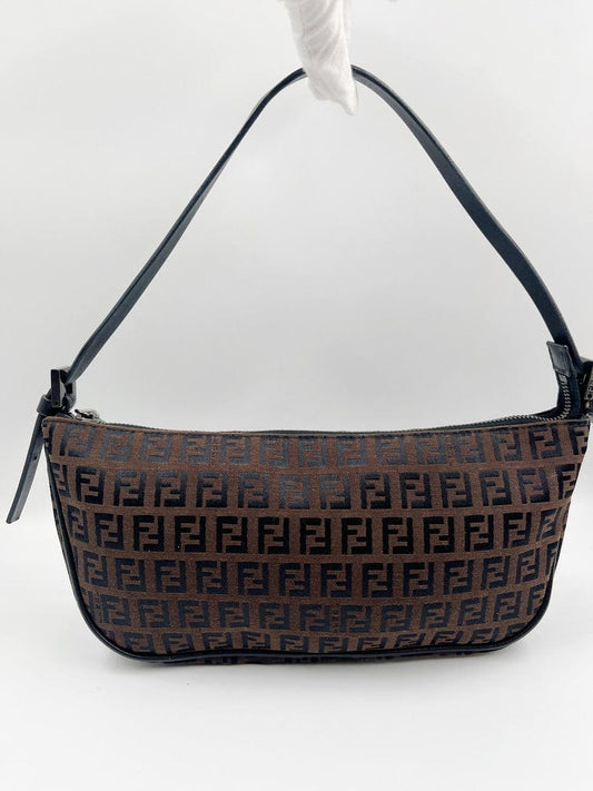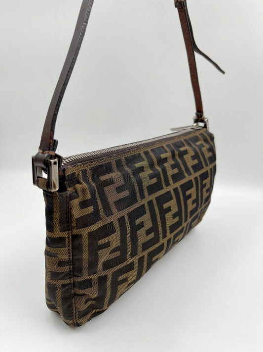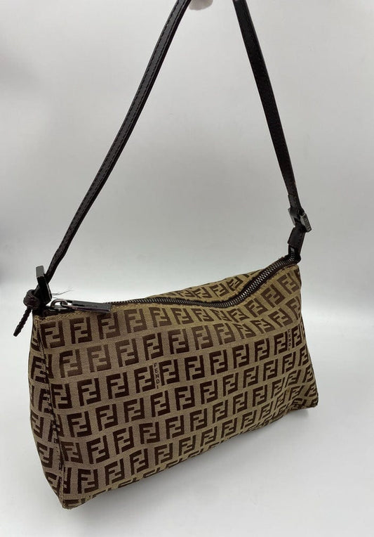 "Zucca" denotes the signature monogram print of Fendi, characterised by interlocking double "F" logos in a repeating pattern. The double "F" logo was designed by Karl Lagerfeld in the 1960s shortly after he joined the fashion house. Over the years, the Zucca print has been incorporated into various bag styles and designs by Fendi. From the classic Fendi Baguette bag to totes and more contemporary styles.