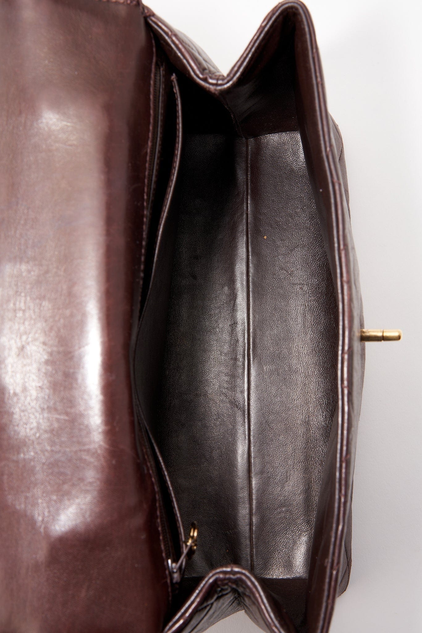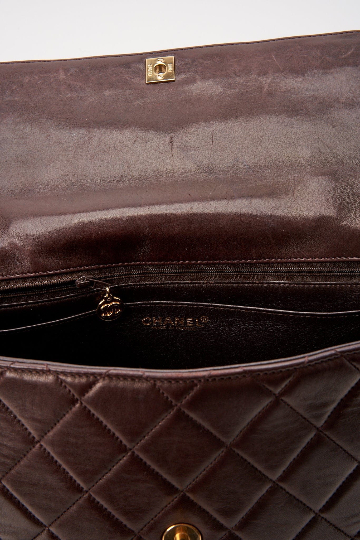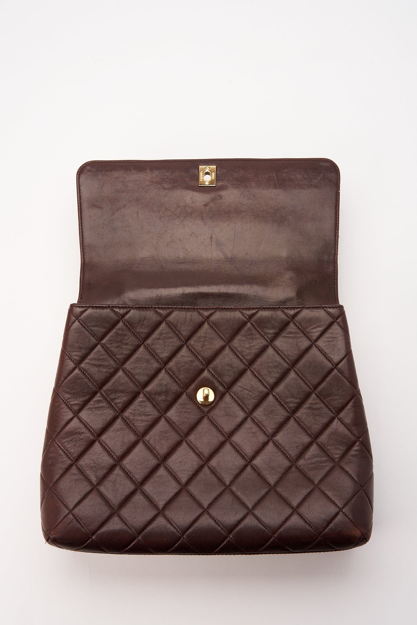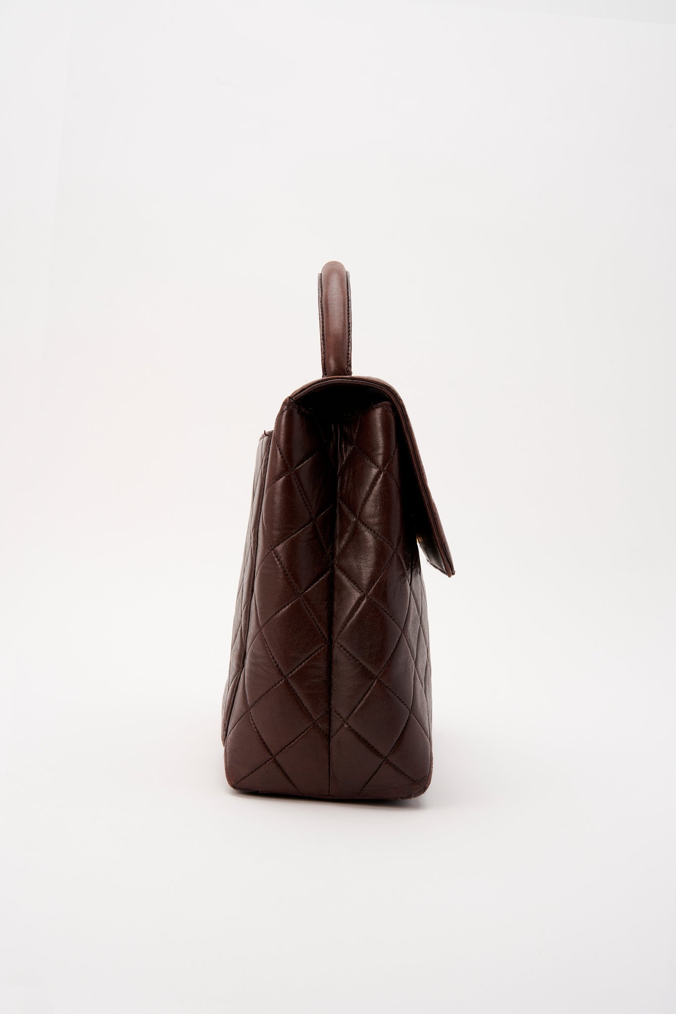 A beautiful vintage Chanel Kelly bag. Crafted from a chocolate brown quilted lambskin leather featuring the iconic CC turn-lock and 24k gold plated hardware.