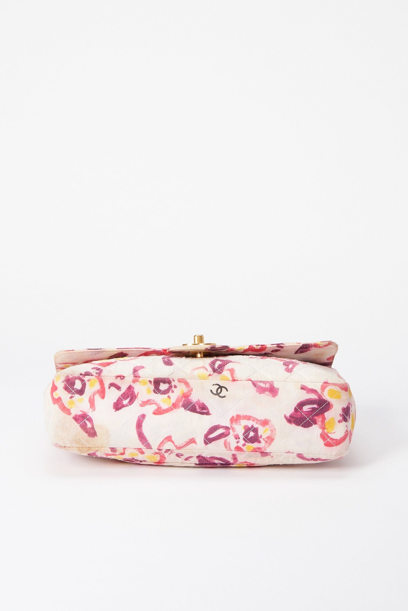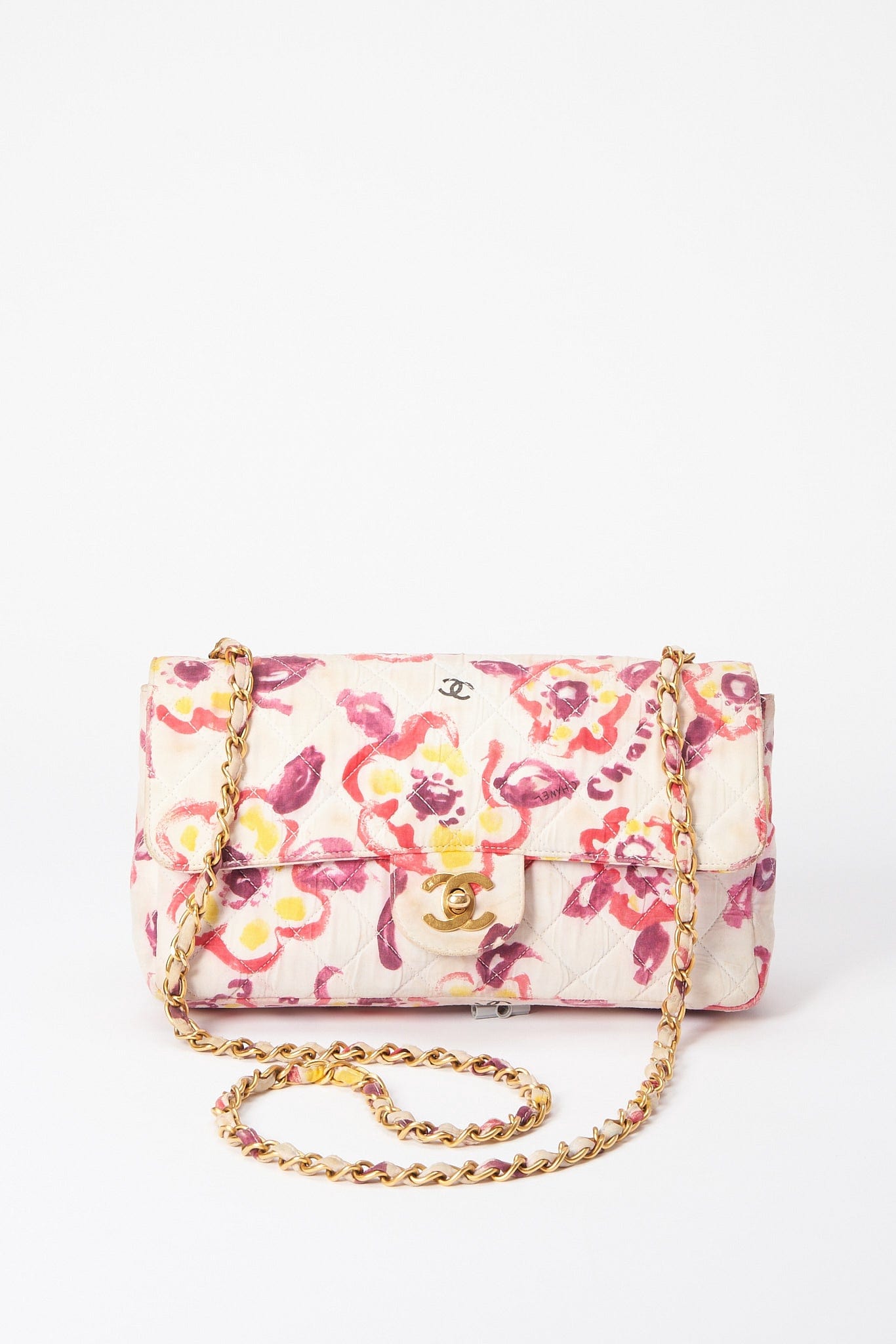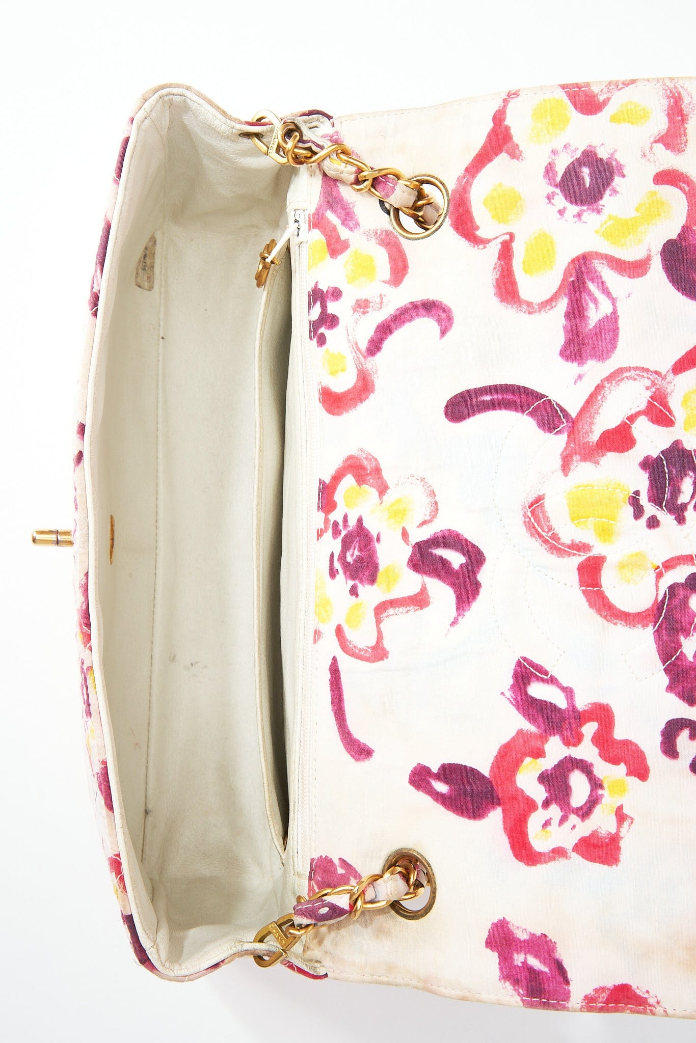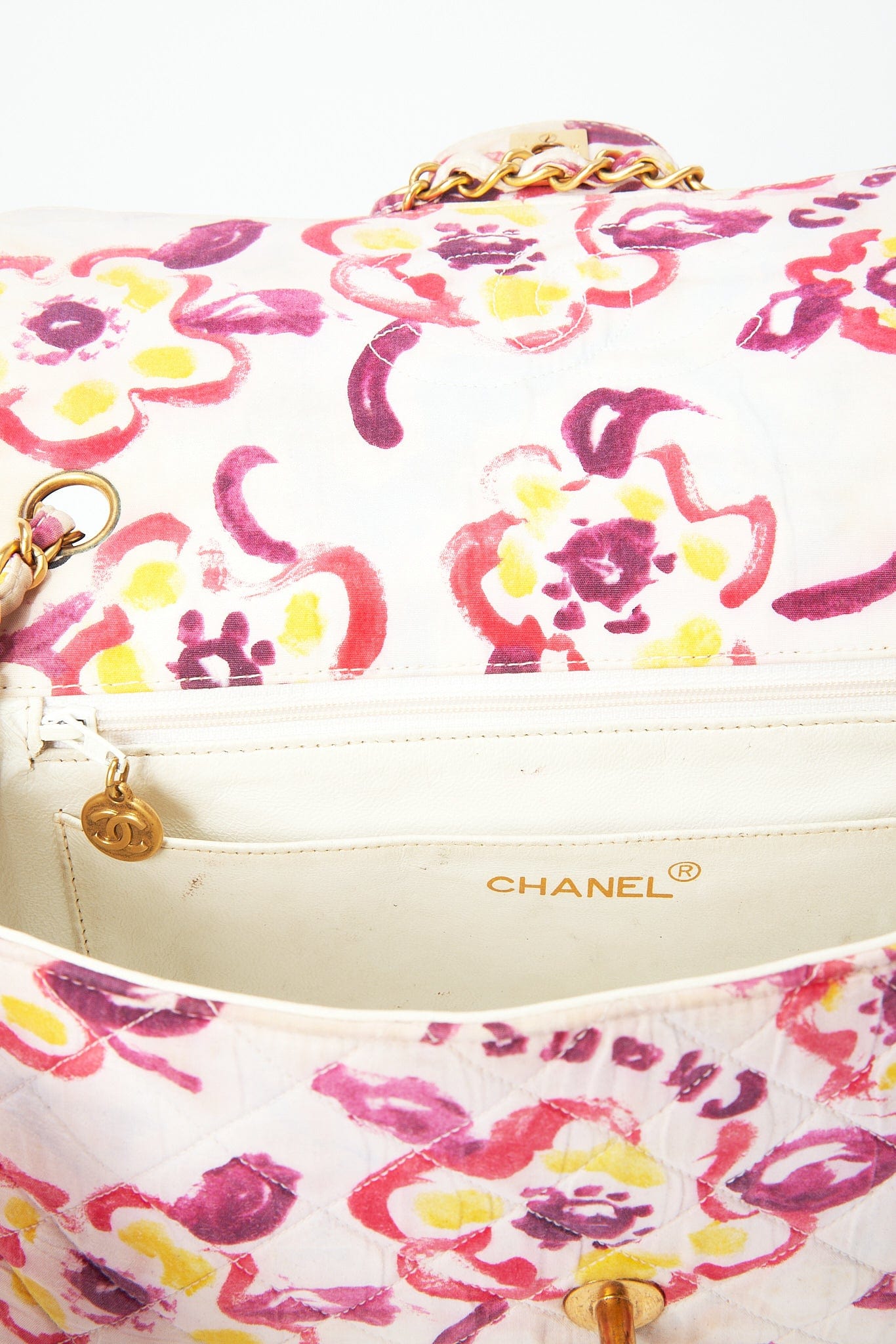 An incredibly beautiful and rare Chanel vintage watercolour floral cotton single flap shoulder bag featuring the sought after 24k gold plated hardware. This bag is lined with white leather and has an internal zipped pocket with CC zip pull, plus a further slip pocket for your valuables.