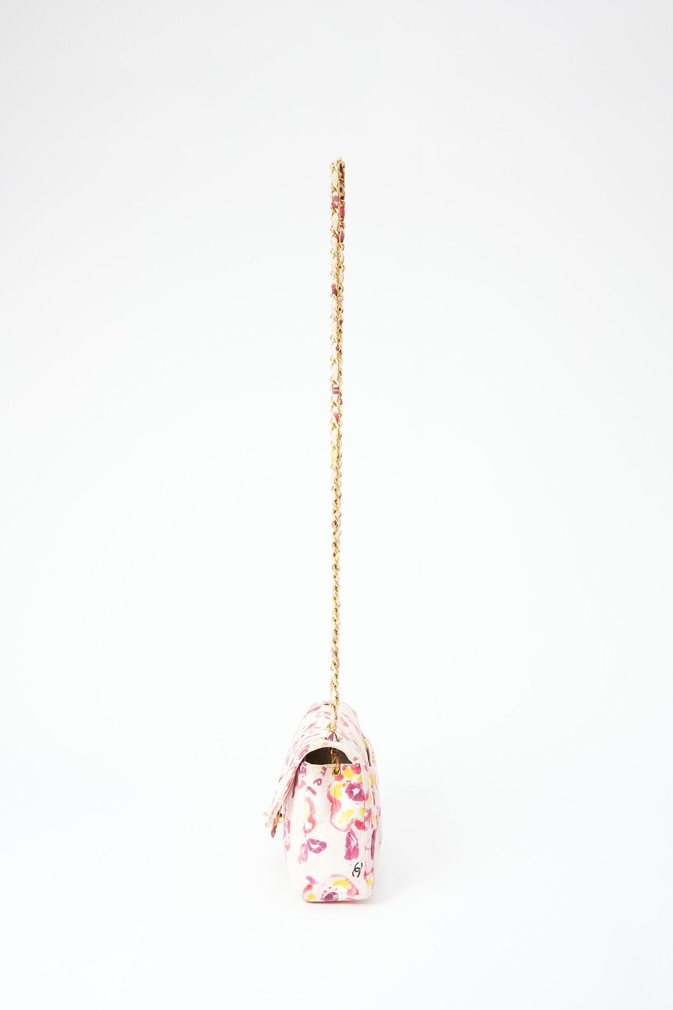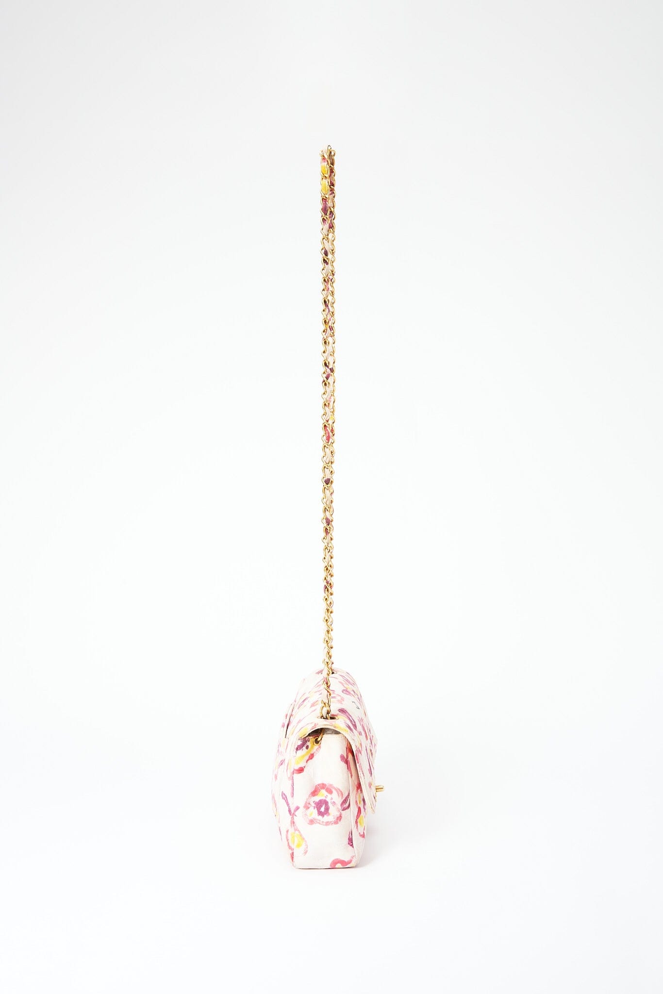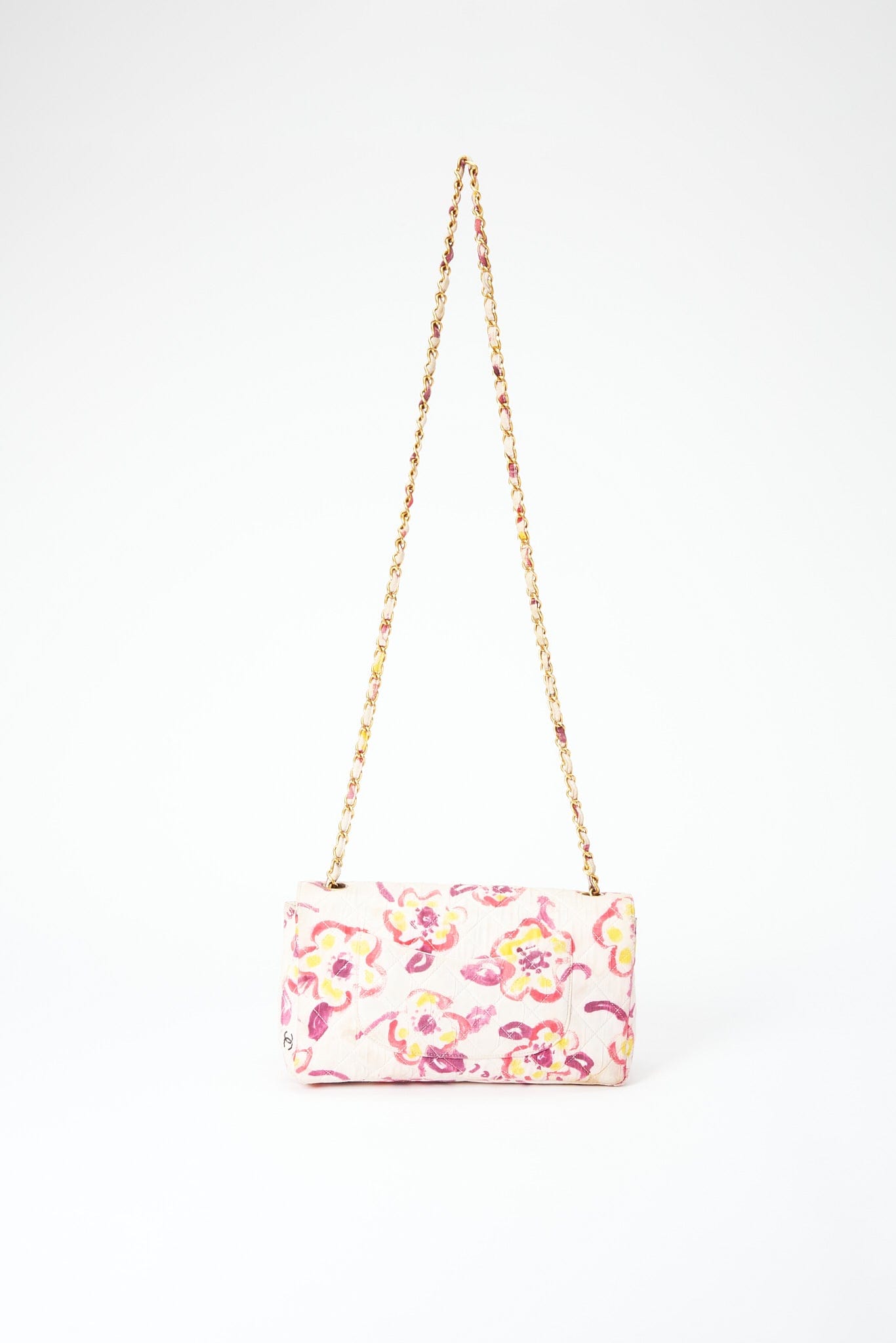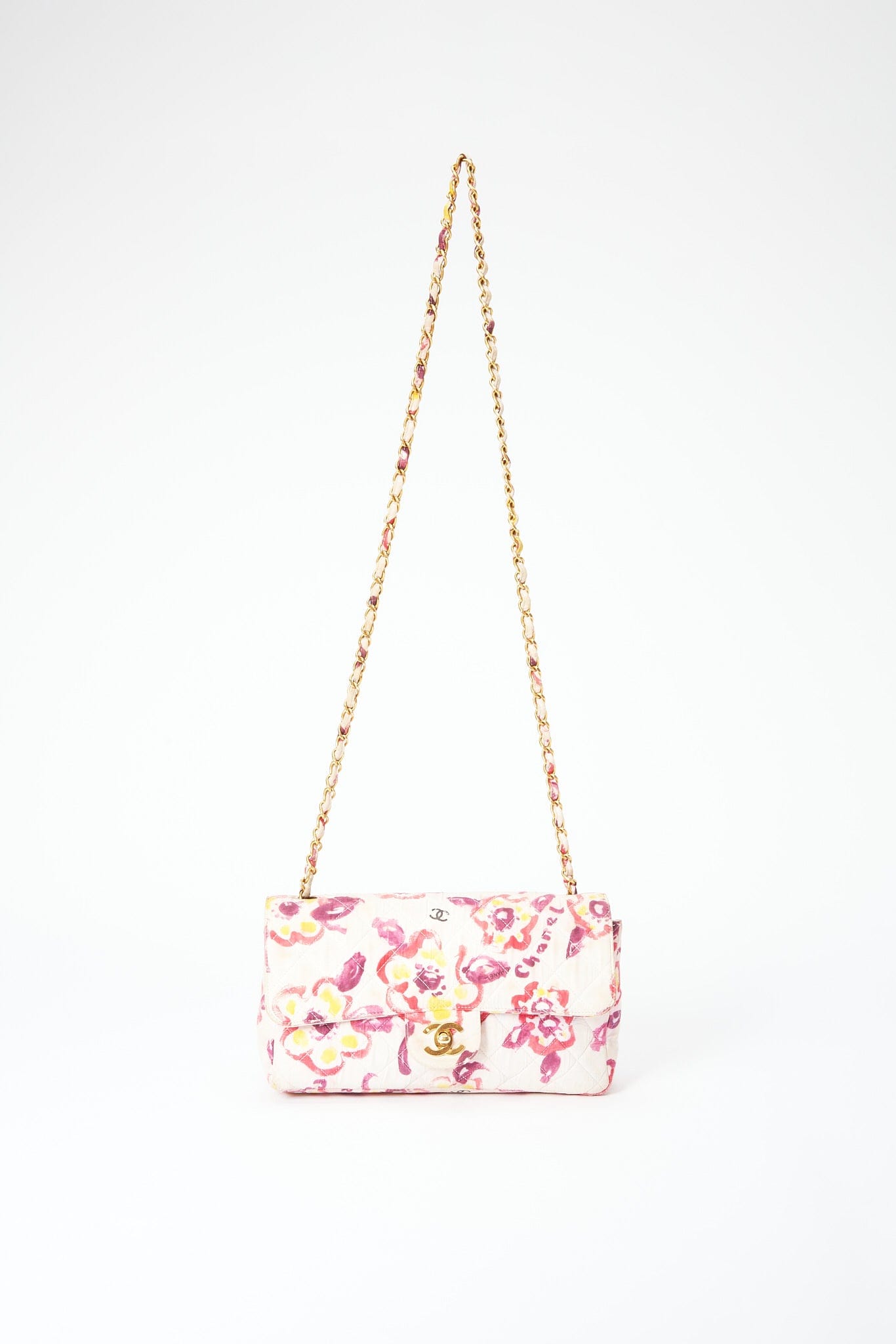 An incredibly beautiful and rare Chanel vintage watercolour floral cotton single flap shoulder bag featuring the sought after 24k gold plated hardware. This bag is lined with white leather and has an internal zipped pocket with CC zip pull, plus a further slip pocket for your valuables.