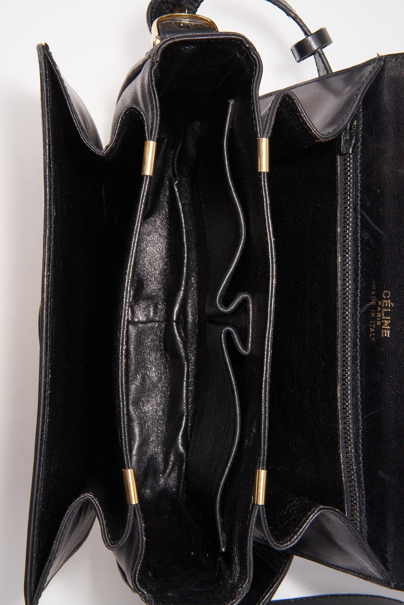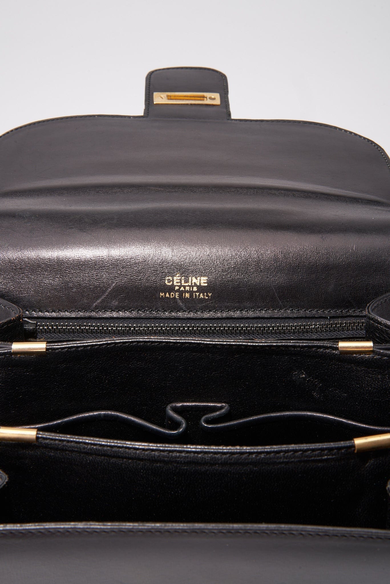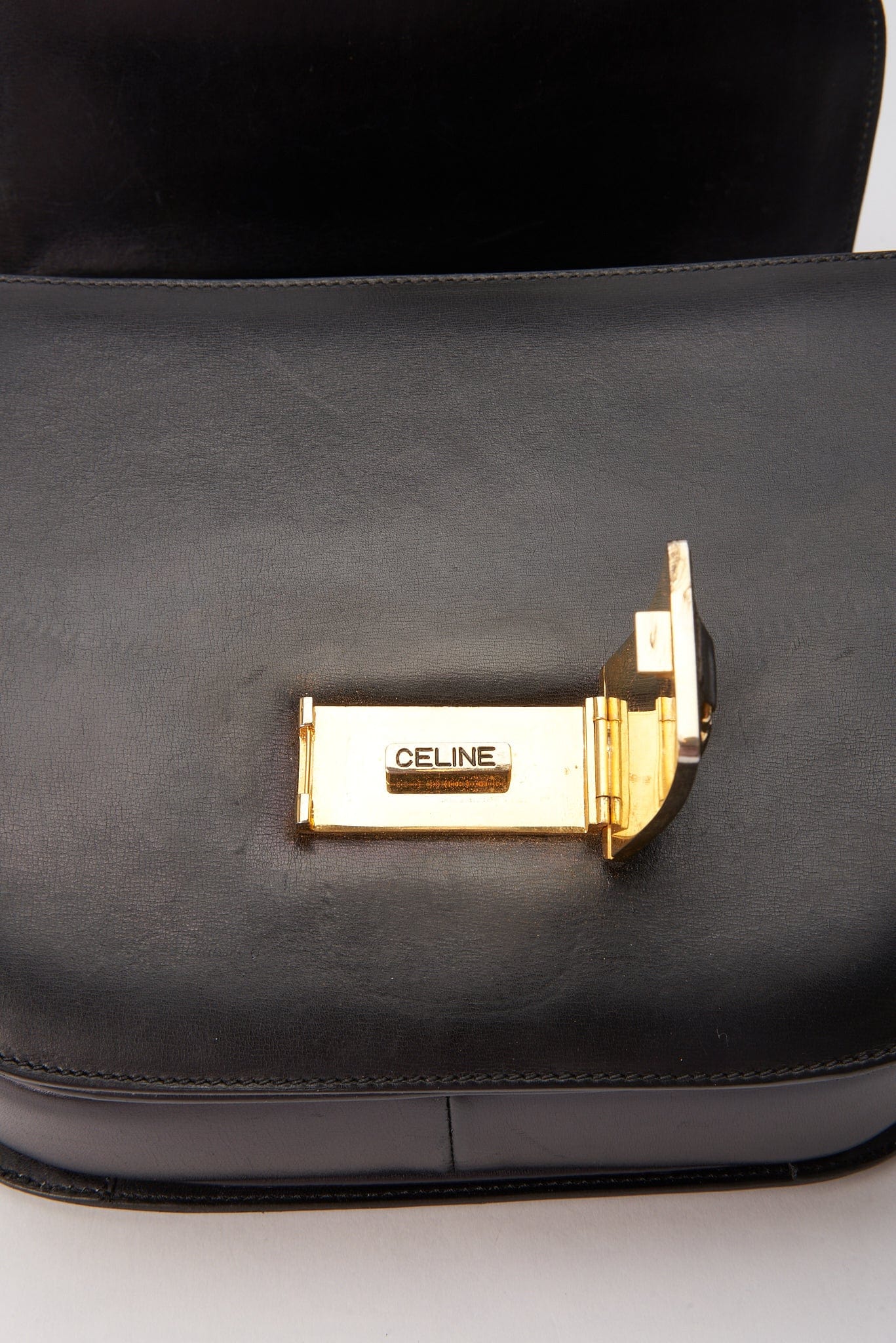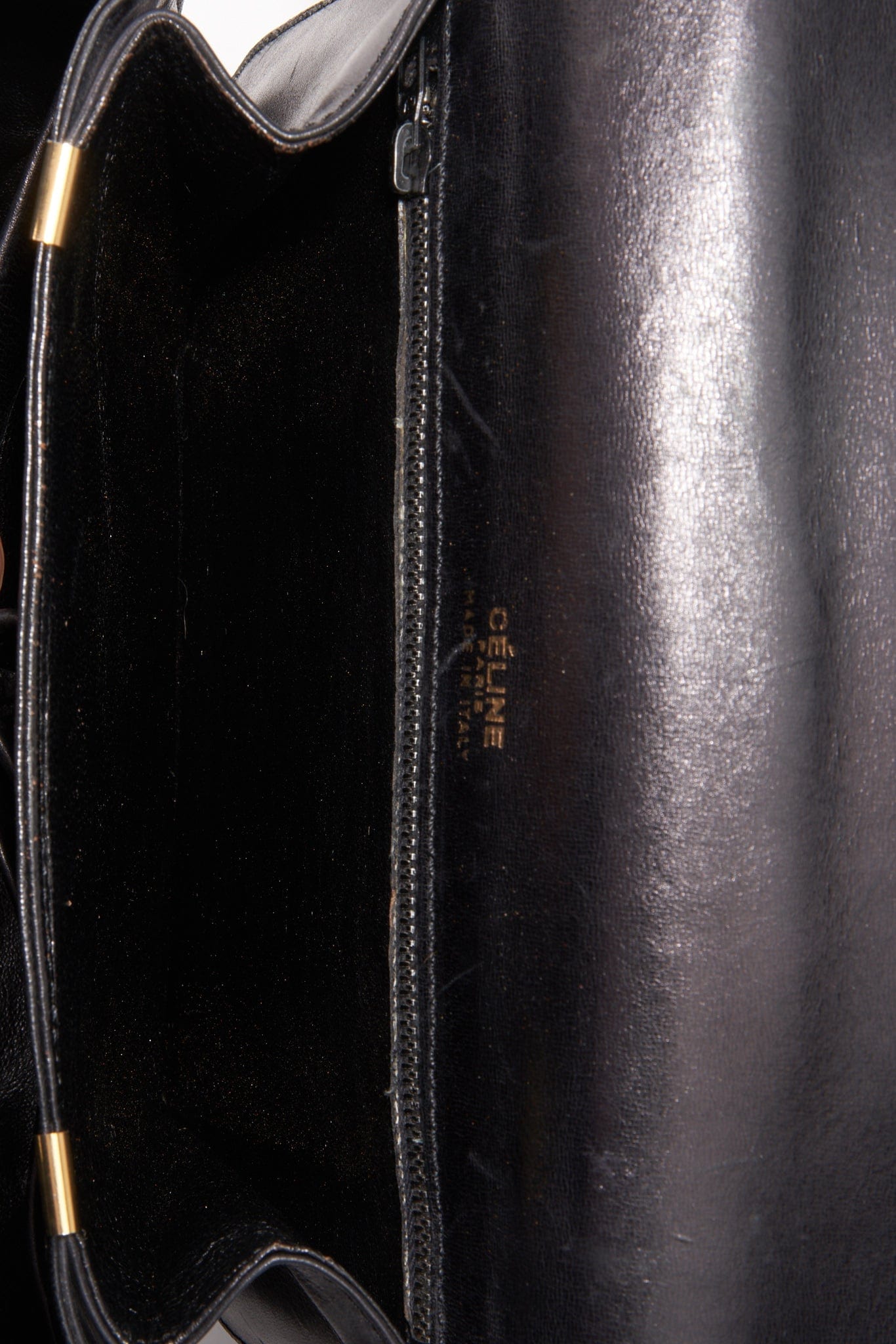 Una impresionante bolsa vintage de caja de cine celine hecha de cuero negro liso con dorado y broche de logotipo.