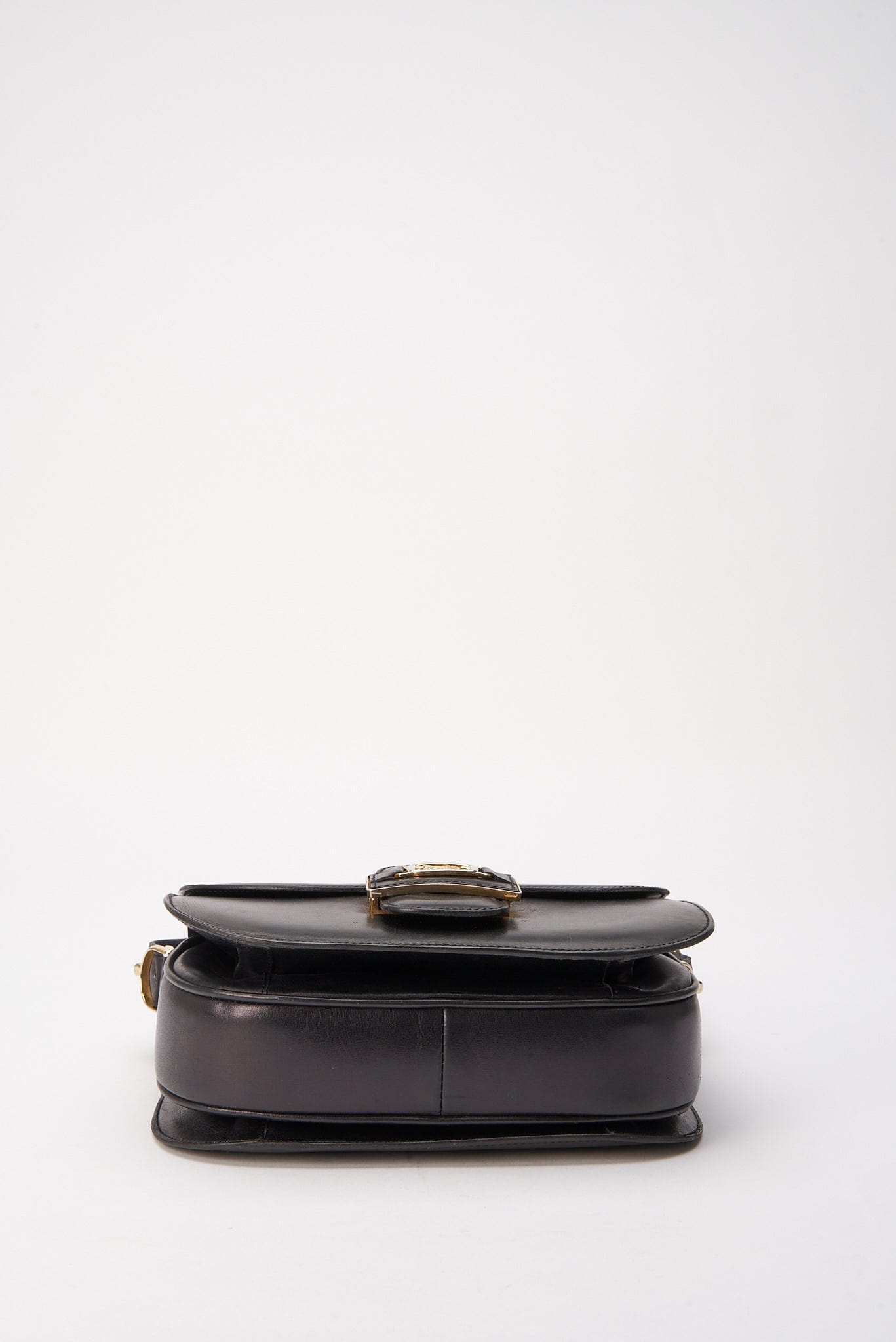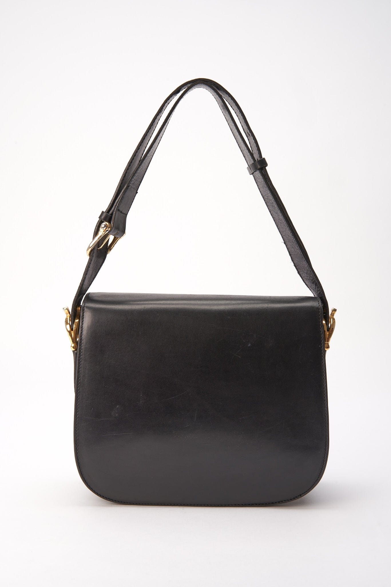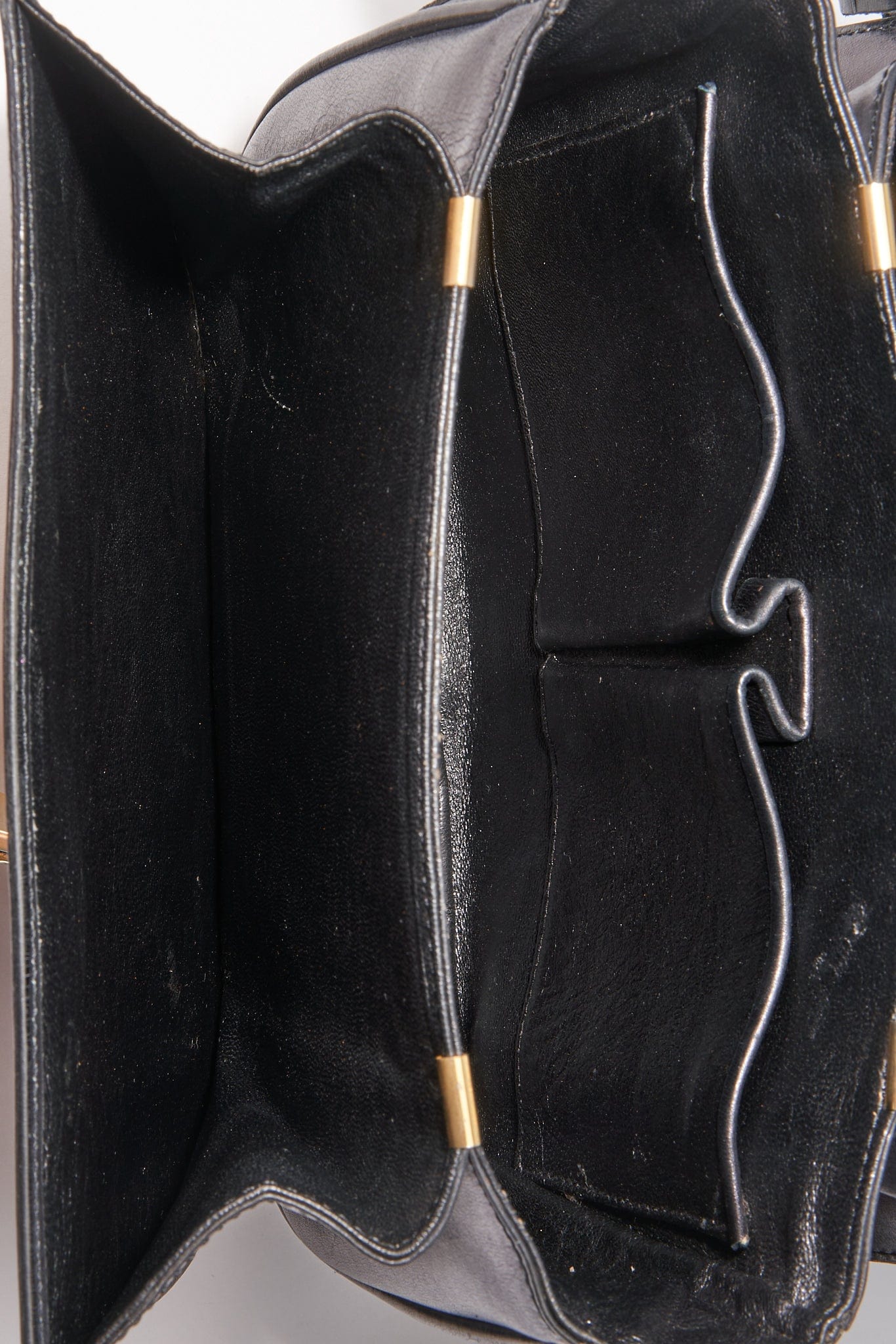 Una impresionante bolsa vintage de caja de cine celine hecha de cuero negro liso con dorado y broche de logotipo.