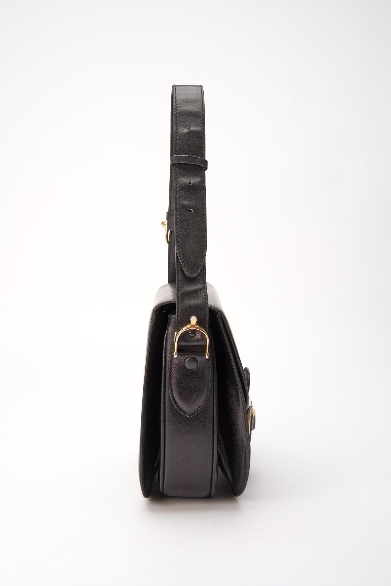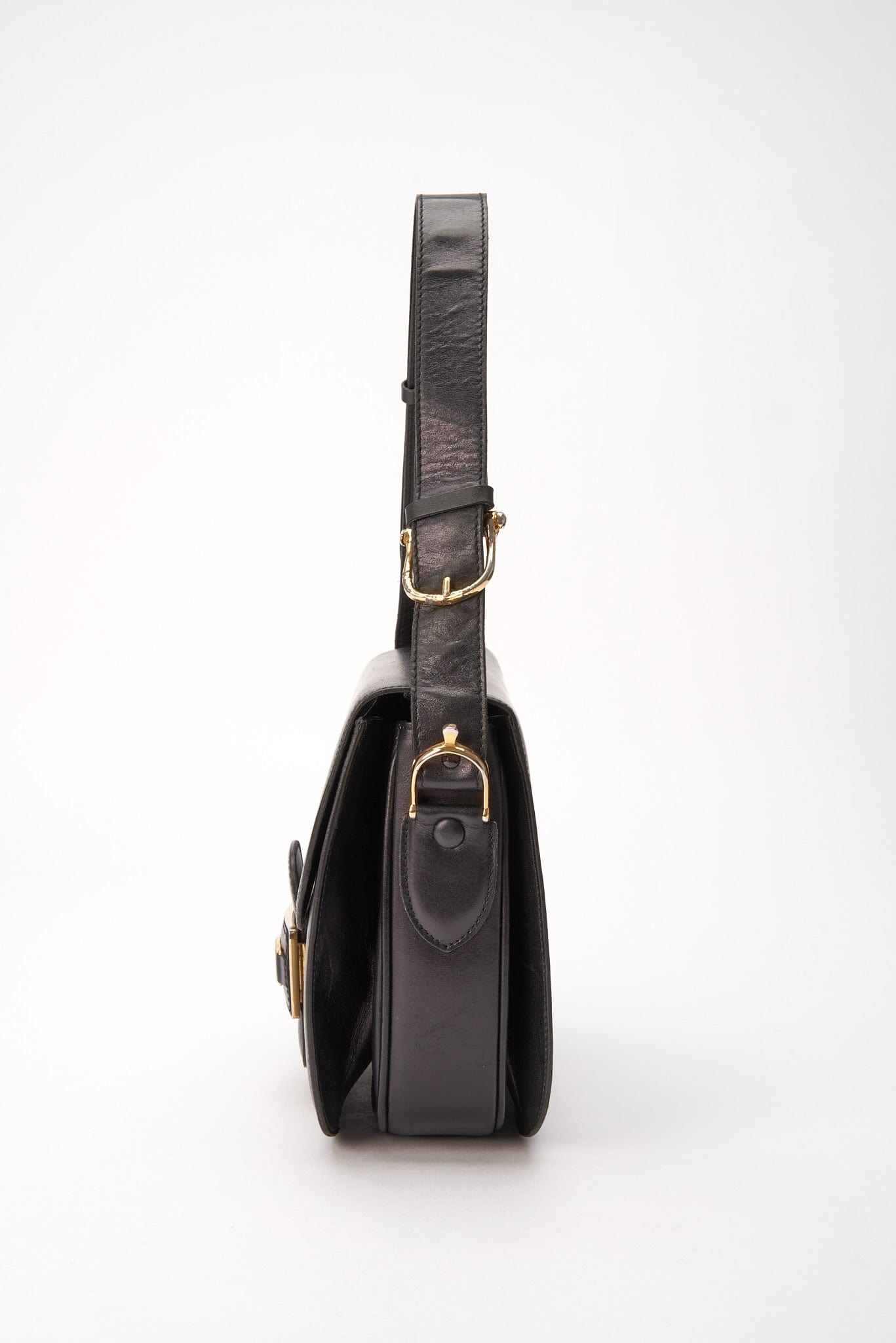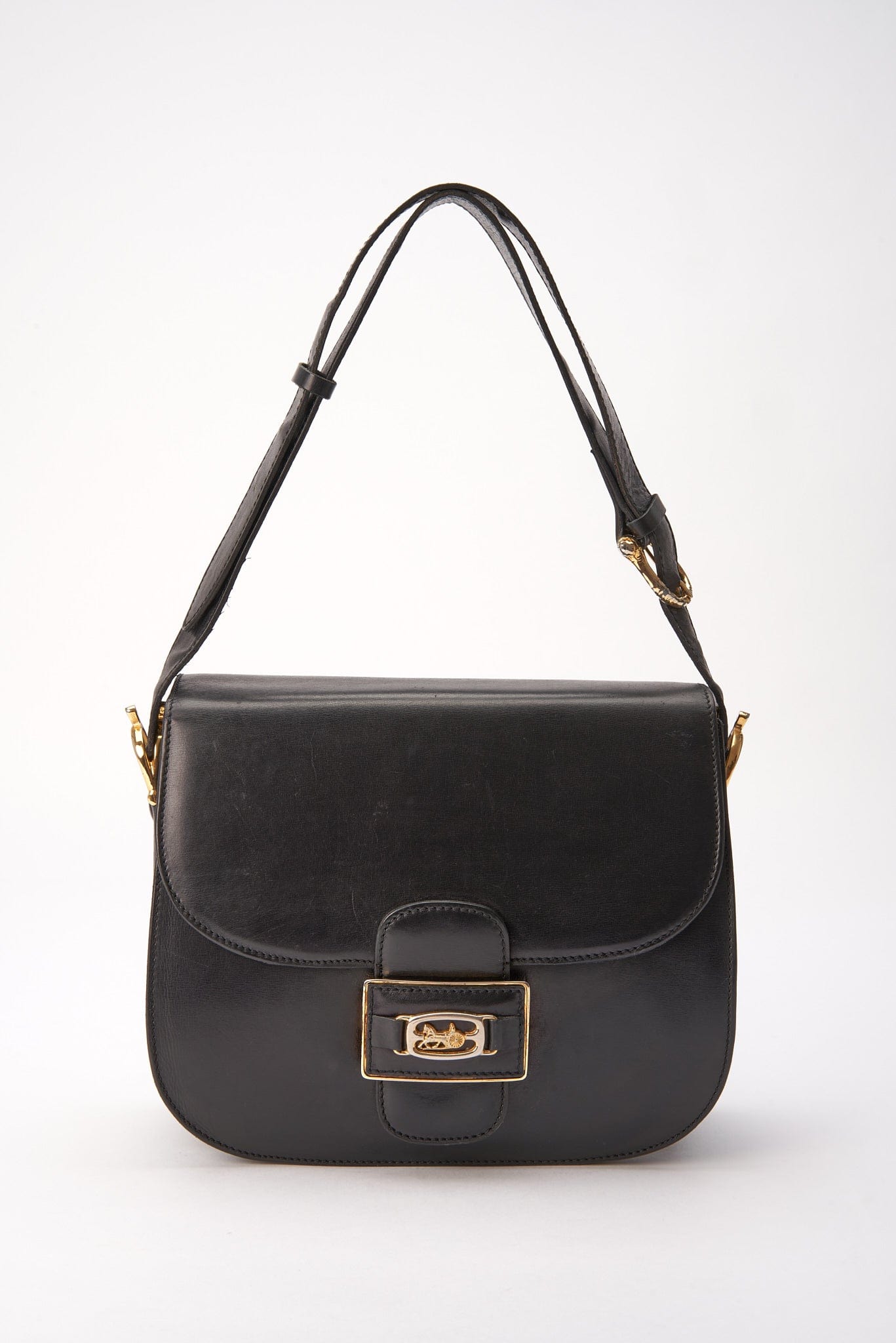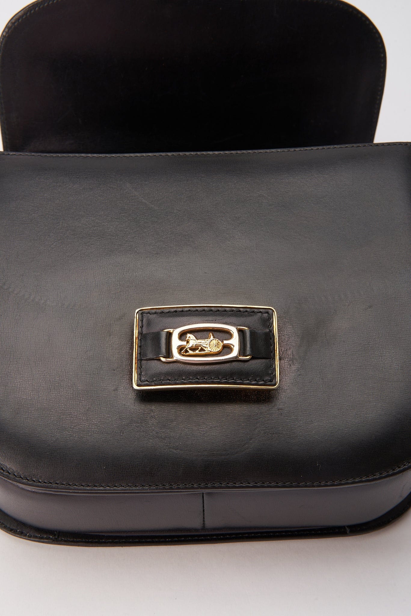 Una impresionante bolsa vintage de caja de cine celine hecha de cuero negro liso con dorado y broche de logotipo.