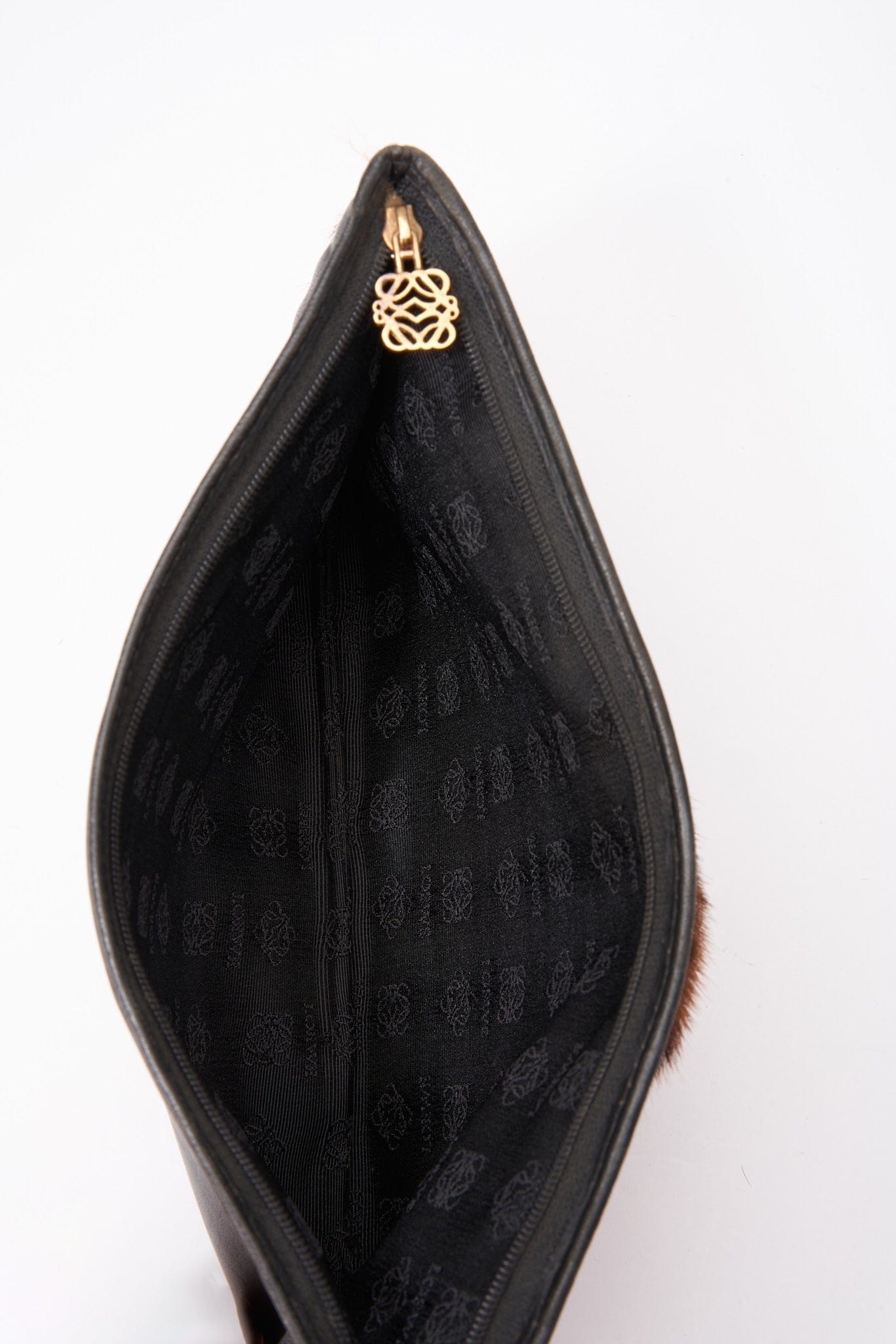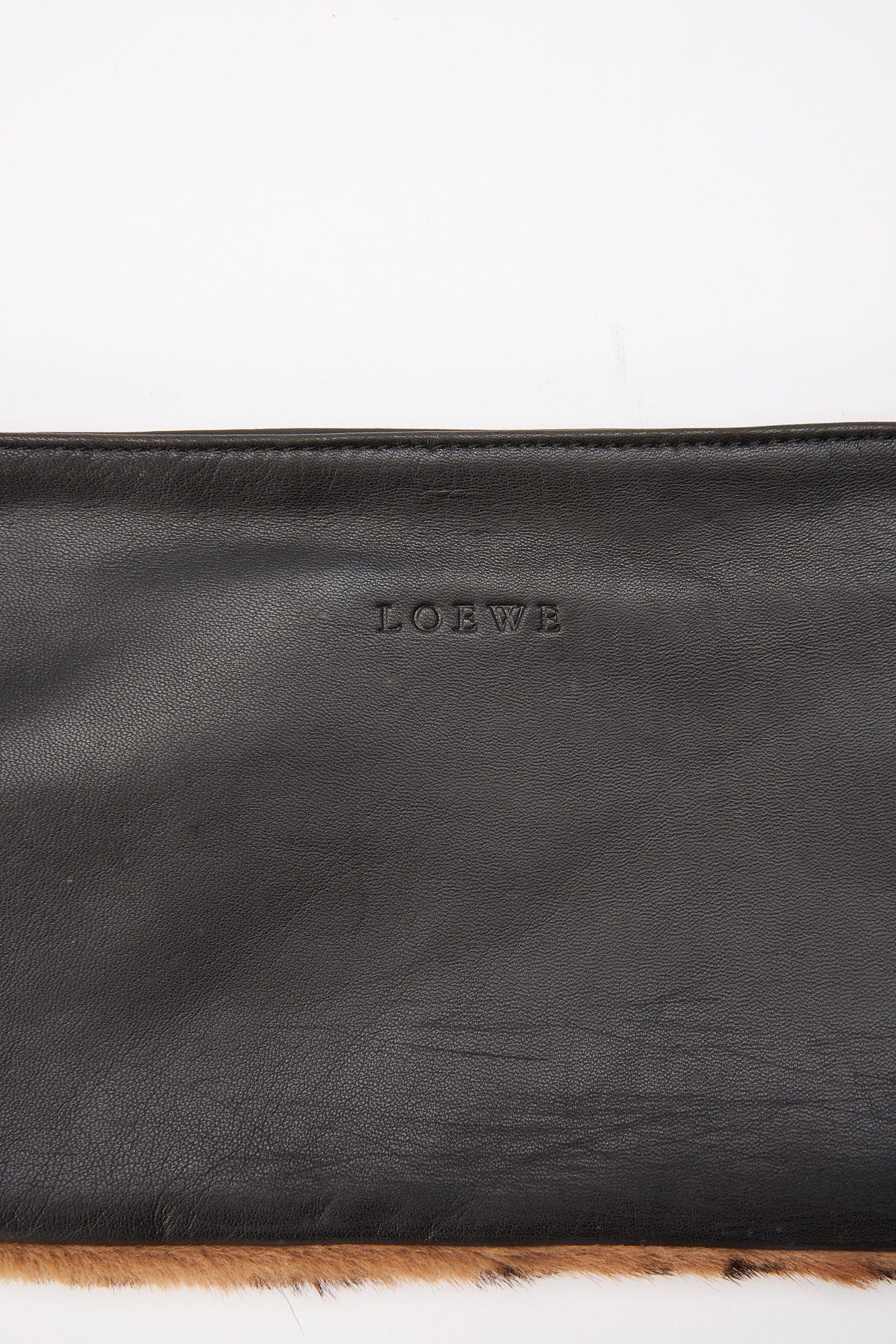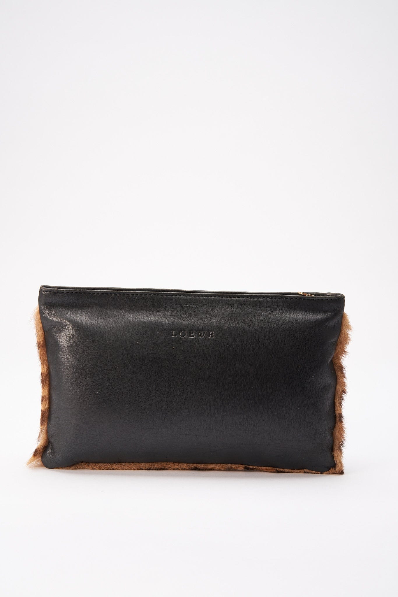 Una bolsa de embrague Loewe súper genial hecha de un hermoso cabello de pantorrilla estampado con leopardo con molduras de cuero negro.