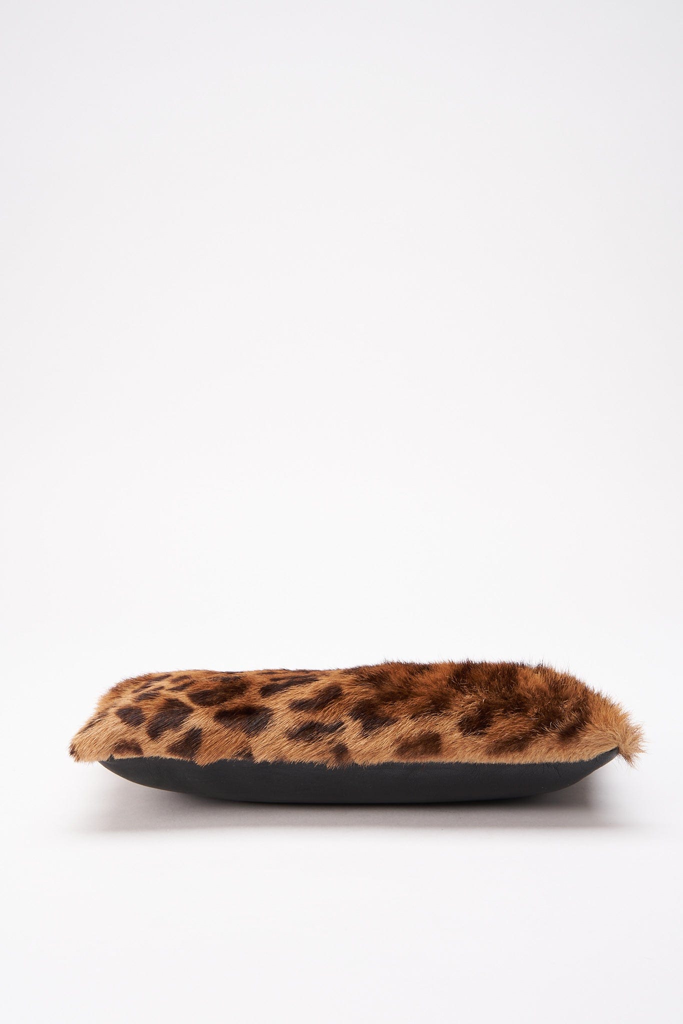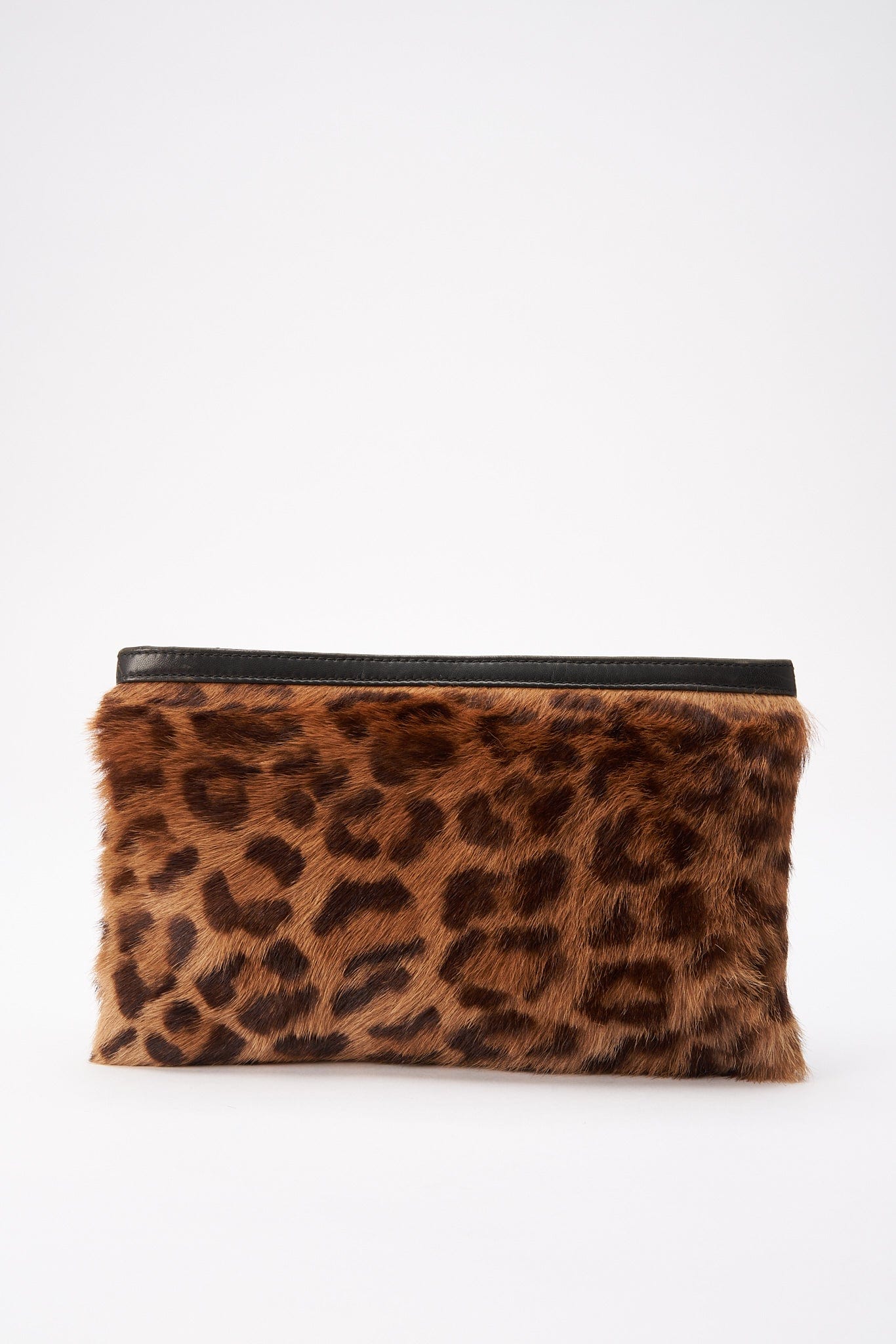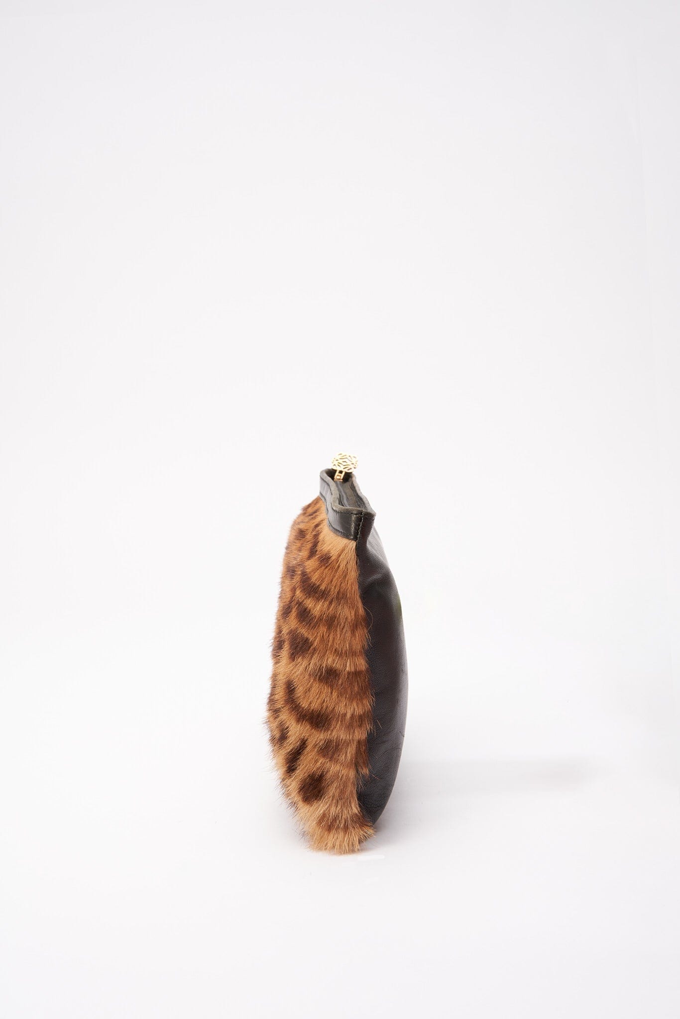 Una bolsa de embrague Loewe súper genial hecha de un hermoso cabello de pantorrilla estampado con leopardo con molduras de cuero negro.