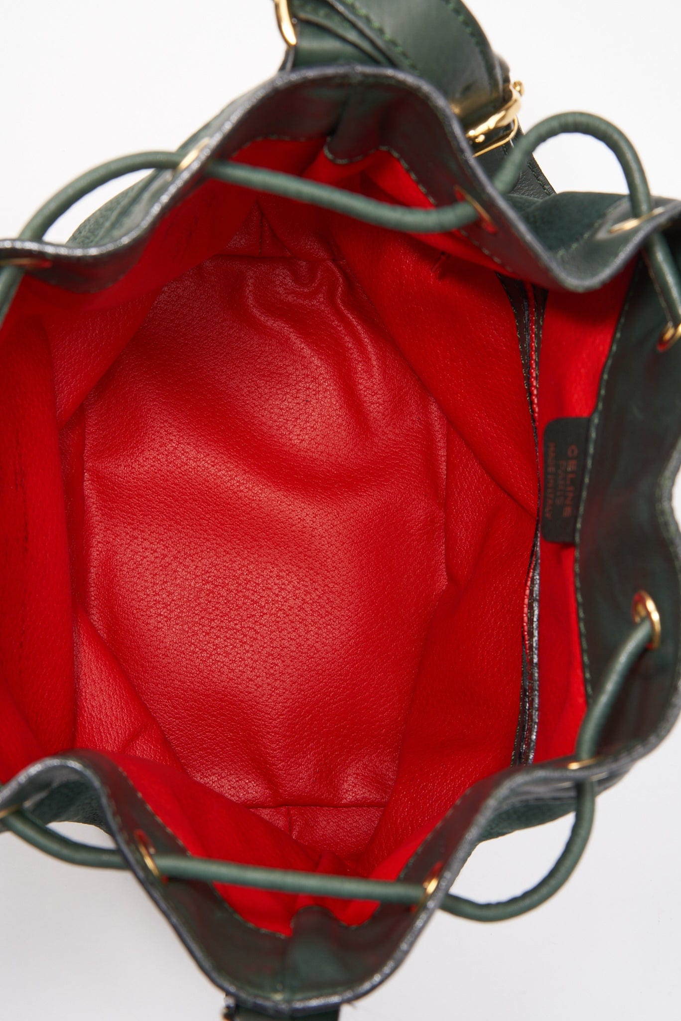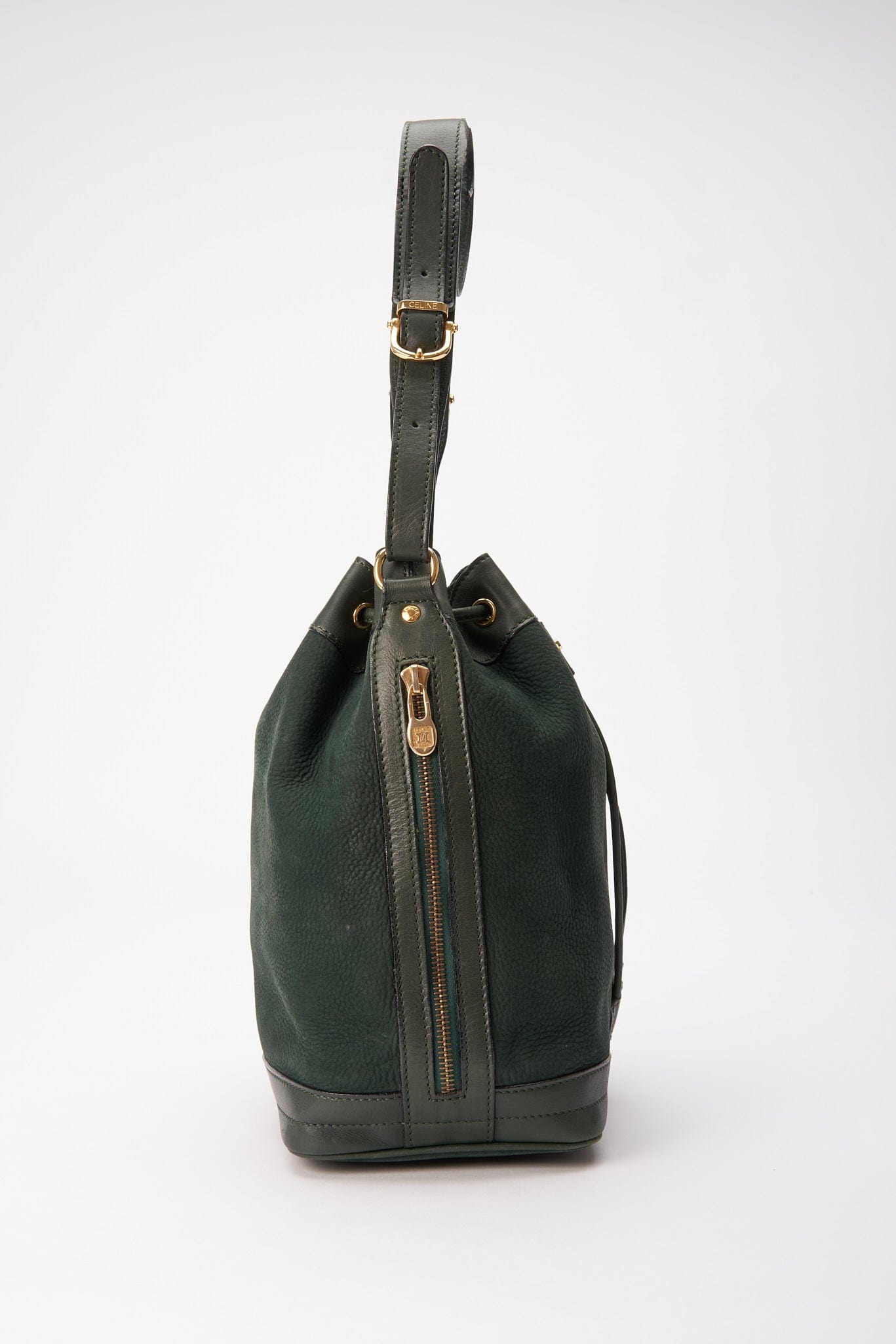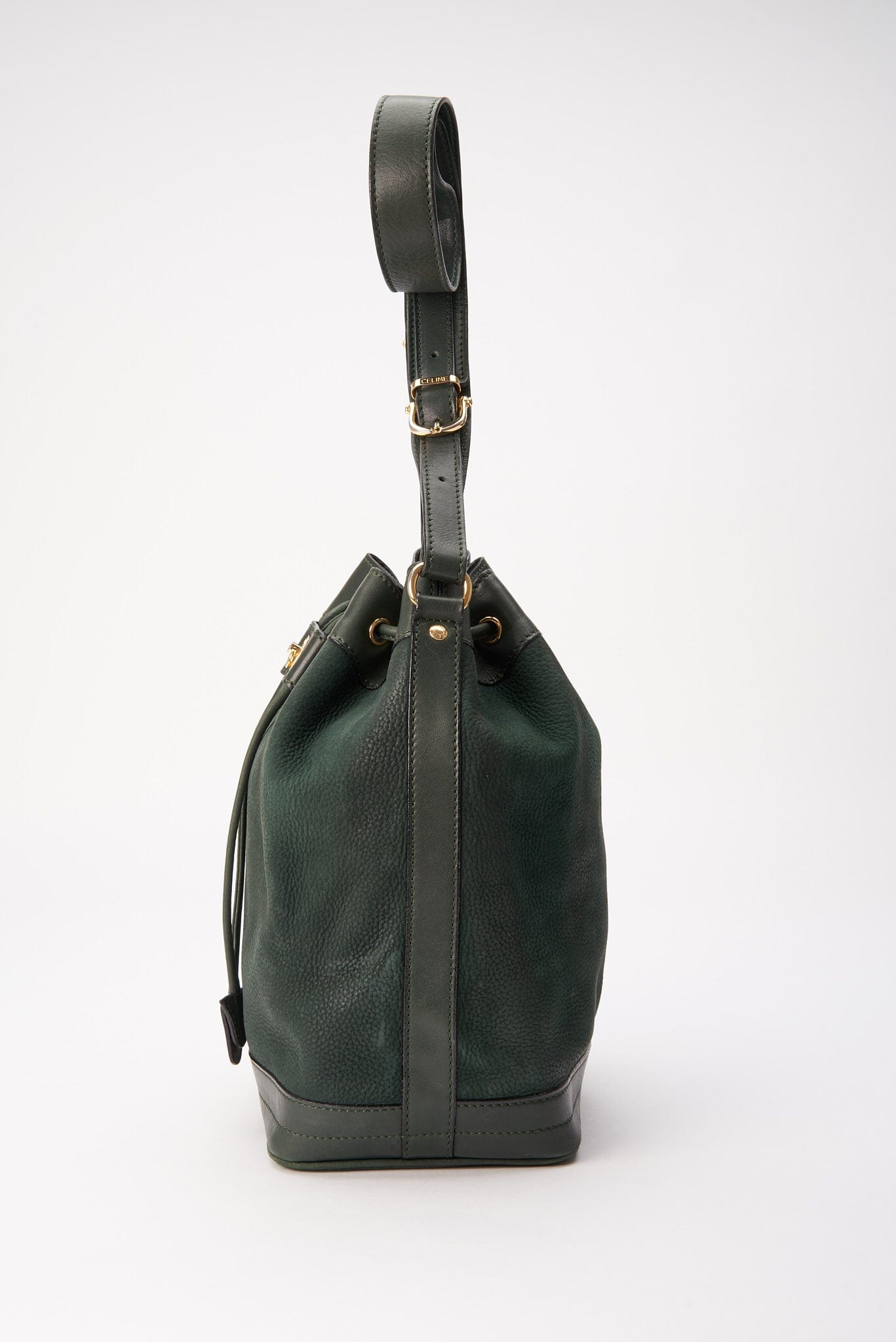 Una elegante bolsa de bucket Celine de gamuza y cuero con hardware dorado Celine.