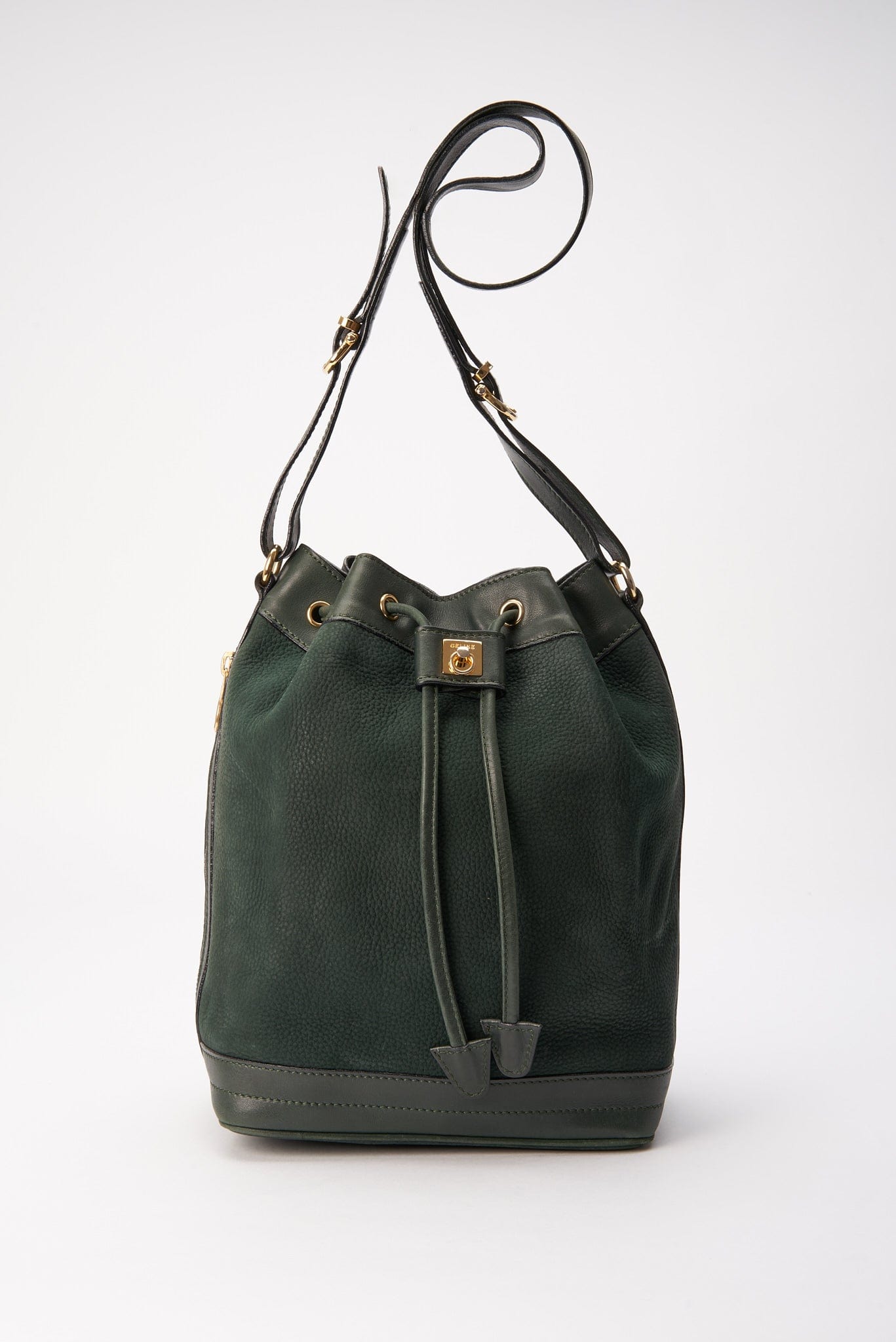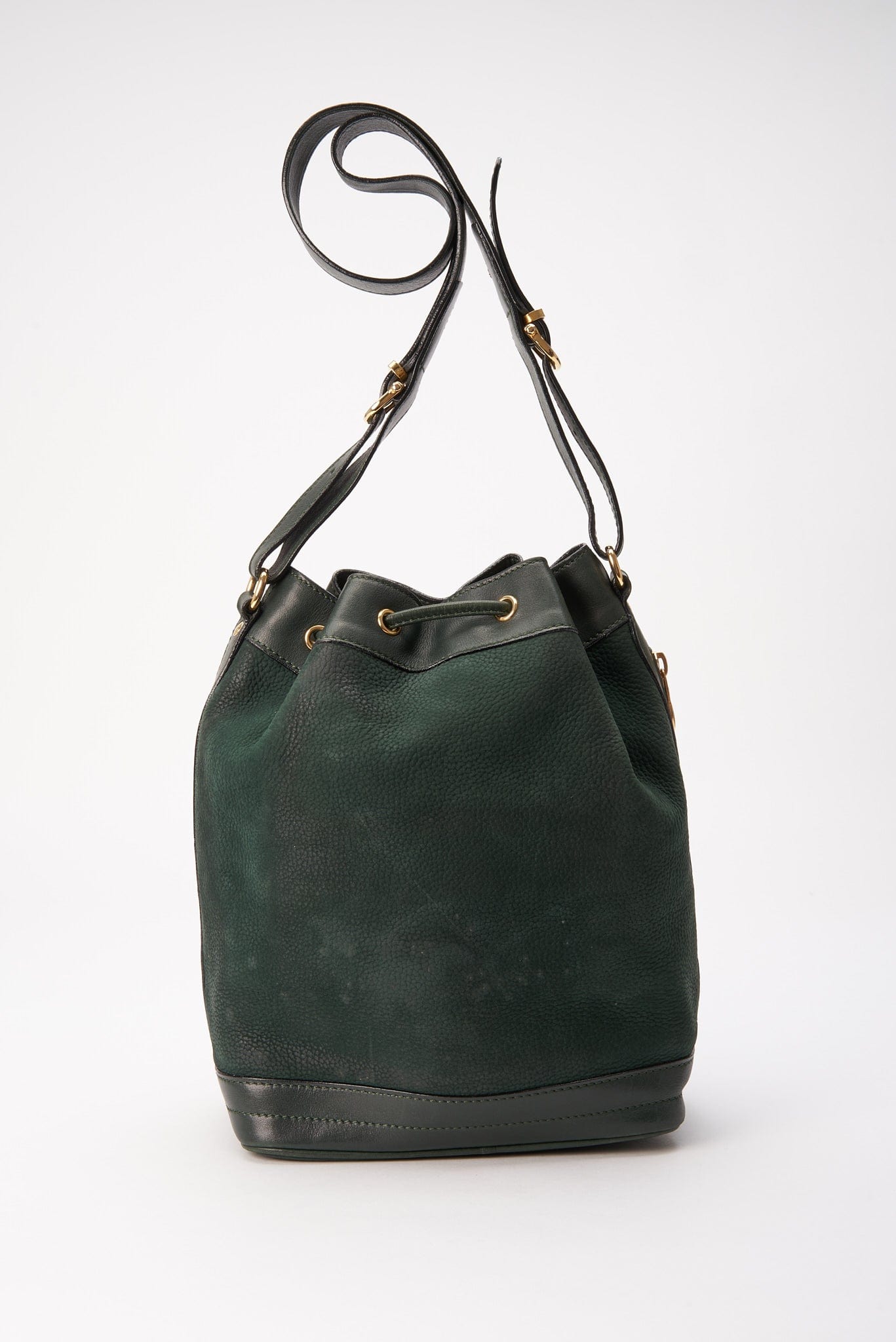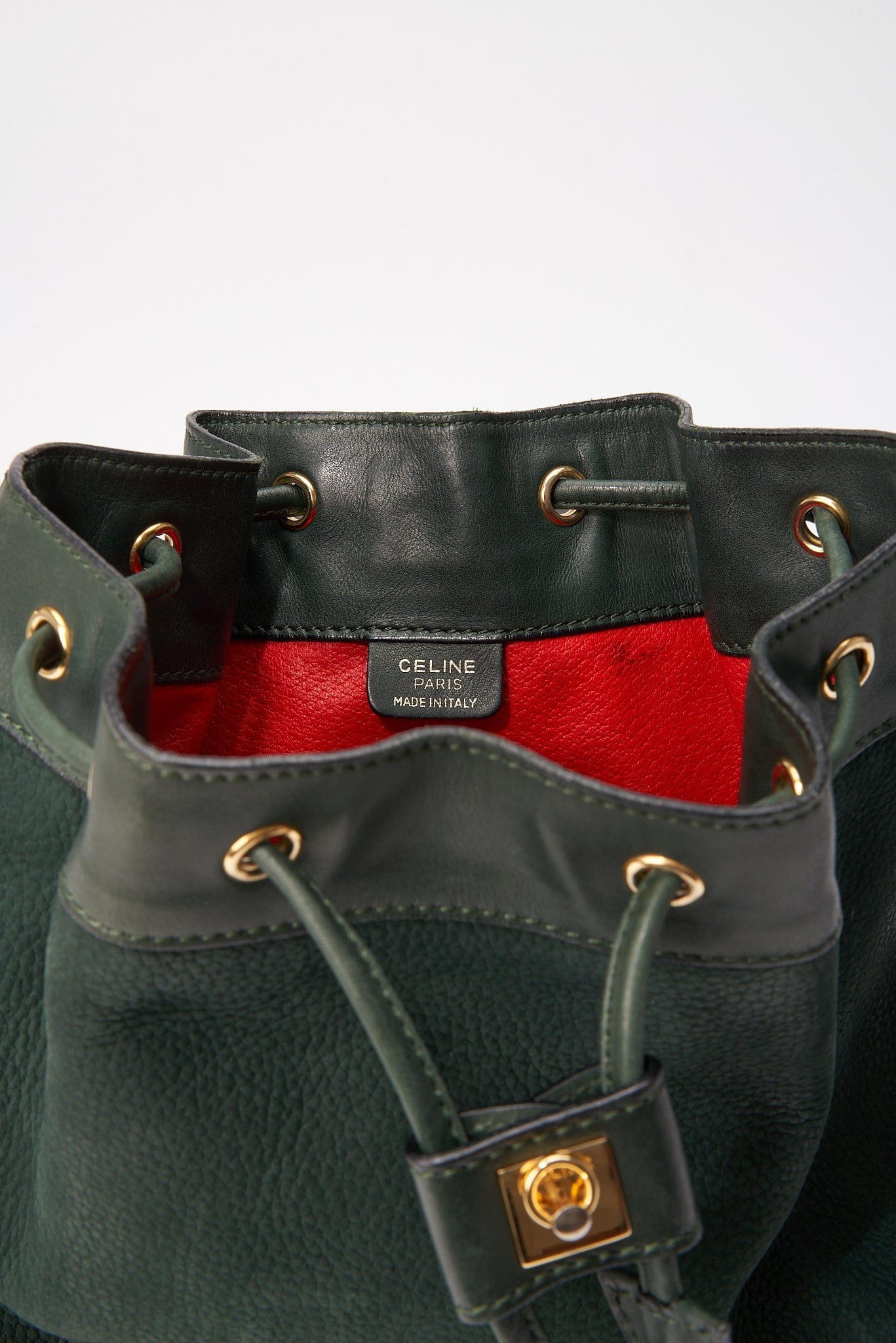 Una elegante bolsa de bucket Celine de gamuza y cuero con hardware dorado Celine.