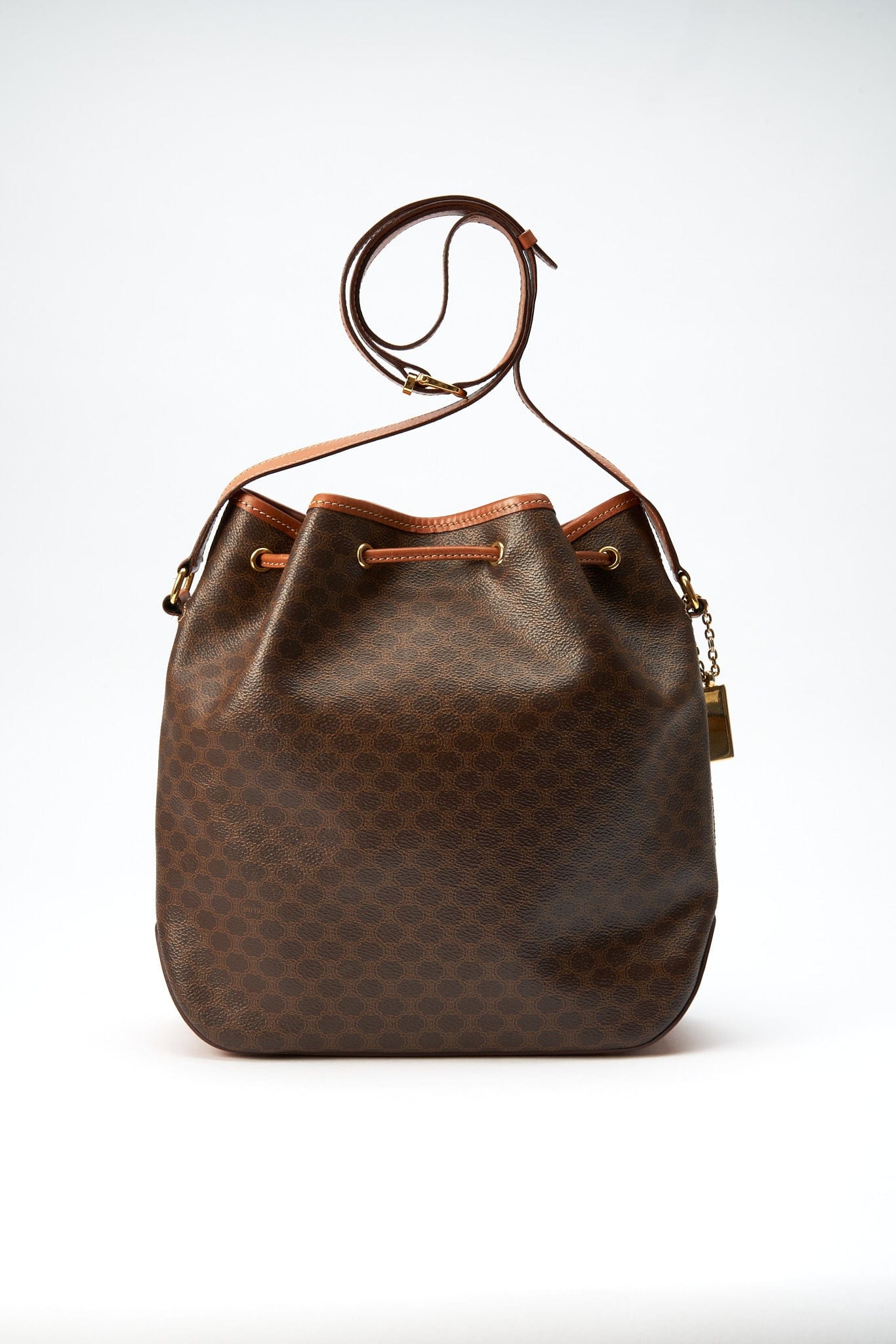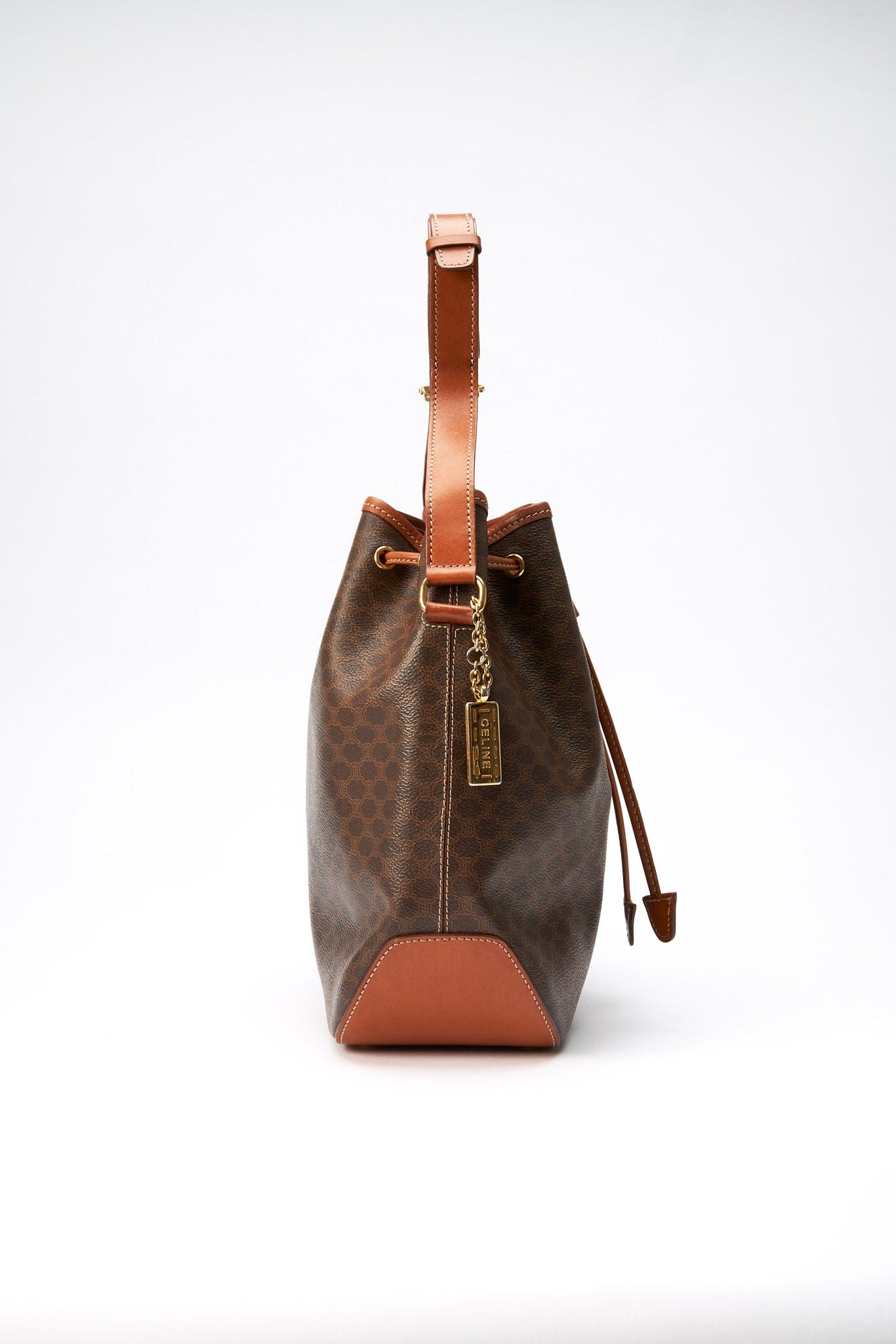 Un lienzo elegante y una bolsa de cubo Celine vintage de cuero con hardware dorado Celine.