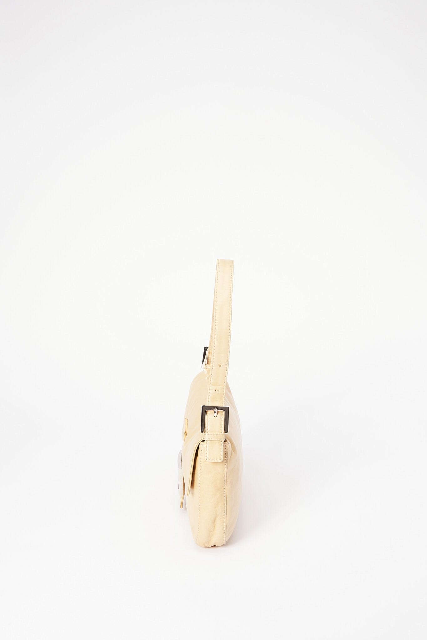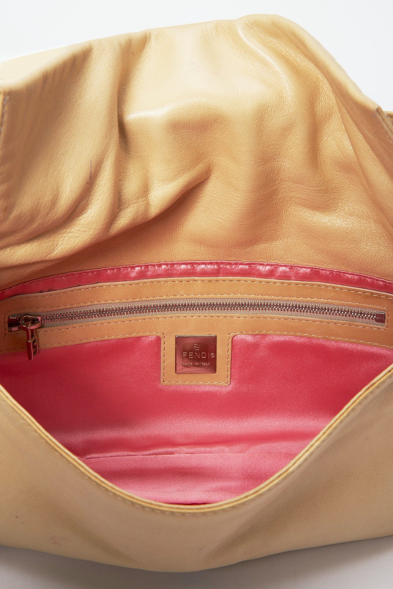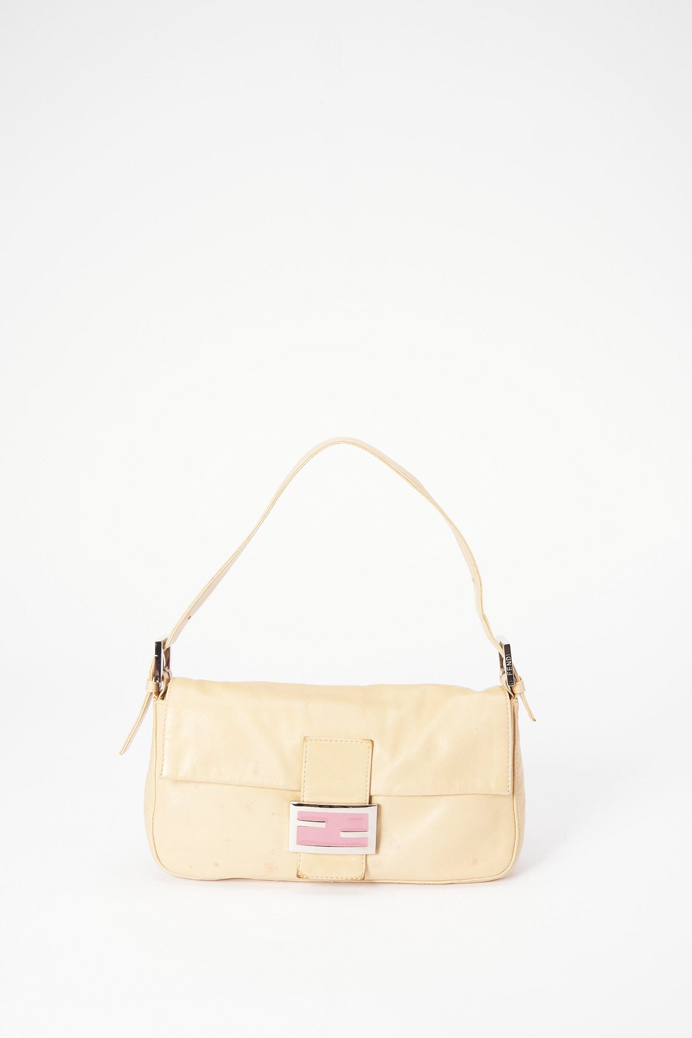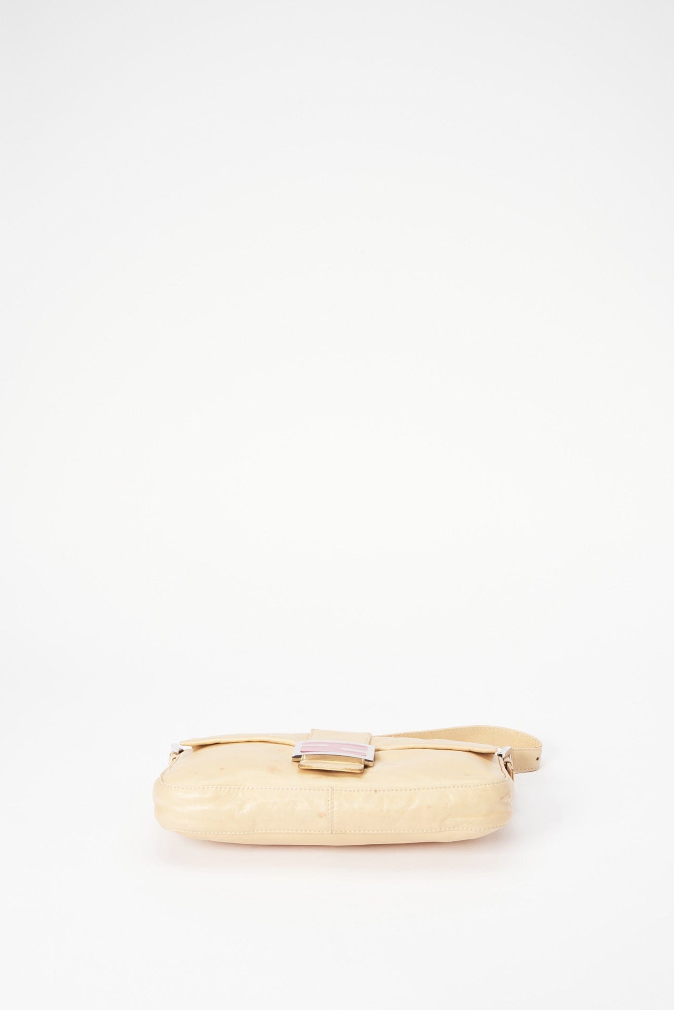 Un bolso clásico de hombro Fendi Baguette hecho de cuero de crema suave y mantecoso con detalles de cierre de esmalte rosado.