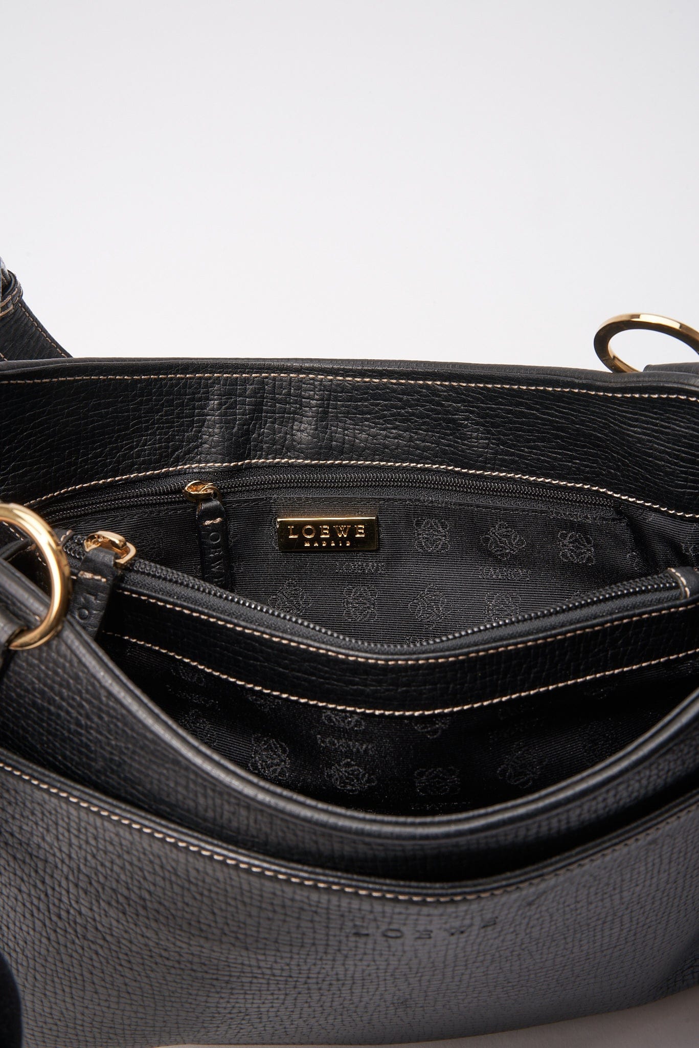 Un bolso de hombro vintage vintage atemporal hechos a partir de un cuero negro texturizado, costuras de contraste con hardware de oro de la marca Loewe.