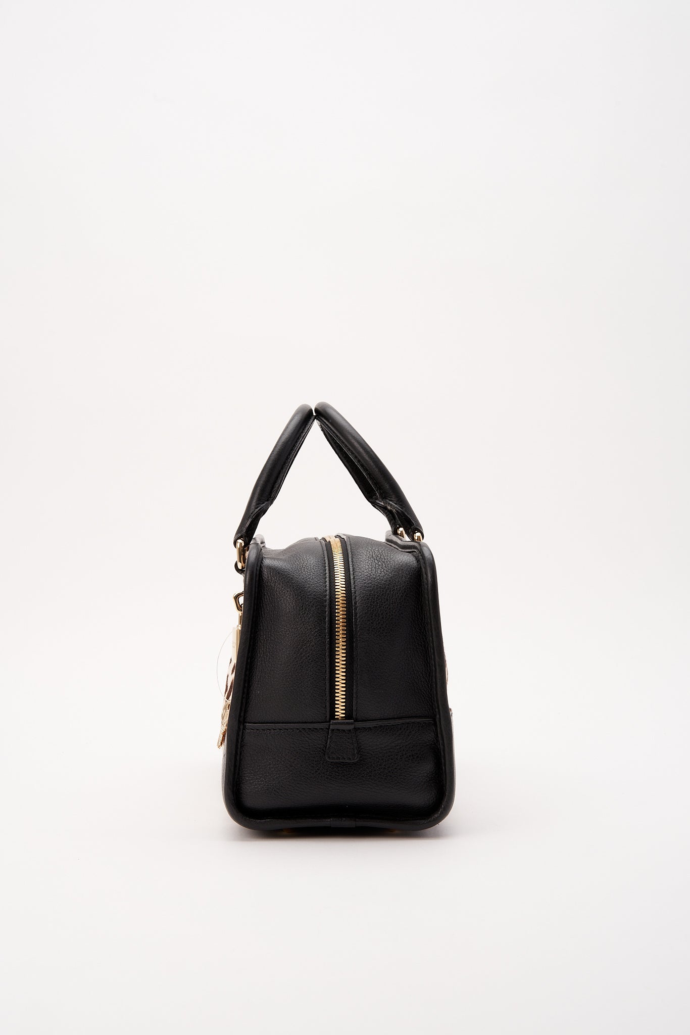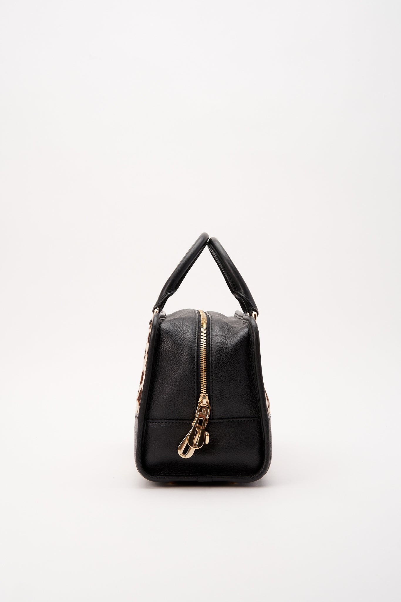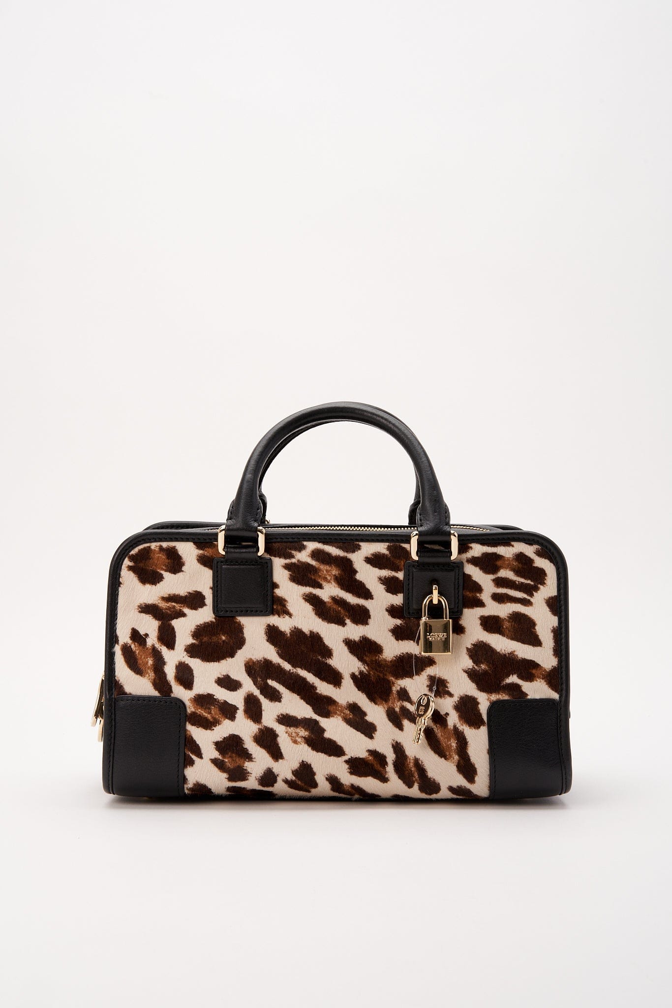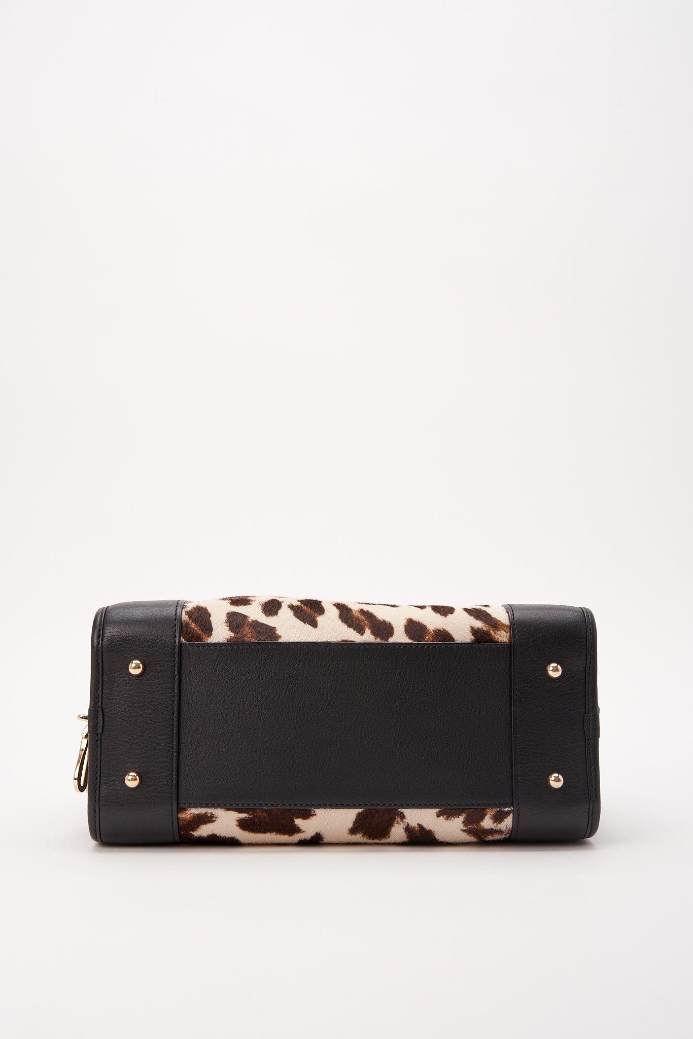 Cabello de pantorrilla estampado con leopardo, mezclado con cuero negro y hardware dorado. Cadera y llaves también incluidas.