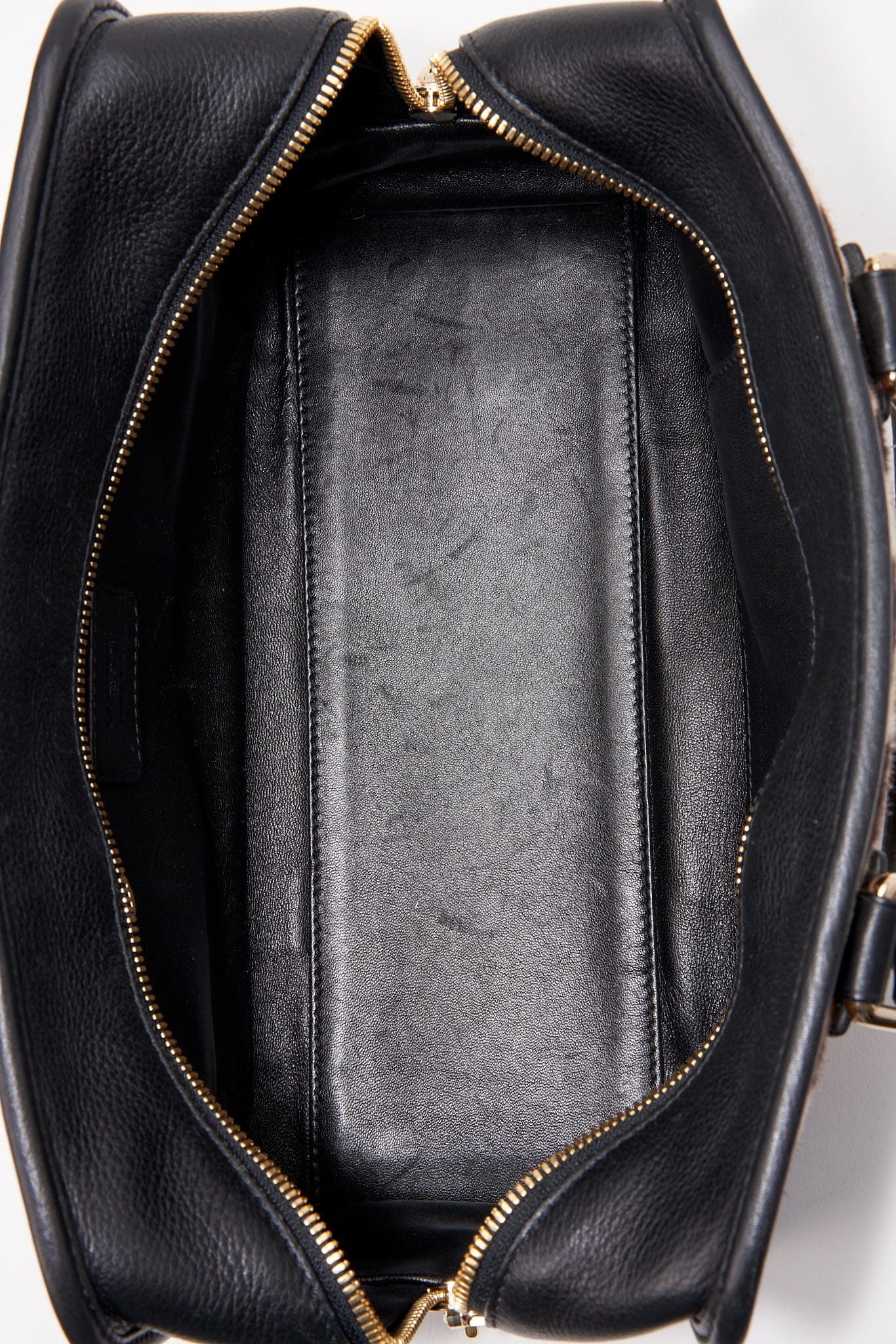 Dentro de la bolsa está forrada con un cuero negro súper suave y hay un bolsillo con cremallera para sus objetos de valor.