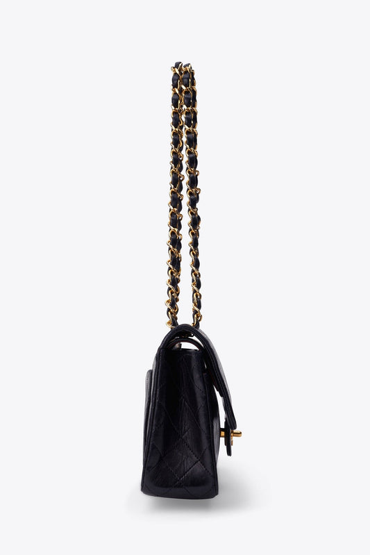 Borsa a doppia patta Chanel vintage Classica a doppia lettina in pelle di agnello nero con hardware oro 24k oro
