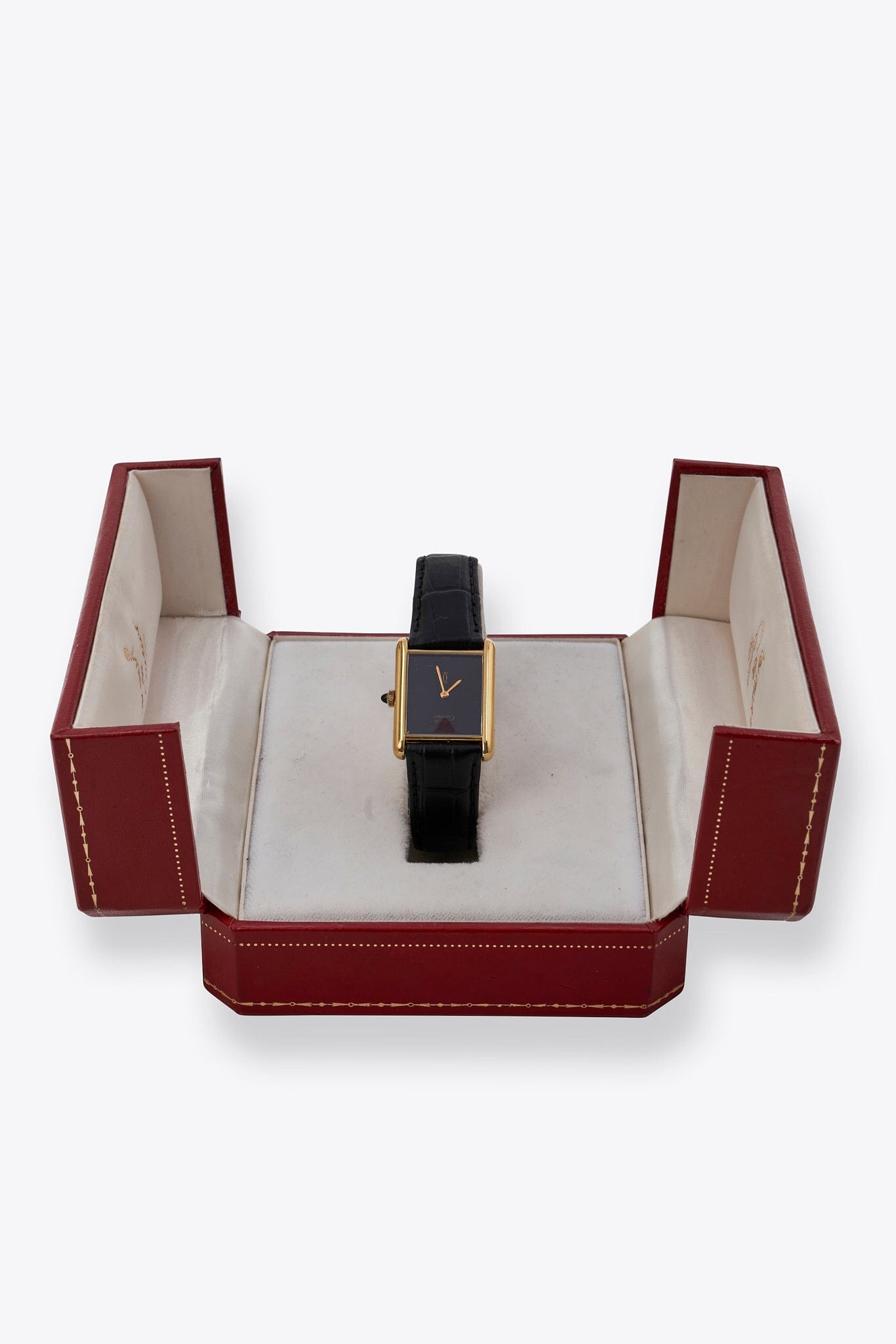 This vintage Cartier Tank from the 1990s is a beautifully preserved timepiece with a classic design. It features a clean black dial adorned with golden hands and a matching gold font and logo, creating a beautiful contrast.