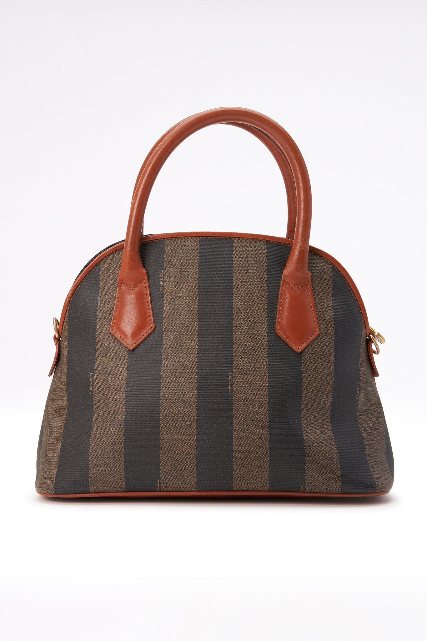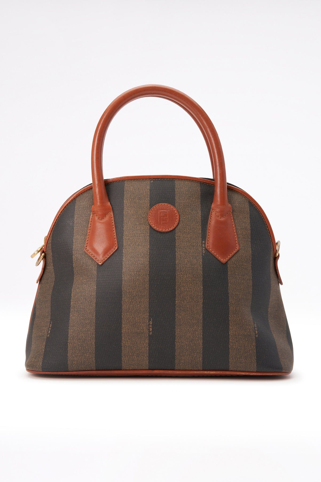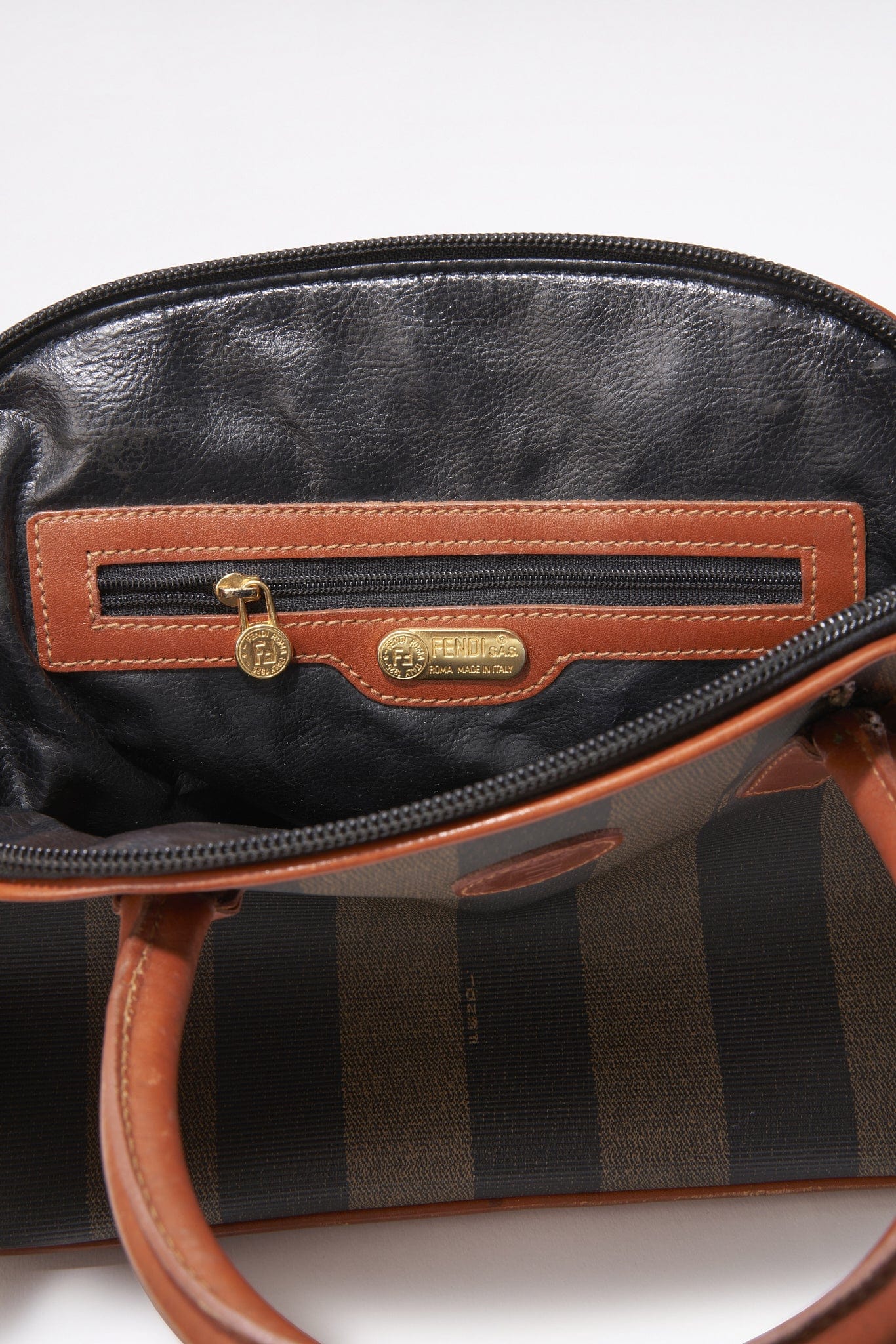 A vintage Fendi bag crafted from a striped coated canvas with tan leather top handles and Fendi branded gold hardware. Comes with a detachable crossbody strap