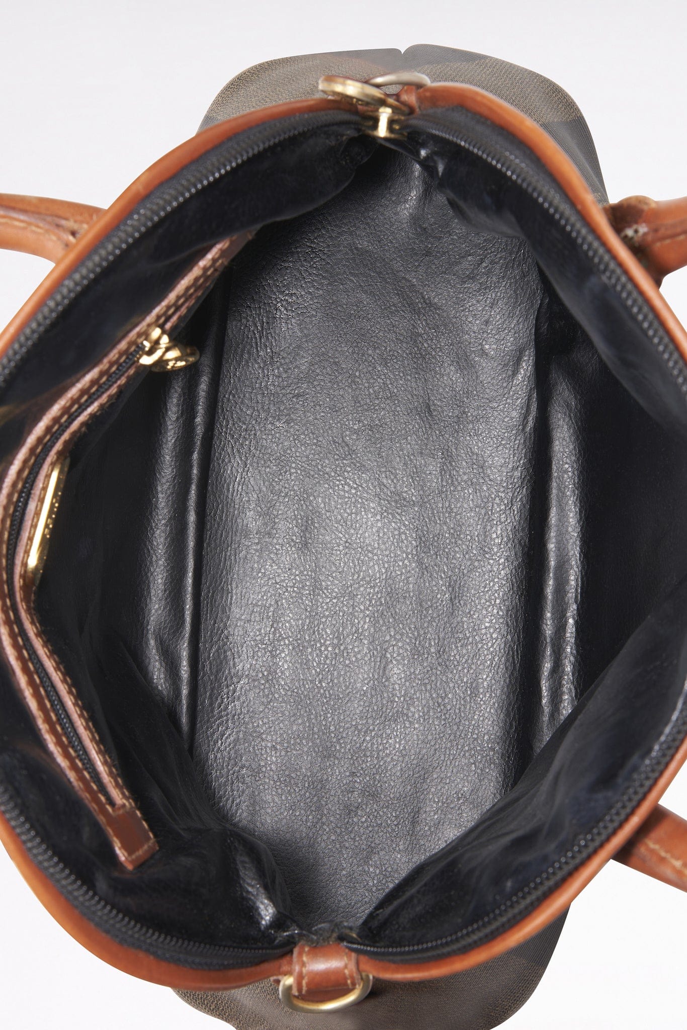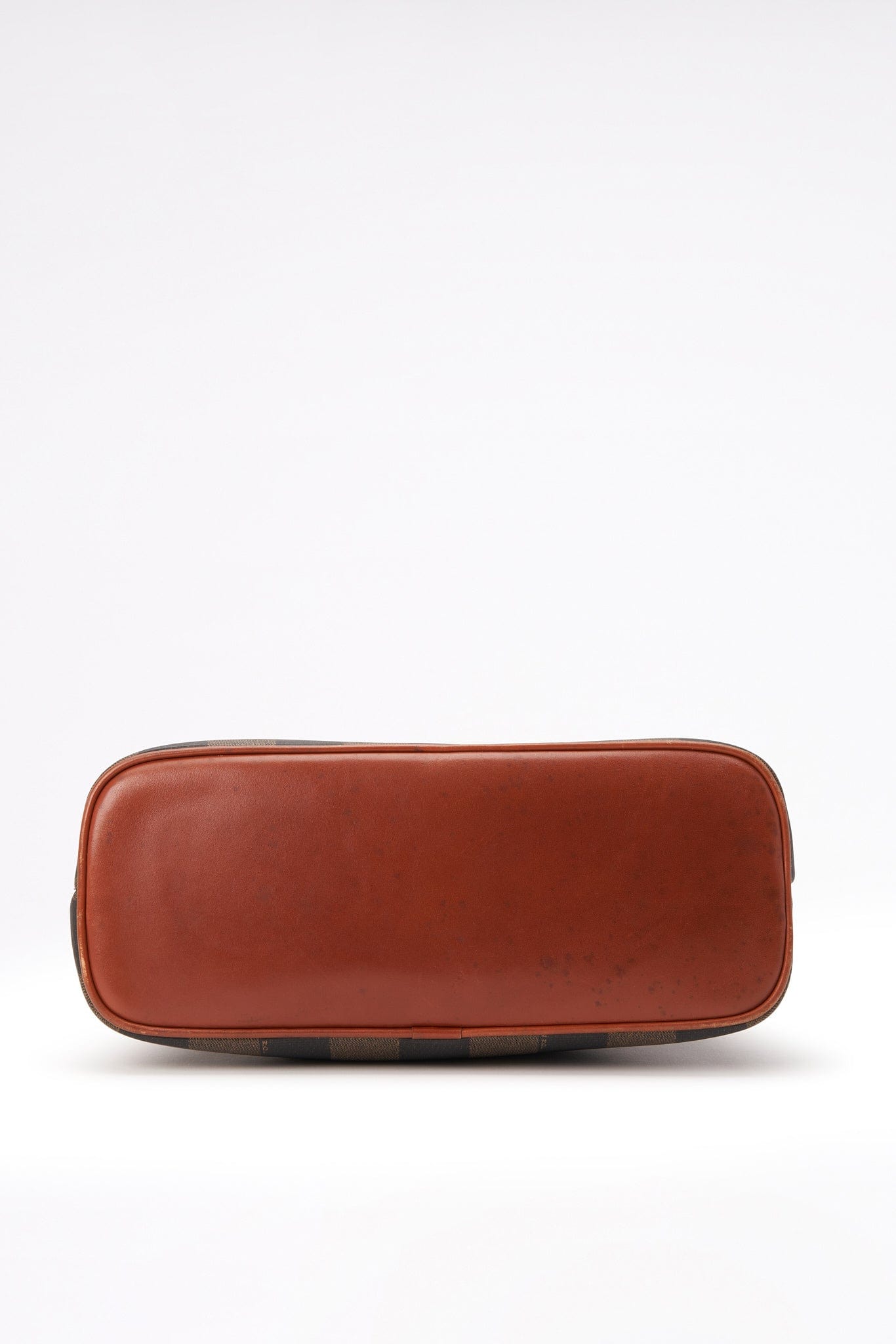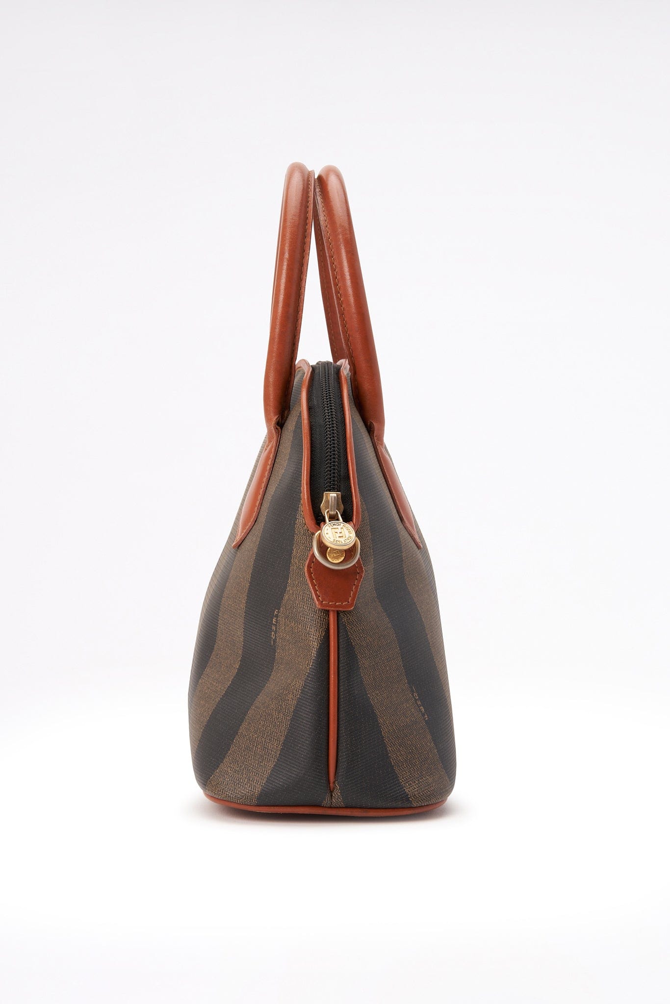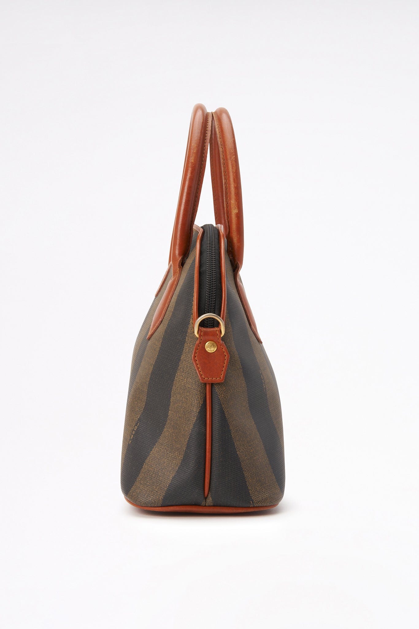 A vintage Fendi bag crafted from a striped coated canvas with tan leather top handles and Fendi branded gold hardware. Comes with a detachable crossbody strap