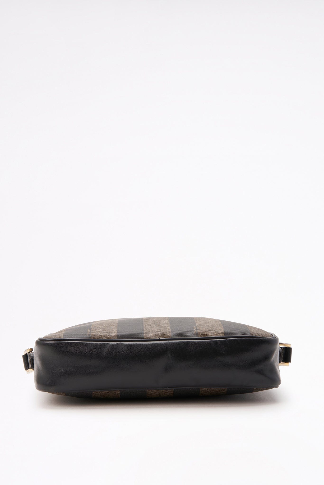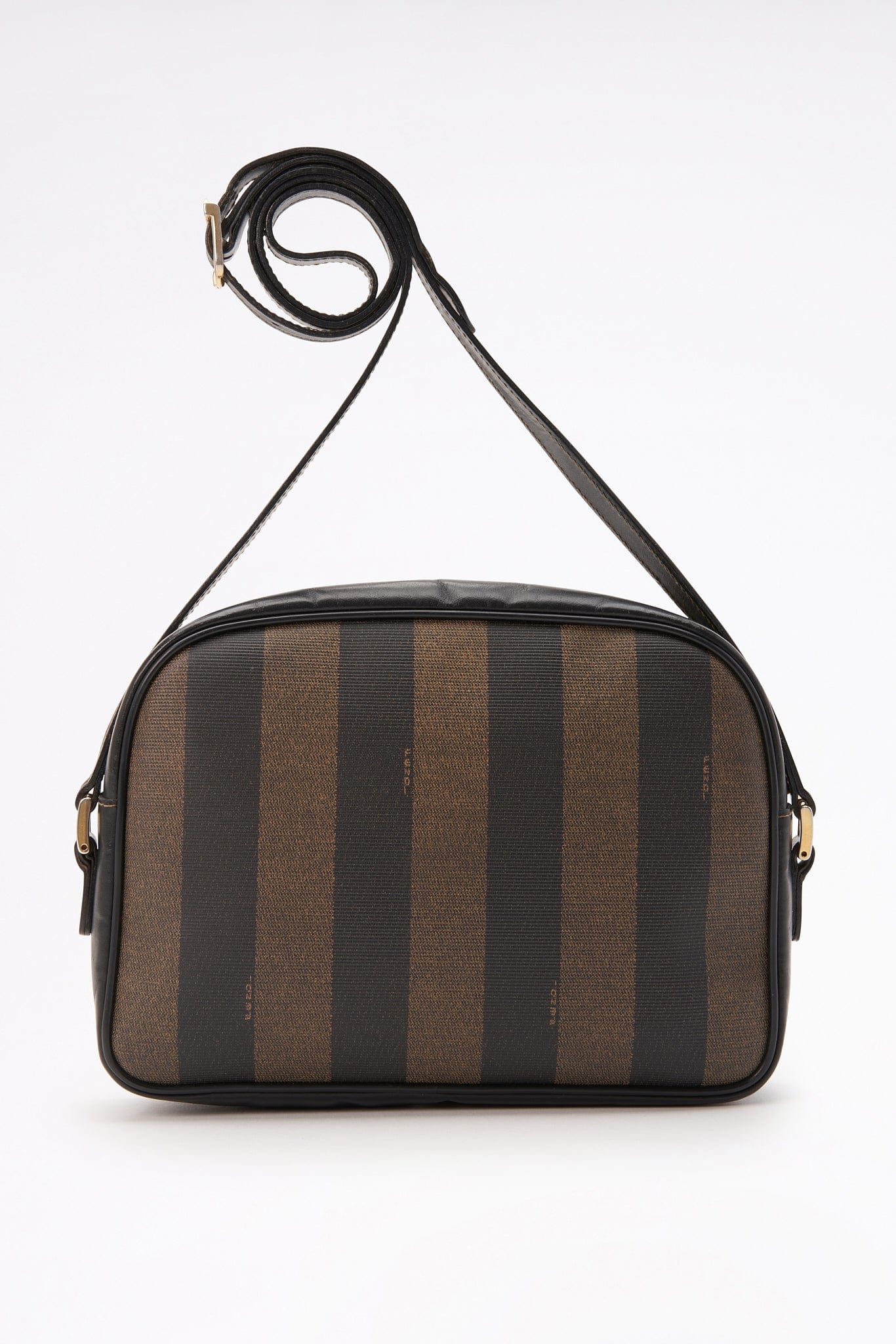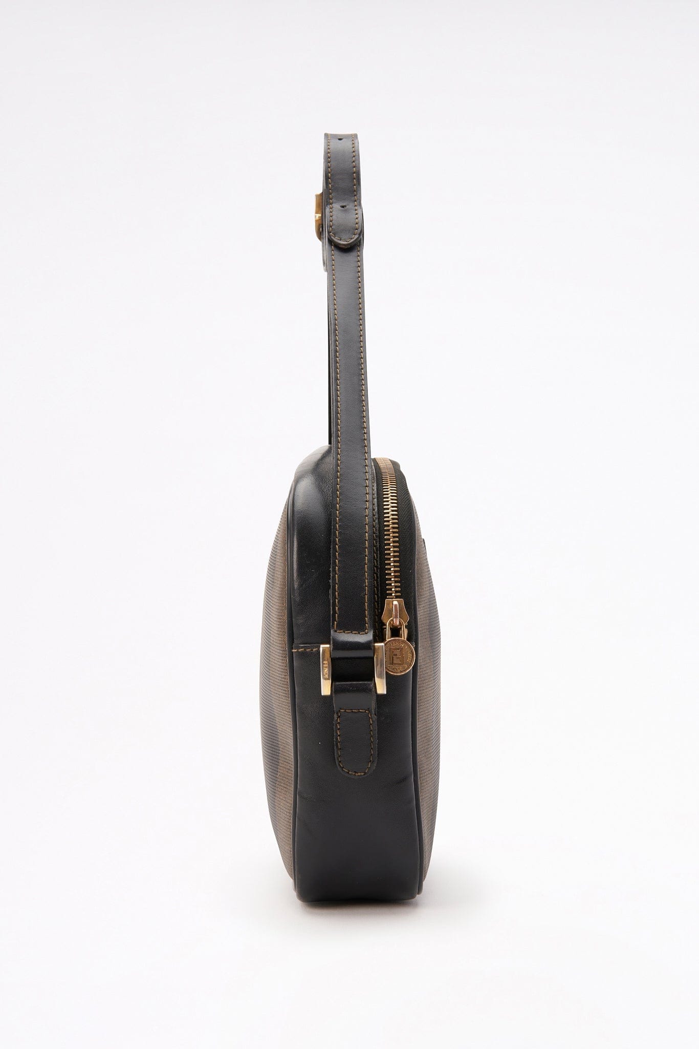 A vintage Fendi bag crafted from a striped coated canvas with black leather shoulder strap and Fendi branded gold hardware.
