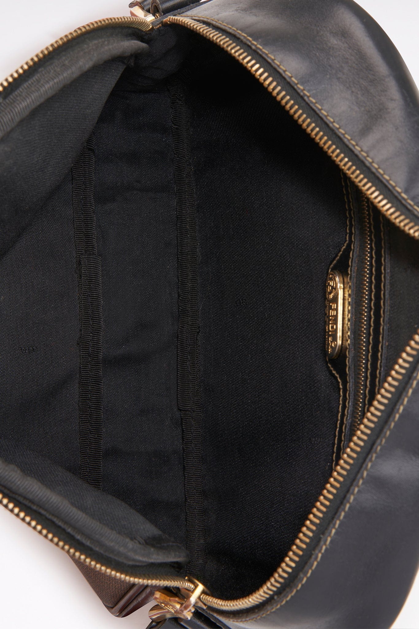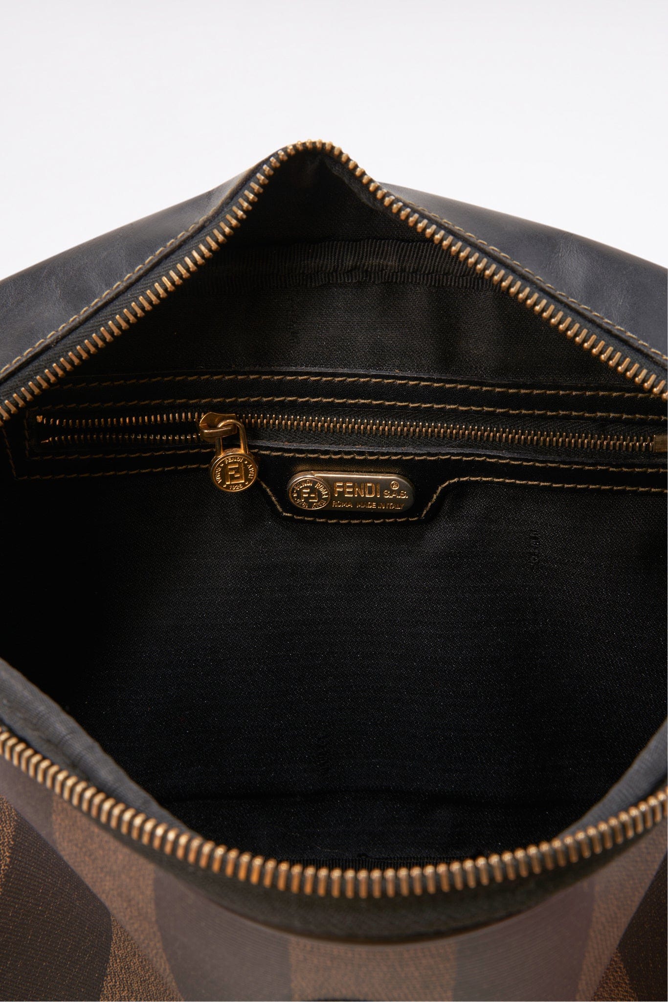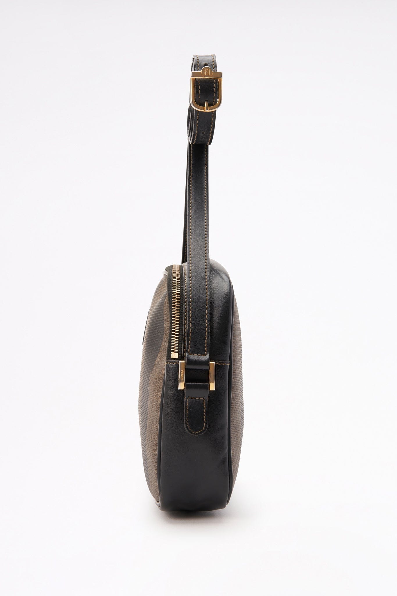 A vintage Fendi bag crafted from a striped coated canvas with black leather shoulder strap and Fendi branded gold hardware.