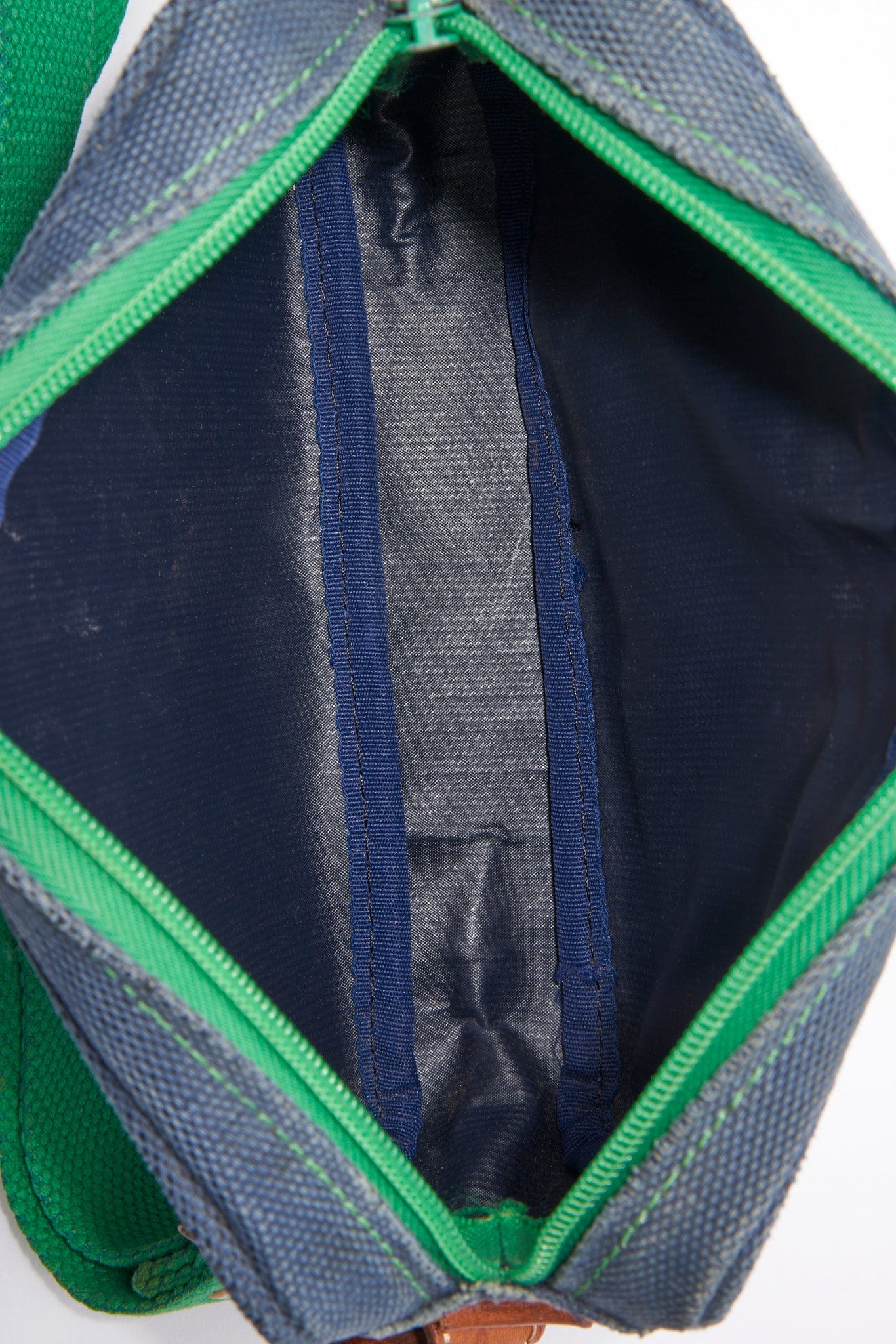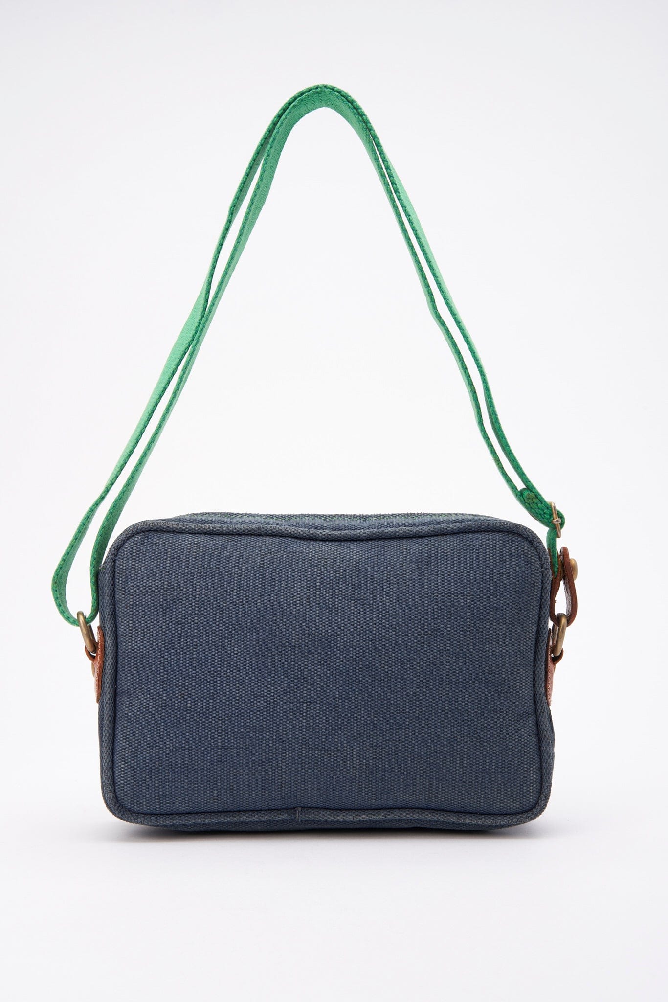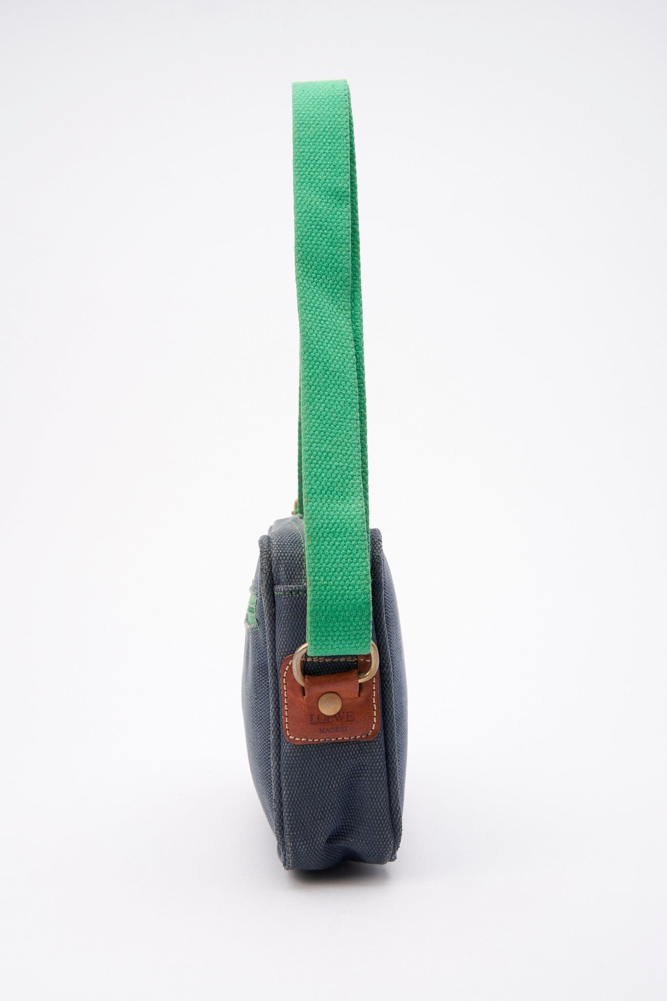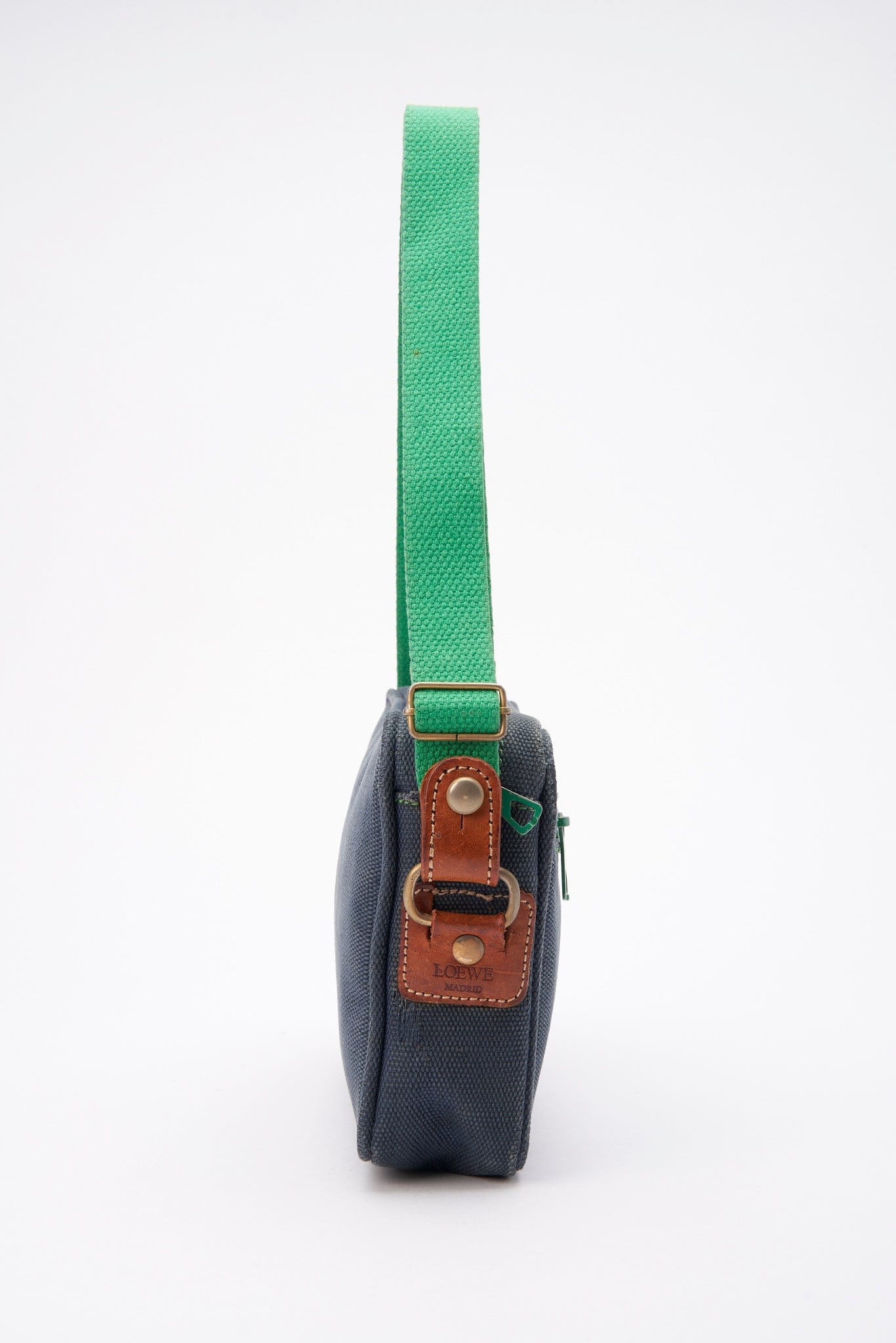 A fun casual Loewe crossbody bag crafted from a navy canvas with the Loewe Anagram printed in green and a green cotton webbing strap.